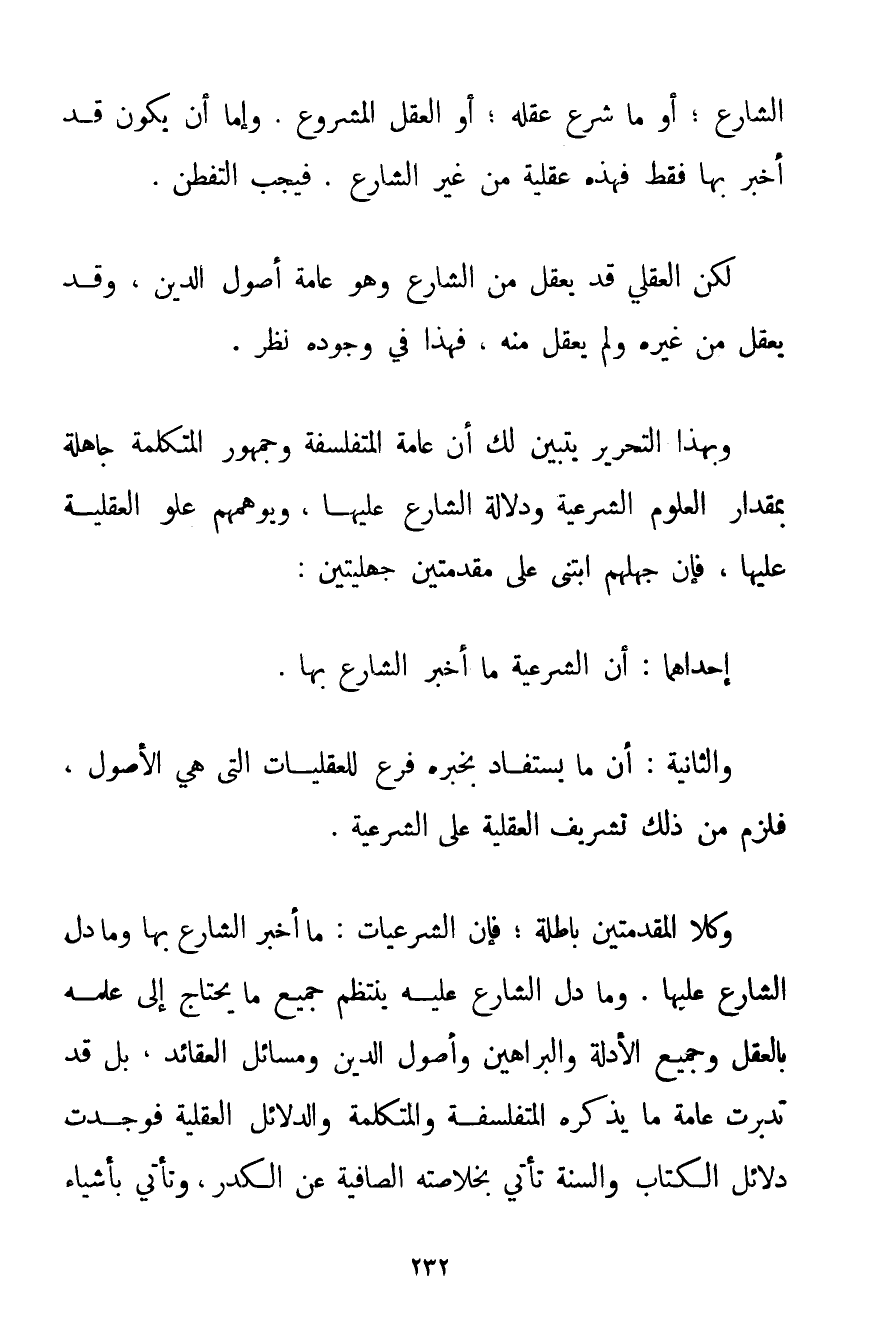 الشَّارِعِ. أَوْ مَا شُرِعَ عَقْلُهُ. أَوْ الْعَقْلُ الْمَشْرُوعُ. وَإِمَّا أَنْ يَكُونَ قَدْ أَخْبَرَ بِهَا فَقَطْ فَهَذِهِ عَقْلِيَّةٌ مِنْ غَيْرِ الشَّارِعِ. فَيَجِبُ التَّفَطُّنُ. لَكِنَّ الْعَقْلِيَّ قَدْ يُعْقَلُ مِنْ الشَّارِعِ وَهُوَ عَامَّةُ أُصُولِ الدِّينِ وَقَدْ يُعْقَلُ مِنْ غَيْرِهِ وَلَمْ يُعْقَلْ مِنْهُ فَهَذَا فِي وُجُودِهِ نَظَرٌ. وَبِهَذَا التَّحْرِيرِ يَتَبَيَّنُ لَك أَنَّ عَامَّةَ الْمُتَفَلْسِفَةِ وَجُمْهُورَ الْمُتَكَلِّمَةِ جَاهِلَةٌ بِمِقْدَارِ الْعُلُومِ الشَّرْعِيَّةِ وَدَلَالَةُ الشَّارِعِ عَلَيْهَا وَيُوهِمُهُمْ عُلُوُّ الْعَقْلِيَّةِ عَلَيْهَا فَإِنَّ جَهْلَهُمْ ابْتَنَى عَلَى مُقَدِّمَتَيْنِ جَاهِلِيَّتَيْنِ: إحْدَاهُمَا: أَنَّ الشَّرْعِيَّةَ مَا أَخْبَرَ الشَّارِعُ بِهَا. وَالثَّانِيَةُ: أَنَّ مَا يُسْتَفَادُ بِخَبَرِهِ فَرْعٌ لِلْعَقْلِيَّاتِ الَّتِي هِيَ الْأُصُولُ فَلَزِمَ مِنْ ذَلِكَ تَشْرِيفُ الْعَقْلِيَّةِ عَلَى الشَّرْعِيَّةِ. وَكِلَا الْمُقَدِّمَتَيْنِ بَاطِلَةٌ؛ فَإِنَّ الشَّرْعِيَّاتِ: مَا أَخْبَرَ الشَّارِعُ بِهَا وَمَا دَلَّ الشَّارِعُ عَلَيْهَا. وَمَا دَلَّ الشَّارِعُ عَلَيْهِ يَنْتَظِمُ جَمِيعَ مَا يَحْتَاجُ إلَى عِلْمِهِ بِالْعَقْلِ وَجَمِيعَ الْأَدِلَّةِ وَالْبَرَاهِينِ وَأُصُولِ الدِّينِ وَمَسَائِلِ الْعَقَائِدِ بَلْ قَدْ تَدَبَّرْت عَامَّةَ مَا يَذْكُرُهُ الْمُتَفَلْسِفَةُ وَالْمُتَكَلِّمَةُ وَالدَّلَائِلُ الْعَقْلِيَّةُ فَوَجَدْت دَلَائِلَ الْكِتَابِ وَالسُّنَّةِ تَأْتِي بِخُلَاصَتِهِ الصَّافِيَةِ عَنْ الْكَدَرِ وَتَأْتِي بِأَشْيَاءَ