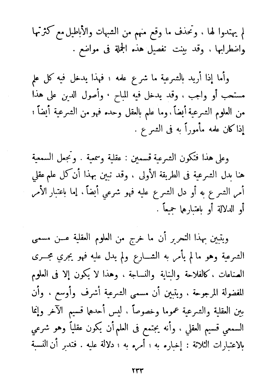لَمْ يَهْتَدُوا لَهَا وَتَحْذِفُ مَا وَقَعَ مِنْهُمْ مِنْ الشُّبُهَاتِ وَالْأَبَاطِيلِ مَعَ كَثْرَتِهَا وَاضْطِرَابِهَا وَقَدْ بَيَّنْت تَفْصِيلَ هَذِهِ الْجُمْلَةِ فِي مَوَاضِعَ. وَأَمَّا إذَا أُرِيدَ بِالشَّرْعِيَّةِ مَا شُرِعَ عِلْمُهُ. فَهَذَا يَدْخُلُ فِيهِ كُلُّ عِلْمٍ مُسْتَحَبٍّ أَوْ وَاجِبٍ وَقَدْ يَدْخُلُ فِيهِ الْمُبَاحُ وَأُصُولُ الدِّينِ عَلَى هَذَا مِنْ الْعُلُومِ الشَّرْعِيَّةِ أَيْضًا وَمَا عُلِمَ بِالْعَقْلِ وَحْدَهُ فَهُوَ مِنْ الشَّرْعِيَّةِ أَيْضًا؛ إذَا كَانَ عِلْمُهُ مَأْمُورًا بِهِ فِي الشَّرْعِ. وَعَلَى هَذَا فَتَكُونُ الشَّرْعِيَّةُ قِسْمَيْنِ: عَقْلِيَّةٌ وَسَمْعِيَّةٌ. وَتُجْعَلُ السَّمْعِيَّةُ هُنَا بَدَلَ الشَّرْعِيَّةِ فِي الطَّرِيقَةِ الْأُولَى وَقَدْ تَبَيَّنَ بِهَذَا أَنَّ كُلَّ عِلْمٍ عَقْلِيٍّ أَمَرَ الشَّرْعُ بِهِ أَوْ دَلَّ الشَّرْعُ عَلَيْهِ فَهُوَ شَرْعِيٌّ أَيْضًا إمَّا بِاعْتِبَارِ الْأَمْرِ أَوْ الدَّلَالَةِ أَوْ بِاعْتِبَارِهِمَا جَمِيعًا. وَيَتَبَيَّنُ بِهَذَا التَّحْرِيرِ أَنَّ مَا خَرَجَ مِنْ الْعُلُومِ الْعَقْلِيَّةِ عَنْ مُسَمَّى الشَّرْعِيَّةِ وَهُوَ مَا لَمْ يَأْمُرْ بِهِ الشَّارِعُ وَلَمْ يَدُلَّ عَلَيْهِ فَهُوَ يَجْرِي مَجْرَى الصِّنَاعَاتِ كَالْفِلَاحَةِ وَالْبِنَايَةِ وَالنِّسَاجَةِ وَهَذَا لَا يَكُونُ إلَّا فِي الْعُلُومِ المفضولة الْمَرْجُوحَةِ وَيَتَبَيَّنُ أَنَّ مُسَمَّى الشَّرْعِيَّةِ أَشْرَفُ وَأَوْسَعُ وَأَنَّ بَيْنَ الْعَقْلِيَّةِ وَالشَّرْعِيَّةِ عُمُومًا وَخُصُوصًا لَيْسَ أَحَدُهُمَا قَسِيمَ الْآخَرِ وَإِنَّمَا السَّمْعِيُّ قَسِيمُ الْعَقْلِيِّ وَأَنَّهُ يَجْتَمِعُ فِي الْعِلْمِ أَنْ يَكُونَ عَقْلِيًّا وَهُوَ شَرْعِيٌّ بِالِاعْتِبَارَاتِ الثَّلَاثَةِ: إخْبَارِهِ بِهِ؛ أَمْرِهِ بِهِ؛ دَلَالَةٍ عَلَيْهِ. فَتَدَبَّرْ أَنَّ النِّسْبَةَ