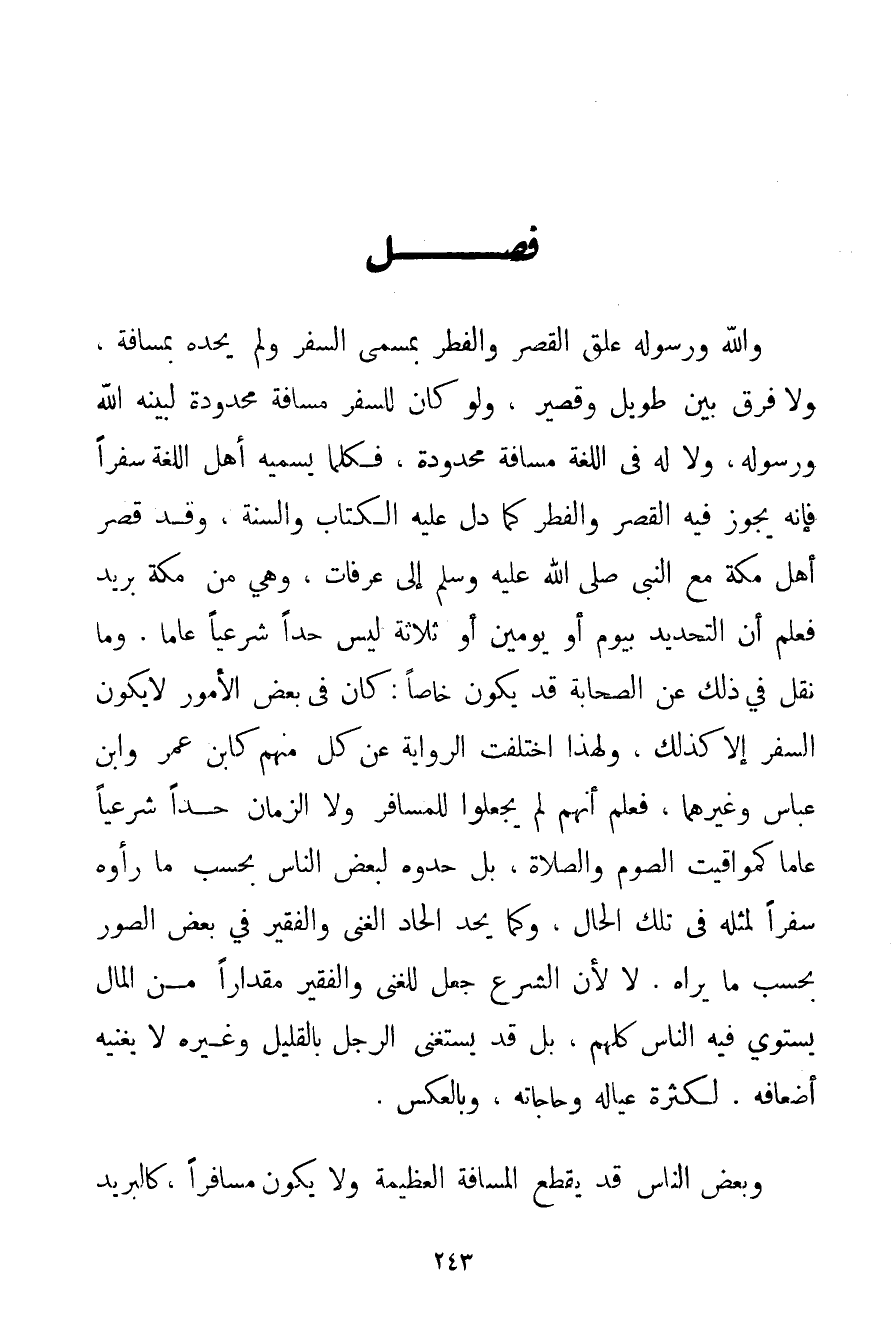 وَاَللَّهُ وَرَسُولُهُ عَلَّقَ الْقَصْرَ وَالْفِطْرَ بِمُسَمَّى السَّفَرِ وَلَمْ يَحُدَّهُ بِمَسَافَةِ وَلَا فَرْقٍ بَيْنَ طَوِيلٍ وَقَصِيرٍ وَلَوْ كَانَ لِلسَّفَرِ مَسَافَةٌ مَحْدُودَةٌ لَبَيَّنَهُ اللَّهُ وَرَسُولُهُ وَلَا لَهُ فِي اللُّغَةِ مَسَافَةٌ مَحْدُودَةٌ فَكُلَّمَا يُسَمِّيهِ أَهْلُ اللُّغَةِ سَفَرًا فَإِنَّهُ يَجُوزُ فِيهِ الْقَصْرُ وَالْفِطْرُ كَمَا دَلَّ عَلَيْهِ الْكِتَابُ وَالسُّنَّةُ وَقَدْ قَصَرَ أَهْلُ مَكَّةَ مَعَ النَّبِيِّ صَلَّى اللَّهُ عَلَيْهِ وَسَلَّمَ إلَى عَرَفَاتٍ وَهِيَ مِنْ مَكَّةَ بَرِيدٌ فَعُلِمَ أَنَّ التَّحْدِيدَ بِيَوْمٍ أَوْ يَوْمَيْنِ أَوْ ثَلَاثَةٍ لَيْسَ حَدًّا شَرْعِيًّا عَامًّا. وَمَا نُقِلَ فِي ذَلِكَ عَنْ الصَّحَابَةِ قَدْ يَكُونُ خَاصًّا: كَانَ فِي بَعْضِ الْأُمُورِ لَا يَكُونُ السَّفَرُ إلَّا كَذَلِكَ وَلِهَذَا اخْتَلَفَتْ الرِّوَايَةُ عَنْ كُلٍّ مِنْهُمْ كَابْنِ عُمَرَ وَابْنِ عَبَّاسٍ وَغَيْرِهِمَا فَعُلِمَ أَنَّهُمْ لَمْ يَجْعَلُوا لِلْمُسَافِرِ. وَلَا الزَّمَانِ حَدًّا شَرْعِيًّا عَامًّا كَمَوَاقِيتِ الصَّوْمِ وَالصَّلَاةِ بَلْ حَدُّوهُ لِبَعْضِ النَّاسِ بِحَسَبِ مَا رَأَوْهُ سَفَرًا لِمِثْلِهِ فِي تِلْكَ الْحَالِ وَكَمَا يَحُدُّ إلْحَادَ الْغَنِيِّ وَالْفَقِيرِ فِي بَعْضِ الصُّوَرِ بِحَسَبِ مَا يَرَاهُ. لَا لِأَنَّ الشَّرْعَ جَعَلَ لِلْغَنِيِّ وَالْفَقِيرِ مِقْدَارًا مِنْ الْمَالِ يَسْتَوِي فِيهِ النَّاسُ كُلُّهُمْ بَلْ قَدْ يَسْتَغْنِي الرَّجُلُ بِالْقَلِيلِ وَغَيْرُهُ لَا يُغْنِيهِ أَضْعَافُهُ: لِكَثْرَةِ عِيَالِهِ وَحَاجَاتِهِ وَبِالْعَكْسِ. وَبَعْضُ النَّاسِ قَدْ يَقْطَعُ الْمَسَافَةَ الْعَظِيمَةَ وَلَا يَكُونُ مُسَافِرًا كَالْبَرِيدِ