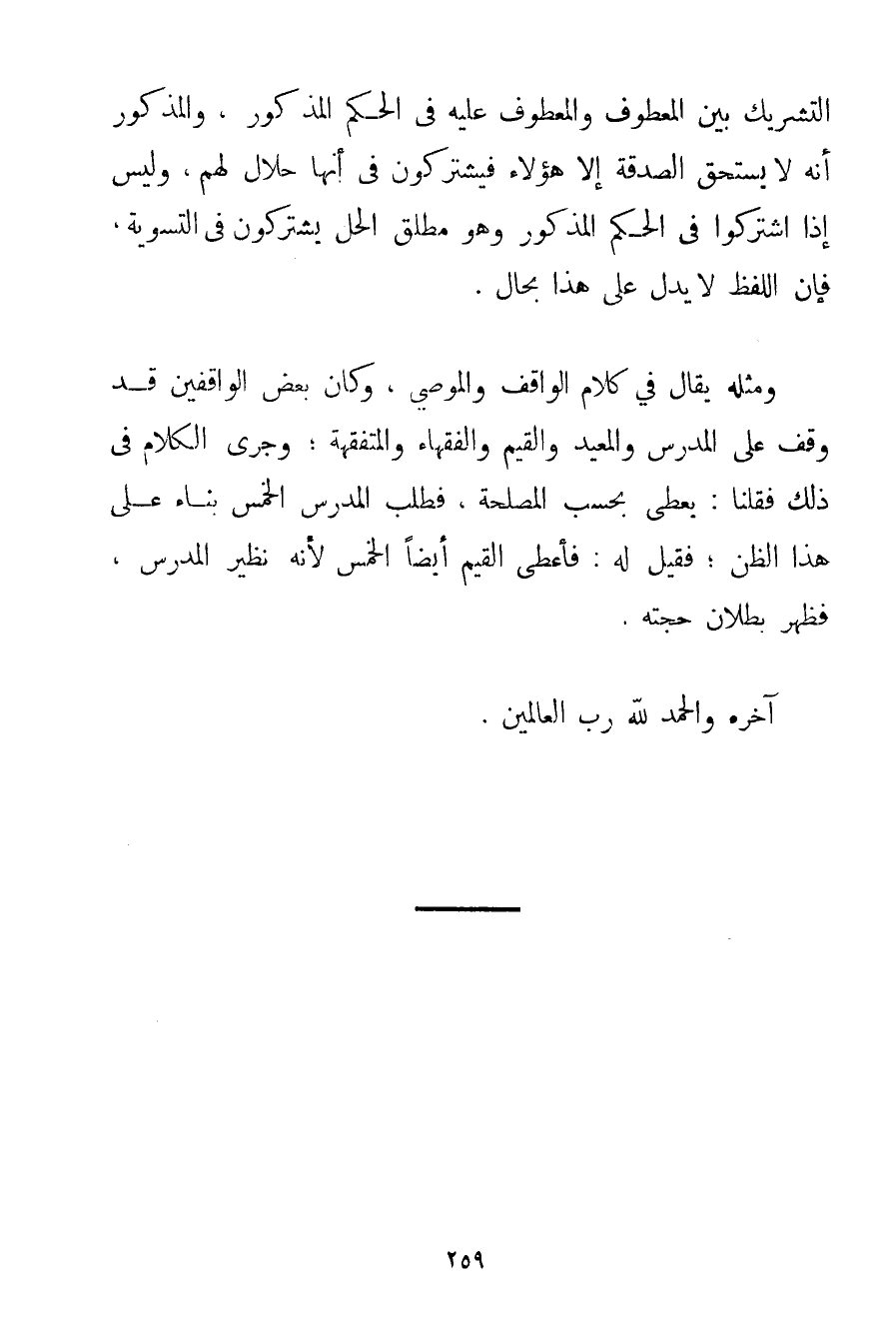 التَّشْرِيكَ بَيْنَ الْمَعْطُوفِ وَالْمَعْطُوفِ عَلَيْهِ فِي الْحُكْمِ الْمَذْكُورِ وَالْمَذْكُورُ أَنَّهُ لَا يَسْتَحِقُّ الصَّدَقَةَ إلَّا هَؤُلَاءِ فَيَشْتَرِكُونَ فِي أَنَّهَا حَلَالٌ لَهُمْ وَلَيْسَ إذَا اشْتَرَكُوا فِي الْحُكْمِ الْمَذْكُورِ وَهُوَ مُطْلَقُ الْحَلِّ يَشْتَرِكُونَ فِي التَّسْوِيَةِ فَإِنَّ اللَّفْظَ لَا يَدُلُّ عَلَى هَذَا بِحَالِ. وَمِثْلُهُ يُقَالُ فِي كَلَامِ الْوَاقِفِ وَالْمُوصِي وَكَانَ بَعْضُ الْوَاقِفِينَ قَدْ وَقَفَ عَلَى الْمُدَرِّسِ وَالْمُعِيدِ وَالْقَيِّمِ وَالْفُقَهَاءِ وَالْمُتَفَقِّهَةِ؛ وَجَرَى الْكَلَامُ فِي ذَلِكَ فَقُلْنَا: يُعْطِي بِحَسَبِ الْمَصْلَحَةِ فَطَلَبَ الْمُدَرِّسُ الْخُمُسَ بِنَاءً عَلَى هَذَا الظَّنِّ؛ فَقِيلَ لَهُ: فَأَعْطِي الْقَيِّمَ أَيْضًا الْخُمُسَ لِأَنَّهُ نَظِيرُ الْمُدَرِّسِ فَظَهَرَ بُطْلَانُ حُجَّتِهِ. آخِرُهُ وَالْحَمْدُ لِلَّهِ رَبِّ الْعَالَمِينَ.