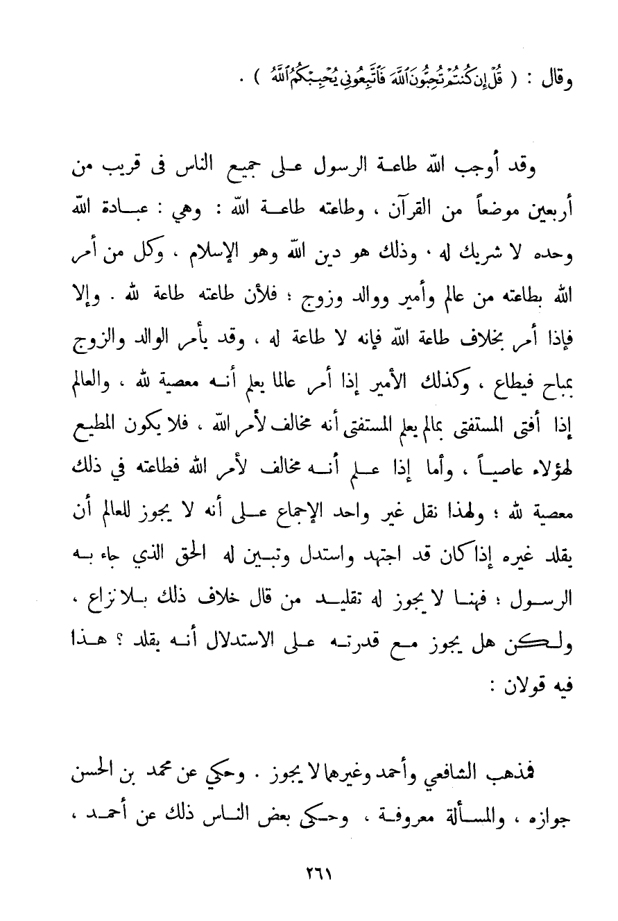أَوْ يُصِيبَهُمْ عَذَابٌ أَلِيمٌ} وَقَالَ: {قُلْ إنْ كُنْتُمْ تُحِبُّونَ اللَّهَ فَاتَّبِعُونِي يُحْبِبْكُمُ اللَّهُ} . وَقَدْ أَوْجَبَ اللَّهُ طَاعَةَ الرَّسُولِ عَلَى جَمِيعِ النَّاسِ فِي قَرِيبٍ مِنْ أَرْبَعِينَ مَوْضِعًا مِنْ الْقُرْآنِ وَطَاعَتُهُ طَاعَةُ اللَّهِ: وَهِيَ: عِبَادَةُ اللَّهِ وَحْدَهُ لَا شَرِيكَ لَهُ وَذَلِكَ هُوَ دِينُ اللَّهِ وَهُوَ الْإِسْلَامُ وَكُلُّ مَنْ أَمَرَ اللَّهُ بِطَاعَتِهِ مِنْ عَالِمٍ وَأَمِيرٍ وَوَالِدٍ وَزَوْجٍ؛ فَلِأَنَّ طَاعَتَهُ طَاعَةٌ لِلَّهِ. وَإِلَّا فَإِذَا أَمَرَ بِخِلَافِ طَاعَةِ اللَّهِ فَإِنَّهُ لَا طَاعَةَ لَهُ وَقَدْ يَأْمُرُ الْوَالِدُ وَالزَّوْجُ بِمُبَاحٍ فَيُطَاعَ وَكَذَلِكَ الْأَمِيرُ إذَا أَمَرَ عَالِمًا يَعْلَمُ أَنَّهُ مَعْصِيَةٌ لِلَّهِ وَالْعَالِمُ إذَا أَفْتَى الْمُسْتَفْتِيَ بِمَا لَمْ يَعْلَمْ الْمُسْتَفْتِي أَنَّهُ مُخَالِفٌ لِأَمْرِ اللَّهِ فَلَا يَكُونُ الْمُطِيعُ لِهَؤُلَاءِ عَاصِيًا وَأَمَّا إذَا عَلِمَ أَنَّهُ مُخَالِفٌ لِأَمْرِ اللَّهِ فَطَاعَتُهُ فِي ذَلِكَ مَعْصِيَةٌ لِلَّهِ؛ وَلِهَذَا نَقَلَ غَيْرُ وَاحِدٍ الْإِجْمَاعَ عَلَى أَنَّهُ لَا يَجُوزُ لِلْعَالِمِ أَنْ يُقَلِّدَ غَيْرَهُ إذَا كَانَ قَدْ اجْتَهَدَ وَاسْتَدَلَّ وَتَبَيَّنَ لَهُ الْحَقُّ الَّذِي جَاءَ بِهِ الرَّسُولُ؛ فَهُنَا لَا يَجُوزُ لَهُ تَقْلِيدُ مَنْ قَالَ خِلَافَ ذَلِكَ بِلَا نِزَاعٍ وَلَكِنْ هَلْ يَجُوزُ مَعَ قُدْرَتِهِ عَلَى الِاسْتِدْلَالِ أَنَّهُ يُقَلِّدُ؟ هَذَا فِيهِ قَوْلَانِ: فَمَذْهَبُ الشَّافِعِيِّ وَأَحْمَد وَغَيْرِهِمَا لَا يَجُوزُ. وَحُكِيَ عَنْ مُحَمَّدِ بْنِ الْحَسَنِ جَوَازُهُ وَالْمَسْأَلَةُ مَعْرُوفَةٌ وَحَكَى بَعْضُ النَّاسِ ذَلِكَ عَنْ أَحْمَد