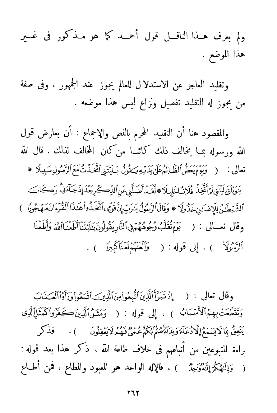 وَالْمَقْصُودُ هُنَا أَنَّ التَّقْلِيدَ الْمُحَرَّمَ بِالنَّصِّ وَالْإِجْمَاعِ: أَنْ يُعَارِضَ قَوْلَ اللَّهِ وَرَسُولِهِ بِمَا يُخَالِفُ ذَلِكَ كَائِنًا مَنْ كَانَ الْمُخَالِفُ لِذَلِكَ. قَالَ اللَّهُ تَعَالَى: {وَيَوْمَ يَعَضُّ الظَّالِمُ عَلَى يَدَيْهِ يَقُولُ يَا لَيْتَنِي اتَّخَذْتُ مَعَ الرَّسُولِ سَبِيلًا} {يَا وَيْلَتَى لَيْتَنِي لَمْ أَتَّخِذْ فُلَانًا خَلِيلًا} {لَقَدْ أَضَلَّنِي عَنِ الذِّكْرِ بَعْدَ إذْ جَاءَنِي وَكَانَ الشَّيْطَانُ لِلْإِنْسَانِ خَذُولًا} {وَقَالَ الرَّسُولُ يَا رَبِّ إنَّ قَوْمِي اتَّخَذُوا هَذَا الْقُرْآنَ مَهْجُورًا} وَقَالَ تَعَالَى: {يَوْمَ تُقَلَّبُ وُجُوهُهُمْ فِي النَّارِ يَقُولُونَ يَا لَيْتَنَا أَطَعْنَا اللَّهَ وَأَطَعْنَا الرَّسُولَا} إلَى قَوْلِهِ: {وَالْعَنْهُمْ لَعْنًا كَبِيرًا} . وَقَالَ تَعَالَى: {إذْ تَبَرَّأَ الَّذِينَ اتُّبِعُوا مِنَ الَّذِينَ اتَّبَعُوا وَرَأَوُا الْعَذَابَ وَتَقَطَّعَتْ بِهِمُ الْأَسْبَابُ} إلَى قَوْلِهِ: {وَمَثَلُ الَّذِينَ كَفَرُوا كَمَثَلِ الَّذِي يَنْعِقُ بِمَا لَا يَسْمَعُ إلَّا دُعَاءً وَنِدَاءً صُمٌّ بُكْمٌ عُمْيٌ فَهُمْ لَا يَعْقِلُونَ} فَذَكَرَ بَرَاءَةَ الْمَتْبُوعِينَ مِنْ أَتْبَاعِهِمْ فِي خِلَافِ طَاعَةِ اللَّهِ ذَكَرَ هَذَا بَعْدَ قَوْلِهِ: {وَإِلَهُكُمْ إلَهٌ وَاحِدٌ} فَالْإِلَهُ الْوَاحِدُ هُوَ الْمَعْبُودُ وَالْمُطَاعُ فَمَنْ أَطَاعَ