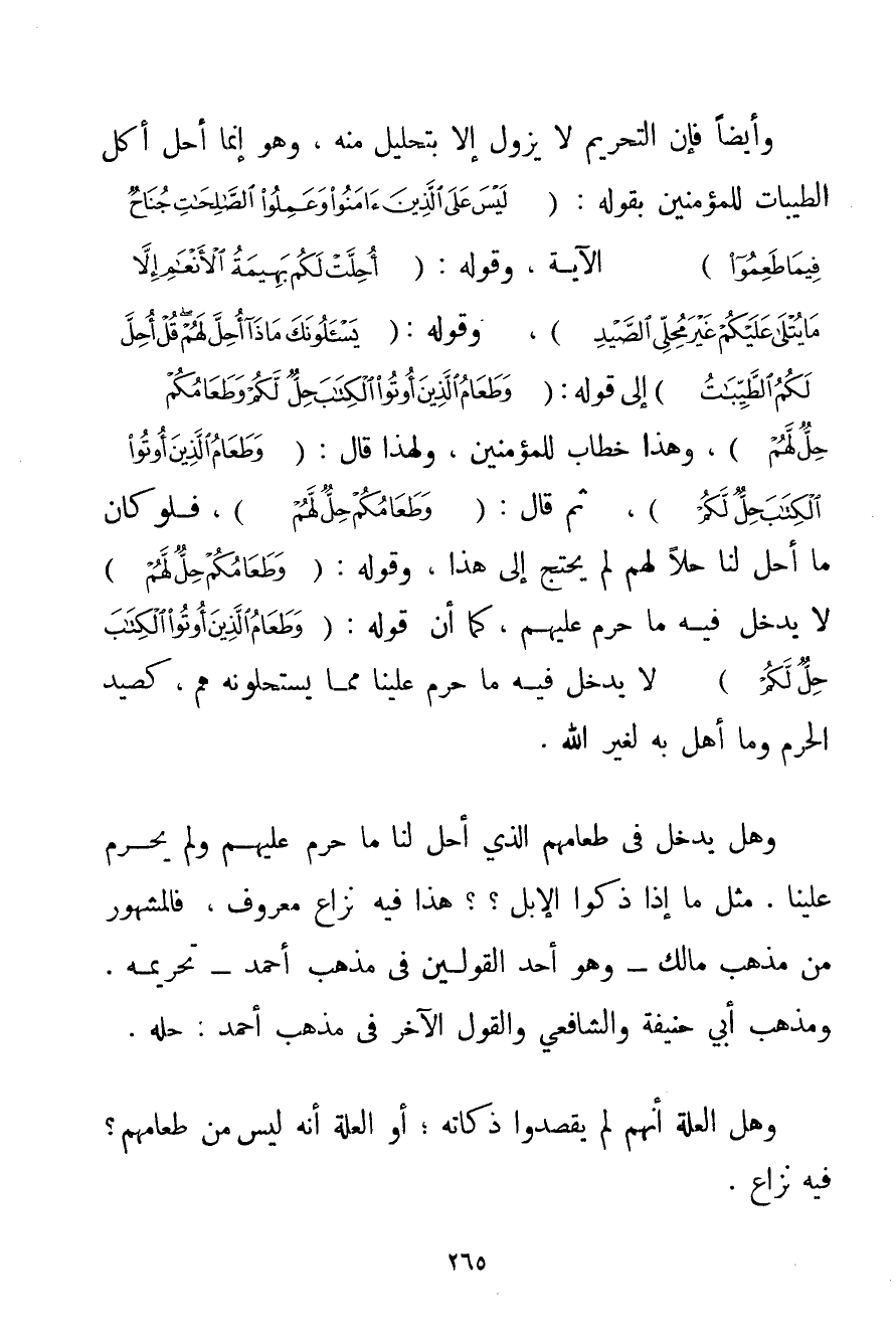 وَأَيْضًا فَإِنَّ التَّحْرِيمَ لَا يَزُولُ إلَّا بِتَحْلِيلٍ مِنْهُ وَهُوَ إنَّمَا أَحَلَّ أَكْلَ الطَّيِّبَاتِ لِلْمُؤْمِنِينَ بِقَوْلِهِ: {لَيْسَ عَلَى الَّذِينَ آمَنُوا وَعَمِلُوا الصَّالِحَاتِ جُنَاحٌ فِيمَا طَعِمُوا} الْآيَةَ وَقَوْلِهِ: {أُحِلَّتْ لَكُمْ بَهِيمَةُ الْأَنْعَامِ إلَّا مَا يُتْلَى عَلَيْكُمْ غَيْرَ مُحِلِّي الصَّيْدِ} وَقَوْلِهِ: {يَسْأَلُونَكَ مَاذَا أُحِلَّ لَهُمْ قُلْ أُحِلَّ لَكُمُ الطَّيِّبَاتُ} إلَى قَوْلِهِ: {وَطَعَامُ الَّذِينَ أُوتُوا الْكِتَابَ حِلٌّ لَكُمْ وَطَعَامُكُمْ حِلٌّ لَهُمْ} وَهَذَا خِطَابٌ لِلْمُؤْمِنِينَ وَلِهَذَا قَالَ: {وَطَعَامُ الَّذِينَ أُوتُوا الْكِتَابَ حِلٌّ لَكُمْ} ثُمَّ قَالَ: {وَطَعَامُكُمْ حِلٌّ لَهُمْ} فَلَوْ كَانَ مَا أُحِلَّ لَنَا حِلًّا لَهُمْ لَمْ يَحْتَجْ إلَى هَذَا وَقَوْلُهُ: {وَطَعَامُكُمْ حِلٌّ لَهُمْ} لَا يَدْخُلُ فِيهِ مَا حُرِّمَ عَلَيْهِمْ كَمَا أَنَّ قَوْلَهُ: {وَطَعَامُ الَّذِينَ أُوتُوا الْكِتَابَ حِلٌّ لَكُمْ} لَا يَدْخُلُ فِيهِ مَا حُرِّمَ عَلَيْنَا مِمَّا يَسْتَحِلُّونَهُ هُمْ كَصَيْدِ الْحَرَمِ وَمَا أُهِلَّ بِهِ لِغَيْرِ اللَّهِ. وَهَلْ يَدْخُلُ فِي طَعَامِهِمْ الَّذِي أُحِلَّ لَنَا مَا حُرِّمَ عَلَيْهِمْ وَلَمْ يُحَرِّمْ عَلَيْنَا. مِثْلَ مَا إذَا ذَكَّوْا الْإِبِلَ؟ ؟ هَذَا فِيهِ نِزَاعٌ مَعْرُوفٌ فَالْمَشْهُورُ مِنْ مَذْهَبِ مَالِكٍ - وَهُوَ أَحَدُ الْقَوْلَيْنِ فِي مَذْهَبِ أَحْمَد - تَحْرِيمُهُ. وَمَذْهَبُ أَبِي حَنِيفَةَ وَالشَّافِعِيِّ وَالْقَوْلُ الْآخَرُ فِي مَذْهَبِ أَحْمَد: حِلُّهُ. وَهَلْ الْعِلَّةُ أَنَّهُمْ لَمْ يَقْصِدُوا ذَكَاتَهُ؛ أَوْ الْعِلَّةُ أَنَّهُ لَيْسَ مِنْ طَعَامِهِمْ؟ فِيهِ نِزَاعٌ.