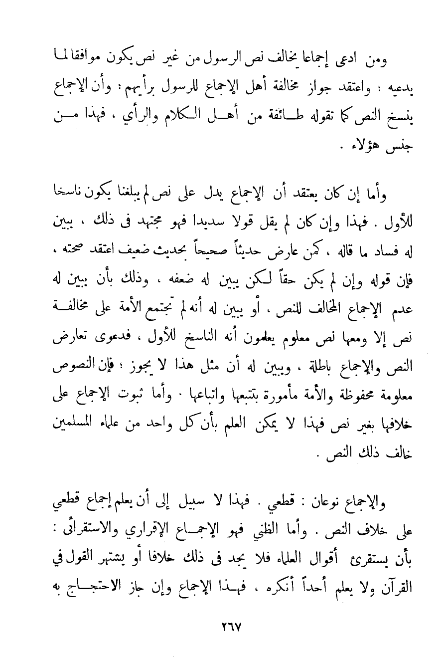 وَمَنْ ادَّعَى إجْمَاعًا يُخَالِفُ نَصَّ الرَّسُولِ مِنْ غَيْرِ نَصٍّ يَكُونُ مُوَافِقًا لِمَا يَدَّعِيه؛ وَاعْتَقَدَ جَوَازَ مُخَالَفَةِ أَهْلِ الْإِجْمَاعِ لِلرَّسُولِ بِرَأْيِهِمْ؛ وَأَنَّ الْإِجْمَاعَ يَنْسَخُ النَّصَّ كَمَا تَقُولُهُ طَائِفَةٌ مِنْ أَهْلِ الْكَلَامِ وَالرَّأْيِ فَهَذَا مِنْ جِنْسِ هَؤُلَاءِ. وَأَمَّا إنْ كَانَ يَعْتَقِدُ أَنَّ الْإِجْمَاعَ يَدُلُّ عَلَى نَصٍّ لَمْ يَبْلُغْنَا يَكُونُ نَاسِخًا لِلْأَوَّلِ. فَهَذَا وَإِنْ كَانَ لَمْ يَقُلْ قَوْلًا سَدِيدًا فَهُوَ مُجْتَهِدٌ فِي ذَلِكَ يُبَيِّنُ لَهُ فَسَادَ مَا قَالَهُ كَمَنْ عَارَضَ حَدِيثًا صَحِيحًا بِحَدِيثٍ ضَعِيفٍ اعْتَقَدَ صِحَّتَهُ فَإِنَّ قَوْلَهُ وَإِنْ لَمْ يَكُنْ حَقًّا لَكِنْ يُبَيِّنُ لَهُ ضَعْفَهُ وَذَلِكَ بِأَنْ يُبَيِّنَ لَهُ عَدَمَ الْإِجْمَاعِ الْمُخَالِفِ لِلنَّصِّ أَوْ يُبَيِّنَ لَهُ أَنَّهُ لَمْ تَجْتَمِعْ الْأُمَّةُ عَلَى مُخَالَفَةِ نَصٍّ إلَّا وَمَعَهَا نَصٌّ مَعْلُومٌ يَعْلَمُونَ أَنَّهُ النَّاسِخُ لِلْأَوَّلِ فَدَعْوَى تَعَارُضِ النَّصِّ وَالْإِجْمَاعِ بَاطِلَةٌ وَيُبَيِّنُ لَهُ أَنَّ مِثْلَ هَذَا لَا يَجُوزُ؛ فَإِنَّ النُّصُوصَ مَعْلُومَةٌ مَحْفُوظَةٌ وَالْأُمَّةُ مَأْمُورَةٌ بِتَتَبُّعِهَا وَاتِّبَاعِهَا وَأَمَّا ثُبُوتُ الْإِجْمَاعِ عَلَى خِلَافِهَا بِغَيْرِ نَصٍّ فَهَذَا لَا يُمْكِنُ الْعِلْمُ بِأَنَّ كُلَّ وَاحِدٍ مِنْ عُلَمَاءِ الْمُسْلِمِينَ خَالَفَ ذَلِكَ النَّصَّ. وَالْإِجْمَاعُ نَوْعَانِ: قَطْعِيٌّ. فَهَذَا لَا سَبِيلَ إلَى أَنْ يُعْلَمَ إجْمَاعٌ قَطْعِيٌّ عَلَى خِلَافِ النَّصِّ. وَأَمَّا الظَّنِّيُّ فَهُوَ الْإِجْمَاعُ الإقراري والاستقرائي: بِأَنْ يَسْتَقْرِئَ أَقْوَالَ الْعُلَمَاءِ فَلَا يَجِدُ فِي ذَلِكَ خِلَافًا أَوْ يَشْتَهِرُ الْقَوْلُ فِي الْقُرْآنِ وَلَا يَعْلَمُ أَحَدًا أَنْكَرَهُ فَهَذَا الْإِجْمَاعُ وَإِنْ جَازَ الِاحْتِجَاجُ بِهِ