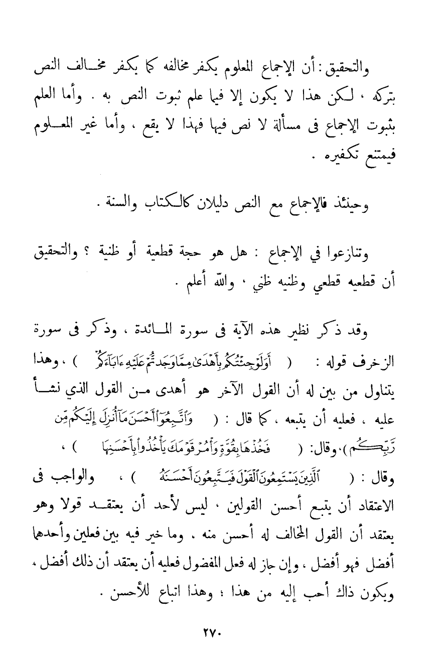 وَتَنَازَعُوا فِي الْإِجْمَاعِ: هَلْ هُوَ حُجَّةٌ قَطْعِيَّةٌ أَوْ ظَنِّيَّةٌ؟ وَالتَّحْقِيقُ أَنَّ قَطْعِيَّهُ قَطْعِيٌّ وَظَنِّيَّهُ ظَنِّيٌّ وَاَللَّهُ أَعْلَمُ. وَقَدْ ذُكِرَ نَظِيرُ هَذِهِ الْآيَةِ فِي سُورَةِ الْمَائِدَةِ وَذُكِرَ فِي سُورَةِ الزُّخْرُفِ قَوْلُهُ: {أَوَلَوْ جِئْتُكُمْ بِأَهْدَى مِمَّا وَجَدْتُمْ عَلَيْهِ آبَاءَكُمْ} وَهَذَا يَتَنَاوَلُ مَنْ بَيَّنَ لَهُ أَنَّ الْقَوْلَ الْآخَرَ هُوَ أَهْدَى مِنْ الْقَوْلِ الَّذِي نَشَأَ عَلَيْهِ فَعَلَيْهِ أَنْ يَتَّبِعَهُ كَمَا قَالَ: {وَاتَّبِعُوا أَحْسَنَ مَا أُنْزِلَ إلَيْكُمْ مِنْ رَبِّكُمْ} وَقَالَ: {فَخُذْهَا بِقُوَّةٍ وَأْمُرْ قَوْمَكَ يَأْخُذُوا بِأَحْسَنِهَا} وَقَالَ: {الَّذِينَ يَسْتَمِعُونَ الْقَوْلَ فَيَتَّبِعُونَ أَحْسَنَهُ} وَالْوَاجِبُ فِي الِاعْتِقَادِ أَنْ يَتَّبِعَ أَحْسَنَ الْقَوْلَيْنِ لَيْسَ لِأَحَدٍ أَنْ يَعْتَقِدَ قَوْلًا وَهُوَ يَعْتَقِدُ أَنَّ الْقَوْلَ الْمُخَالِفَ لَهُ أَحْسَنُ مِنْهُ وَمَا خُيِّرَ فِيهِ بَيْنَ فِعْلَيْنِ وَأَحَدِهِمَا أَفْضَلُ فَهُوَ أَفَضْلُ وَإِنْ جَازَ لَهُ فِعْلُ الْمَفْضُولِ فَعَلَيْهِ أَنْ يَعْتَقِدَ أَنَّ ذَلِكَ أَفْضَلُ وَيَكُونُ ذَاكَ أَحَبَّ إلَيْهِ مِنْ هَذَا؛ وَهَذَا اتِّبَاعٌ لِلْأَحْسَنِ.