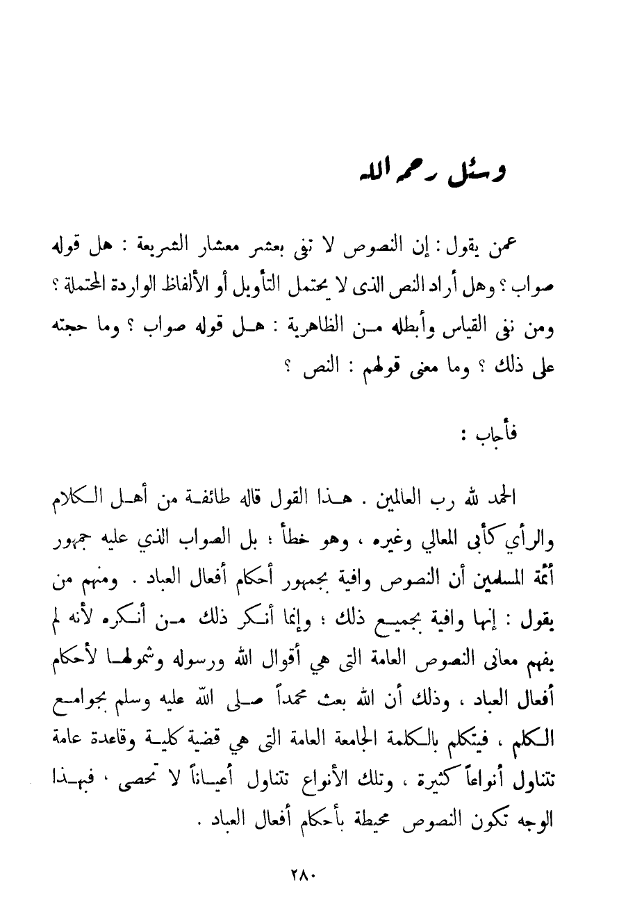 الْحَمْدُ لِلَّهِ رَبِّ الْعَالَمِينَ، هَذَا الْقَوْلُ قَالَهُ طَائِفَةٌ مِنْ أَهْلِ الْكَلَامِ وَالرَّأْيِ كَأَبِي الْمَعَالِي وَغَيْرِهِ وَهُوَ خَطَأٌ؛ بَلْ الصَّوَابُ الَّذِي عَلَيْهِ جُمْهُورُ أَئِمَّةِ الْمُسْلِمِينَ أَنَّ النُّصُوصَ وَافِيَةٌ بِجُمْهُورِ أَحْكَامِ أَفْعَالِ الْعِبَادِ. وَمِنْهُمْ مَنْ يَقُولُ: إنَّهَا وَافِيَةٌ بِجَمِيعِ ذَلِكَ؛ وَإِنَّمَا أَنْكَرَ ذَلِكَ مَنْ أَنْكَرَهُ لِأَنَّهُ لَمْ يَفْهَمْ مَعَانِيَ النُّصُوصِ الْعَامَّةِ الَّتِي هِيَ أَقْوَالُ اللَّهِ وَرَسُولِهِ وَشُمُولُهَا لِأَحْكَامِ أَفْعَالِ الْعِبَادِ وَذَلِكَ أَنَّ اللَّهَ بَعَثَ مُحَمَّدًا صَلَّى اللَّهُ عَلَيْهِ وَسَلَّمَ بِجَوَامِعِ الْكَلِمِ فَيَتَكَلَّمُ بِالْكَلِمَةِ الْجَامِعَةِ الْعَامَّةِ الَّتِي هِيَ قَضِيَّةٌ كُلِّيَّةٌ وَقَاعِدَةٌ عَامَّةٌ تَتَنَاوَلُ أَنْوَاعًا كَثِيرَةً وَتِلْكَ الْأَنْوَاعُ تَتَنَاوَلُ أَعْيَانًا لَا تُحْصَى فَبِهَذَا الْوَجْهِ تَكُونُ النُّصُوصُ مُحِيطَةً بِأَحْكَامِ أَفْعَالِ الْعِبَادِ.