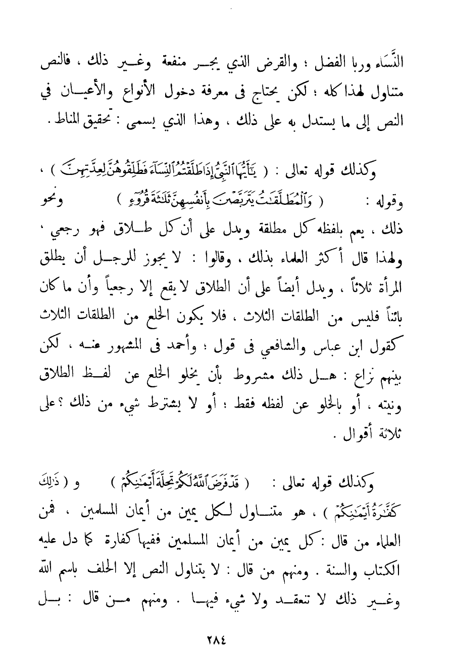 النسأ وَرِبَا الْفَضْلِ؛ وَالْقَرْضِ الَّذِي يَجُرُّ مَنْفَعَةً وَغَيْرِ ذَلِكَ فَالنَّصُّ مُتَنَاوِلٌ لِهَذَا كُلِّهِ؛ لَكِنْ يَحْتَاجُ فِي مَعْرِفَةِ دُخُولِ الْأَنْوَاعِ وَالْأَعْيَانِ فِي النَّصِّ إلَى مَا يُسْتَدَلُّ بِهِ عَلَى ذَلِكَ وَهَذَا الَّذِي يُسَمَّى: تَحْقِيقَ الْمَنَاطِ. وَكَذَلِكَ قَوْله تَعَالَى {يَا أَيُّهَا النَّبِيُّ إذَا طَلَّقْتُمُ النِّسَاءَ فَطَلِّقُوهُنَّ لِعِدَّتِهِنَّ} وَقَوْلُهُ: {وَالْمُطَلَّقَاتُ يَتَرَبَّصْنَ بِأَنْفُسِهِنَّ ثَلَاثَةَ قُرُوءٍ} وَنَحْوَ ذَلِكَ يَعُمُّ بِلَفْظِهِ كُلَّ مُطَلَّقَةٍ وَيَدُلُّ عَلَى أَنَّ كُلَّ طَلَاقٍ فَهُوَ رَجْعِيٌّ وَلِهَذَا قَالَ أَكْثَرُ الْعُلَمَاءِ بِذَلِكَ وَقَالُوا: لَا يَجُوزُ لِلرَّجُلِ أَنْ يُطَلِّقَ الْمَرْأَةَ ثَلَاثًا وَيَدُلُّ أَيْضًا عَلَى أَنَّ الطَّلَاقَ لَا يَقَعُ إلَّا رَجْعِيًّا وَأَنَّ مَا كَانَ بَائِنًا فَلَيْسَ مِنْ الطَّلَقَاتِ الثَّلَاثِ فَلَا يَكُونُ الْخُلْعُ مِنْ الطَّلَقَاتِ الثَّلَاثِ كَقَوْلِ ابْنِ عَبَّاسٍ وَالشَّافِعِيِّ فِي قَوْلٍ؛ وَأَحْمَد فِي الْمَشْهُورِ عَنْهُ لَكِنْ بَيْنَهُمْ نِزَاعٌ: هَلْ ذَلِكَ مَشْرُوطٌ بِأَنْ يَخْلُوَ الْخُلْعُ عَنْ لَفْظِ الطَّلَاقِ وَنِيَّتِهِ أَوْ بِالْخُلُوِّ عَنْ لَفْظِهِ فَقَطْ؛ أَوْ لَا يُشْتَرَطُ شَيْءٌ مِنْ ذَلِكَ؟ عَلَى ثَلَاثَةِ أَقْوَالٍ. وَكَذَلِكَ قَوْله تَعَالَى {قَدْ فَرَضَ اللَّهُ لَكُمْ تَحِلَّةَ أَيْمَانِكُمْ} و {ذَلِكَ كَفَّارَةُ أَيْمَانِكُمْ} هُوَ مُتَنَاوِلٌ لِكُلِّ يَمِينٍ مِنْ أَيْمَانِ الْمُسْلِمِينَ فَمِنْ الْعُلَمَاءِ مَنْ قَالَ: كُلُّ يَمِينٍ مِنْ أَيْمَانِ الْمُسْلِمِينَ فَفِيهَا كَفَّارَةٌ كَمَا دَلَّ عَلَيْهِ الْكِتَابُ وَالسُّنَّةُ. وَمِنْهُمْ مَنْ قَالَ: لَا يَتَنَاوَلُ النَّصُّ إلَّا الْحَلِفَ بِاسْمِ اللَّهِ وَغَيْرِ ذَلِكَ لَا تَنْعَقِدُ وَلَا شَيْءَ فِيهَا. وَمِنْهُمْ مَنْ قَالَ: بَلْ