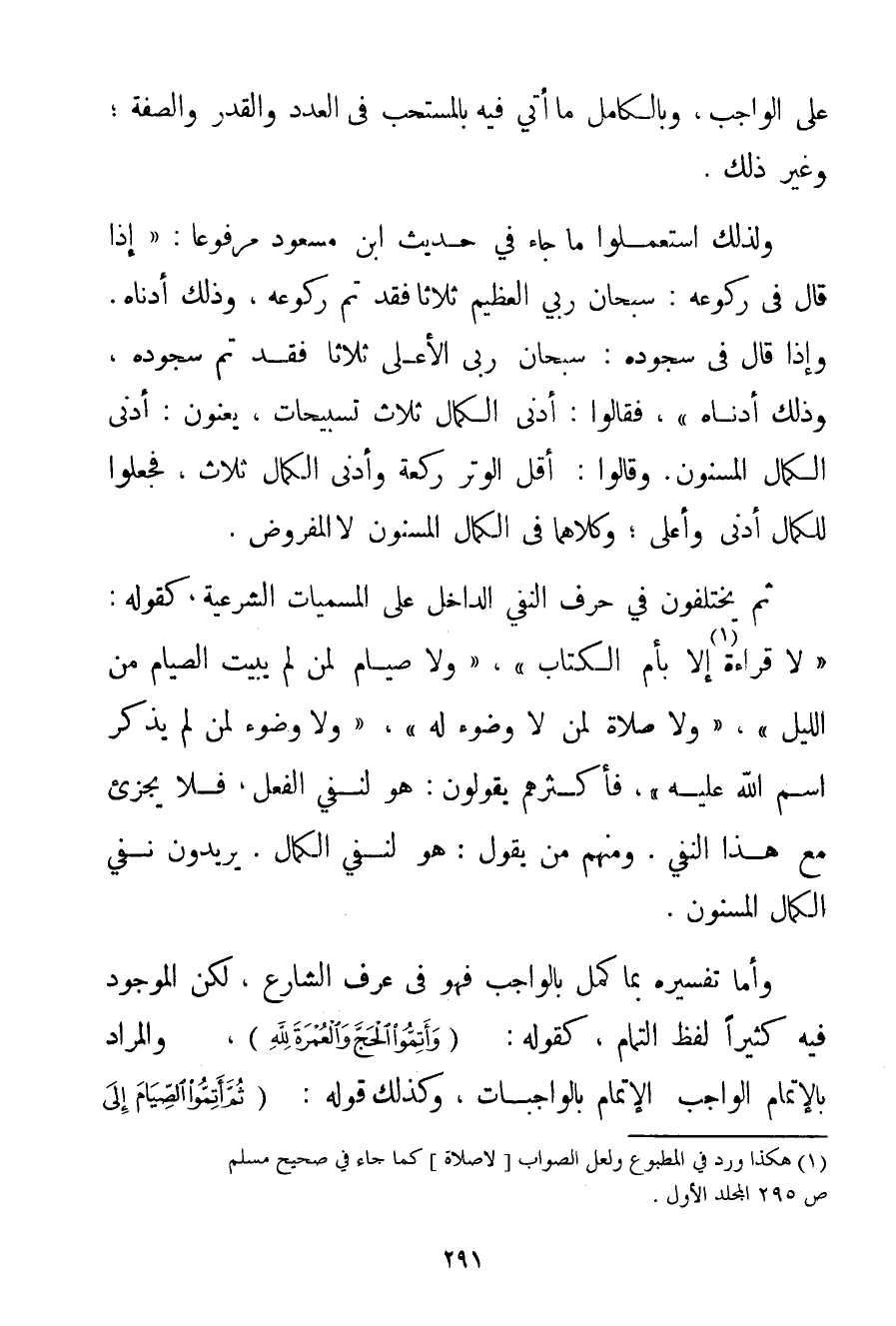 عَلَى الْوَاجِبِ وَبِالْكَامِلِ مَا أُتِيَ فِيهِ بِالْمُسْتَحَبِّ فِي الْعَدَدِ وَالْقَدْرِ وَالصِّفَةِ؛ وَغَيْرِ ذَلِكَ. وَلِذَلِكَ اسْتَعْمَلُوا مَا جَاءَ فِي حَدِيثِ ابْنِ مَسْعُودٍ مَرْفُوعًا: {إذَا قَالَ فِي رُكُوعِهِ: سُبْحَانَ رَبِّي الْعَظِيمَ ثَلَاثًا فَقَدْ تَمَّ رُكُوعُهُ وَذَلِكَ أَدْنَاهُ. وَإِذَا قَالَ فِي سُجُودِهِ: سُبْحَانَ رَبِّي الْأَعْلَى ثَلَاثًا فَقَدْ تَمَّ سُجُودُهُ وَذَلِكَ أَدْنَاهُ} فَقَالُوا: أَدْنَى الْكَمَالِ ثَلَاثُ تَسْبِيحَاتٍ يَعْنُونَ: أَدْنَى الْكَمَالِ الْمَسْنُونِ. وَقَالُوا: أَقَلُّ الْوِتْرِ رَكْعَةٌ وَأَدْنَى الْكَمَالِ ثَلَاثٌ فَجَعَلُوا لِلْكَمَالِ أَدْنَى وَأَعْلَى؛ وَكِلَاهُمَا فِي الْكَمَالِ الْمَسْنُونِ لَا الْمَفْرُوضِ. ثُمَّ يَخْتَلِفُونَ فِي حَرْفِ النَّفْيِ الدَّاخِلِ عَلَى الْمُسَمَّيَاتِ الشَّرْعِيَّةِ كَقَوْلِهِ: {لَا قِرَاءَةَ إلَّا بِأُمِّ الْكِتَابِ} {وَلَا صِيَامَ لِمَنْ لَمْ يُبَيِّتْ الصِّيَامَ مِنْ اللَّيْلِ} {وَلَا صَلَاةَ لِمَنْ لَا وُضُوءَ لَهُ} {وَلَا وُضُوءَ لِمَنْ لَمْ يُذْكَرْ اسْمَ اللَّهِ عَلَيْهِ} فَأَكْثَرُهُمْ يَقُولُونَ: هُوَ لِنَفْيِ الْفِعْلِ فَلَا يُجْزِئُ مَعَ هَذَا النَّفْيُ. وَمِنْهُمْ مَنْ يَقُولُ: هُوَ لِنَفْيِ الْكَمَالِ. يُرِيدُونَ نَفْيَ الْكَمَالِ الْمَسْنُونِ. وَأَمَّا تَفْسِيرُهُ بِمَا كَمُلَ بِالْوَاجِبِ فَهُوَ فِي عُرْفِ الشَّارِعِ لَكِنْ الْمَوْجُودُ فِيهِ كَثِيرًا لَفْظُ التَّمَامِ كَقَوْلِهِ: {وَأَتِمُّوا الْحَجَّ وَالْعُمْرَةَ لِلَّهِ} وَالْمُرَادُ بِالْإِتْمَامِ الْوَاجِبِ الْإِتْمَامُ بِالْوَاجِبَاتِ وَكَذَلِكَ قَوْلُهُ: {ثُمَّ أَتِمُّوا الصِّيَامَ