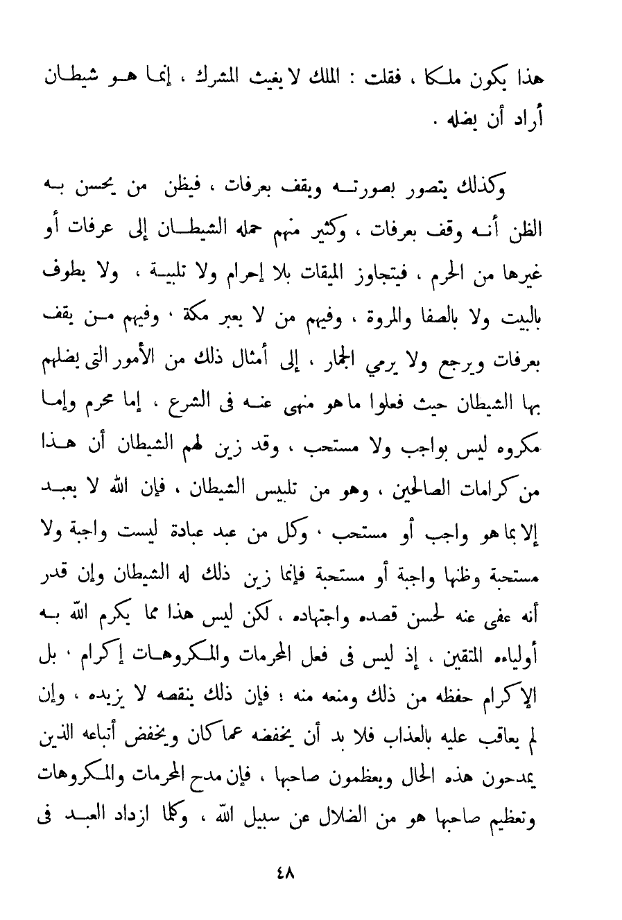 هَذَا يَكُونُ مَلَكًا فَقُلْت: الْمَلَكُ لَا يُغِيثُ الْمُشْرِكَ إنَّمَا هُوَ شَيْطَانٌ أَرَادَ أَنْ يُضِلَّهُ. وَكَذَلِكَ يَتَصَوَّرُ بِصُورَتِهِ وَيَقِفُ بِعَرَفَاتِ فَيَظُنُّ مَنْ يُحْسِنُ بِهِ الظَّنَّ أَنَّهُ وَقَفَ بِعَرَفَاتِ وَكَثِيرٌ مِنْهُمْ حَمَلَهُ الشَّيْطَانُ إلَى عَرَفَاتٍ أَوْ غَيْرِهَا مِنْ الْحَرَمِ فَيَتَجَاوَزُ الْمِيقَاتَ بِلَا إحْرَامٍ وَلَا تَلْبِيَةٍ وَلَا يَطُوفُ بِالْبَيْتِ وَلَا بِالصَّفَا وَالْمَرْوَةِ وَفِيهِمْ مَنْ لَا يَعْبُرُ مَكَّةَ وَفِيهِمْ مَنْ يَقِفُ بِعَرَفَاتِ وَيَرْجِعُ وَلَا يَرْمِي الْجِمَارَ إلَى أَمْثَالِ ذَلِكَ مِنْ الْأُمُورِ الَّتِي يُضِلُّهُمْ بِهَا الشَّيْطَانُ حَيْثُ فَعَلُوا مَا هُوَ مَنْهِيٌّ عَنْهُ فِي الشَّرْعِ إمَّا مُحَرَّمٌ وَإِمَّا مَكْرُوهٌ لَيْسَ بِوَاجِبٍ وَلَا مُسْتَحَبٍّ وَقَدْ زَيَّنَ لَهُمْ الشَّيْطَانُ أَنَّ هَذَا مِنْ كَرَامَاتِ الصَّالِحِينَ وَهُوَ مِنْ تَلْبِيسِ الشَّيْطَانِ فَإِنَّ اللَّهَ لَا يُعْبَدُ إلَّا بِمَا هُوَ وَاجِبٌ أَوْ مُسْتَحَبٌّ وَكُلُّ مَنْ عَبَدَ عِبَادَةً لَيْسَتْ وَاجِبَةً وَلَا مُسْتَحَبَّةً وَظَنَّهَا وَاجِبَةً أَوْ مُسْتَحَبَّةً فَإِنَّمَا زَيَّنَ ذَلِكَ لَهُ الشَّيْطَانُ وَإِنْ قُدِّرَ أَنَّهُ عَفَا عَنْهُ لِحُسْنِ قَصْدِهِ وَاجْتِهَادِهِ لَكِنْ لَيْسَ هَذَا مِمَّا يُكْرِمُ اللَّهُ بِهِ أَوْلِيَاءَهُ الْمُتَّقِينَ إذْ لَيْسَ فِي فِعْلِ الْمُحَرَّمَاتِ وَالْمَكْرُوهَاتِ إكْرَامٌ بَلْ الْإِكْرَامُ حِفْظُهُ مِنْ ذَلِكَ وَمَنْعُهُ مِنْهُ؛ فَإِنَّ ذَلِكَ يُنْقِصُهُ لَا يُزِيدُهُ وَإِنْ لَمْ يُعَاقَبْ عَلَيْهِ بِالْعَذَابِ فَلَا بُدَّ أَنْ يُخْفِضَهُ عَمَّا كَانَ وَيُخْفِضَ أَتْبَاعَهُ الَّذِينَ يَمْدَحُونَ هَذِهِ الْحَالَ وَيُعَظِّمُونَ صَاحِبَهَا فَإِنَّ مَدْحَ الْمُحَرَّمَاتِ وَالْمَكْرُوهَاتِ وَتَعْظِيمَ صَاحِبِهَا هُوَ مِنْ الضَّلَالِ عَنْ سَبِيلِ اللَّهِ وَكُلَّمَا ازْدَادَ الْعَبْدُ فِي