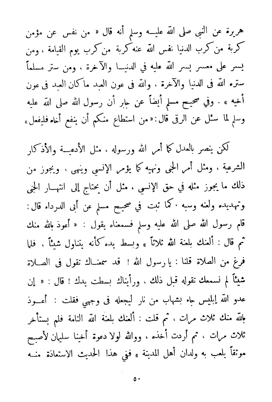 هُرَيْرَةَ عَنْ النَّبِيِّ صَلَّى اللَّهُ عَلَيْهِ وَسَلَّمَ أَنَّهُ قَالَ {مَنْ نَفَّسَ عَنْ مُؤْمِنٍ كُرْبَةً مِنْ كُرَبِ الدُّنْيَا نَفَّسَ اللَّهُ عَنْهُ كُرْبَةً مِنْ كُرَبِ يَوْمِ الْقِيَامَةِ وَمَنْ يَسَّرَ عَلَى مُعْسِرٍ يَسَّرَ اللَّهُ عَلَيْهِ فِي الدُّنْيَا وَالْآخِرَةِ وَمَنْ سَتَرَ مُسْلِمًا سَتَرَهُ اللَّهُ فِي الدُّنْيَا وَالْآخِرَةِ وَاَللَّهُ فِي عَوْنِ الْعَبْدِ مَا كَانَ الْعَبْدُ فِي عَوْنِ أَخِيهِ} . وَفِي صَحِيحِ مُسْلِمٍ أَيْضًا عَنْ جَابِرٍ {أَنَّ رَسُولَ اللَّهِ صَلَّى اللَّهُ عَلَيْهِ وَسَلَّمَ لَمَّا سُئِلَ عَنْ الرُّقَى قَالَ: مَنْ اسْتَطَاعَ مِنْكُمْ أَنْ يَنْفَعَ أَخَاهُ فَلْيَفْعَلْ} لَكِنْ يَنْصُرُ بِالْعَدْلِ كَمَا أَمَرَ اللَّهُ وَرَسُولُهُ مِثْلَ الْأَدْعِيَةِ وَالْأَذْكَارِ الشَّرْعِيَّةِ وَمِثْلَ أَمْرِ الْجِنِّيِّ وَنَهْيِهِ كَمَا يُؤْمَرُ الْإِنْسِيُّ وَيُنْهَى وَيَجُوزُ مِنْ ذَلِكَ مَا يَجُوزُ مِثْلُهُ فِي حَقِّ الْإِنْسِيِّ مِثْلَ أَنْ يَحْتَاجَ إلَى انْتِهَارِ الْجِنِّيِّ وَتَهْدِيدِهِ وَلَعْنِهِ وَسَبِّهِ كَمَا ثَبَتَ فِي صَحِيحِ مُسْلِمٍ عَنْ أَبِي الدَّرْدَاءِ قَالَ: {قَامَ رَسُولُ اللَّهِ صَلَّى اللَّهُ عَلَيْهِ وَسَلَّمَ فَسَمِعْنَاهُ يَقُولُ: أَعُوذُ بِاَللَّهِ مِنْك ثُمَّ قَالَ: أَلْعَنُك بِلَعْنَةِ اللَّهِ ثَلَاثًا وَبَسَطَ يَدَهُ كَأَنَّهُ يَتَنَاوَلُ شَيْئًا فَلَمَّا فَرَغَ مِنْ الصَّلَاةِ قُلْنَا: يَا رَسُولَ اللَّهِ قَدْ سَمِعْنَاك تَقُولُ فِي الصَّلَاةِ شَيْئًا لَمْ نَسْمَعْك تَقُولُهُ قَبْلَ ذَلِكَ وَرَأَيْنَاك بَسَطْت يَدَك قَالَ: إنَّ عَدُوَّ اللَّهِ إبْلِيسَ جَاءَ بِشِهَابٍ مِنْ نَارٍ لِيَجْعَلَهُ فِي وَجْهِي فَقُلْت: أَعُوذُ بِاَللَّهِ مِنْك ثَلَاثَ مَرَّاتٍ ثُمَّ قُلْت: أَلْعَنُك بِلَعْنَةِ اللَّهِ التَّامَّةِ فَلَمْ يَسْتَأْخِرْ ثَلَاثَ مَرَّاتٍ ثُمَّ أَرَدْت أَخْذَهُ ووالله لَوْلَا دَعْوَةُ أَخِينَا سُلَيْمَانَ لَأَصْبَحَ مُوثَقًا يَلْعَبُ بِهِ وِلْدَانُ أَهْلِ الْمَدِينَةِ} فَفِي هَذَا الْحَدِيثِ الِاسْتِعَاذَةُ مِنْهُ