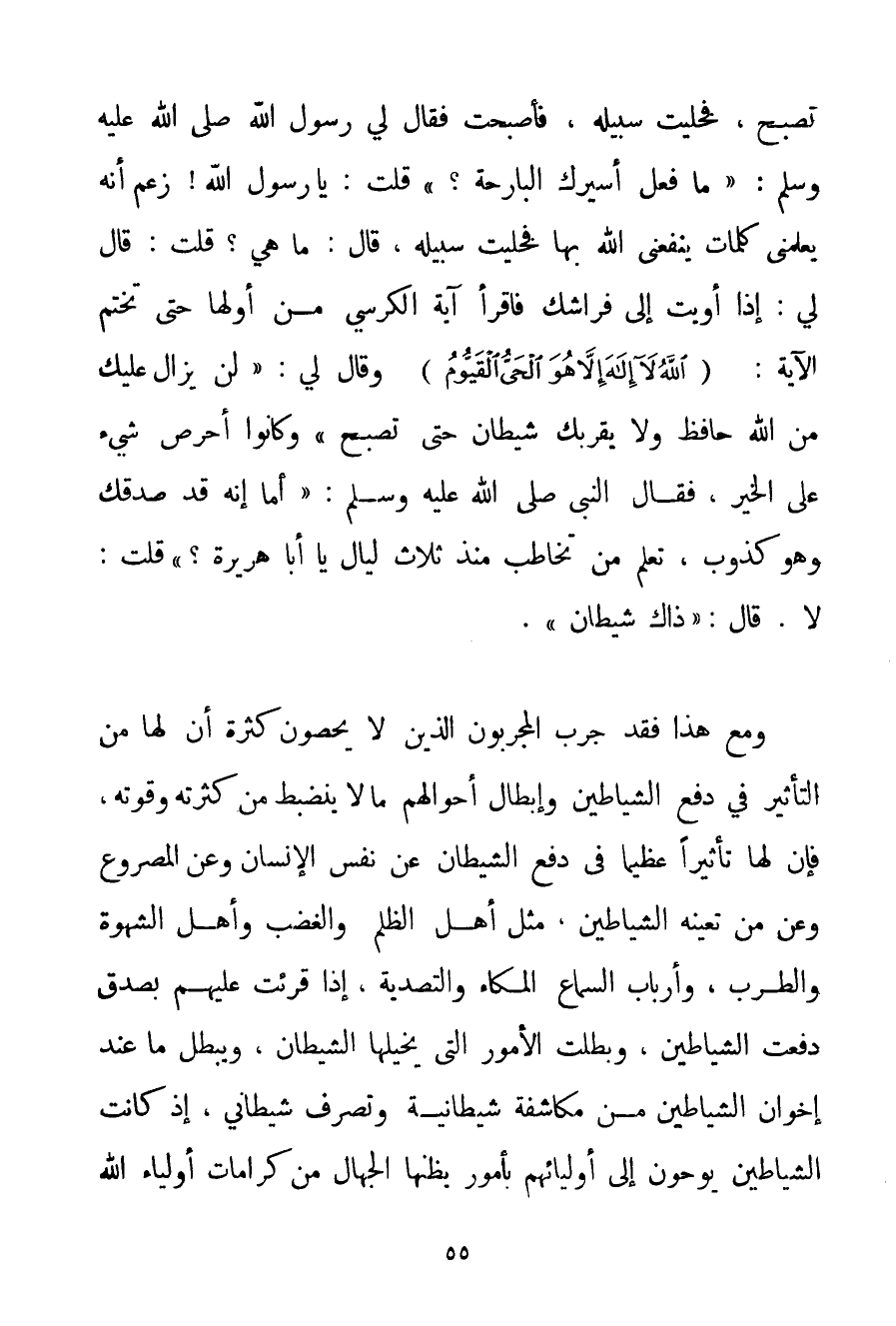 تُصْبِحَ فَخَلَّيْت سَبِيلَهُ فَأَصْبَحْت فَقَالَ لِي رَسُولُ اللَّهِ صَلَّى اللَّهُ عَلَيْهِ وَسَلَّمَ مَا فَعَلَ أَسِيرُك الْبَارِحَةَ؟ قُلْت: يَا رَسُولَ اللَّهِ زَعَمَ أَنَّهُ يُعَلِّمُنِي كَلِمَاتٍ يَنْفَعُنِي اللَّهُ بِهَا فَخَلَّيْت سَبِيلَهُ قَالَ: مَا هِيَ؟ قُلْت: قَالَ لِي: إذَا أَوَيْت إلَى فِرَاشِك فَاقْرَأْ آيَةَ الْكُرْسِيِّ مِنْ أَوَّلِهَا حَتَّى تَخْتِمَ الْآيَةَ: {اللَّهُ لَا إلَهَ إلَّا هُوَ الْحَيُّ الْقَيُّومُ} وَقَالَ لِي: لَنْ يَزَالَ عَلَيْك مِنْ اللَّهِ حَافِظٌ وَلَا يَقْرَبُك شَيْطَانٌ حَتَّى تُصْبِحَ وَكَانُوا أَحْرَصَ شَيْءٍ عَلَى الْخَيْرِ فَقَالَ النَّبِيُّ صَلَّى اللَّهُ عَلَيْهِ وَسَلَّمَ أَمَا إنَّهُ قَدْ صَدَقَك وَهُوَ كَذُوبٌ تَعْلَمُ مَنْ تُخَاطِبُ مُنْذُ ثَلَاثِ لَيَالٍ يَا أَبَا هُرَيْرَةَ؟ قُلْت: لَا. قَالَ: ذَاكَ شَيْطَانٌ} . وَمَعَ هَذَا فَقَدَ جَرَّبَ الْمُجَرِّبُونَ الَّذِينَ لَا يُحْصُونَ كَثْرَةً أَنَّ لَهَا مِنْ التَّأْثِيرِ فِي دَفْعِ الشَّيَاطِينِ وَإِبْطَالِ أَحْوَالِهِمْ مَا لَا يَنْضَبِطُ مِنْ كَثْرَتِهِ وَقُوَّتِهِ فَإِنَّ لَهَا تَأْثِيرًا عَظِيمًا فِي دَفْعِ الشَّيْطَانِ عَنْ نَفْسِ الْإِنْسَانِ وَعَنْ الْمَصْرُوعِ وَعَنْ مَنْ تُعِينُهُ الشَّيَاطِينُ مِثْلَ أَهْلِ الظُّلْمِ وَالْغَضَبِ وَأَهْلِ الشَّهْوَةِ وَالطَّرَبِ وَأَرْبَابِ السَّمَاعِ الْمُكَاءِ وَالتَّصْدِيَةِ إذَا قُرِئَتْ عَلَيْهِمْ بِصِدْقٍ دَفَعَتْ الشَّيَاطِينَ وَبَطَلَتْ الْأُمُورُ الَّتِي يُخَيِّلُهَا الشَّيْطَانُ وَيَبْطُلُ مَا عِنْدَ إخْوَانِ الشَّيَاطِينِ مِنْ مُكَاشَفَةٍ شَيْطَانِيَّةٍ وَتَصَرُّفٍ شَيْطَانِيٍّ إذْ كَانَتْ الشَّيَاطِينُ يُوحُونَ إلَى أَوْلِيَائِهِمْ بِأُمُورٍ يَظُنُّهَا الْجُهَّالُ مِنْ كَرَامَاتِ أَوْلِيَاءِ اللَّهِ