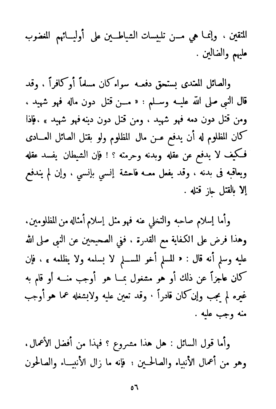 الْمُتَّقِينَ وَإِنَّمَا هِيَ مِنْ تَلْبِيسَاتِ الشَّيَاطِينِ عَلَى أَوْلِيَائِهِمْ الْمَغْضُوبِ عَلَيْهِمْ وَالضَّالِّينَ. وَالصَّائِلُ الْمُعْتَدِي يَسْتَحِقُّ دَفْعُهُ سَوَاءٌ كَانَ مُسْلِمًا أَوْ كَافِرًا وَقَدْ قَالَ النَّبِيُّ صَلَّى اللَّهُ عَلَيْهِ وَسَلَّمَ {مَنْ قُتِلَ دُونَ مَالِهِ فَهُوَ شَهِيدٌ وَمَنْ قُتِلَ دُونَ دَمِهِ فَهُوَ شَهِيدٌ وَمَنْ قُتِلَ دُونَ دِينِهِ فَهُوَ شَهِيدٌ} فَإِذَا كَانَ الْمَظْلُومُ لَهُ أَنْ يَدْفَعَ عَنْ مَالِ الْمَظْلُومِ وَلَوْ بِقَتْلِ الصَّائِلِ الْعَادِي فَكَيْفَ لَا يَدْفَعُ عَنْ عَقْلِهِ وَبَدَنِهِ وَحُرْمَتِهِ فَإِنَّ الشَّيْطَانَ يُفْسِدُ عَقْلَهُ وَيُعَاقِبُهُ فِي بَدَنِهِ وَقَدْ يَفْعَلُ مَعَهُ فَاحِشَةَ إنْسِيٍّ بِإِنْسِيِّ وَإِنْ لَمْ يَنْدَفِعْ إلَّا بِالْقَتْلِ جَازَ قَتْلُهُ. وَأَمَّا إسْلَامُ صَاحِبِهِ وَالتَّخَلِّي عَنْهُ فَهُوَ مِثْلُ إسْلَامِ أَمْثَالِهِ مِنْ الْمَظْلُومِينَ وَهَذَا فَرْضٌ عَلَى الْكِفَايَةِ مَعَ الْقُدْرَةِ فَفِي الصَّحِيحَيْنِ عَنْ النَّبِيِّ صَلَّى اللَّهُ عَلَيْهِ وَسَلَّمَ أَنَّهُ قَالَ: {الْمُسْلِمُ أَخُو الْمُسْلِمِ لَا يُسْلِمُهُ وَلَا يَظْلِمُهُ} فَإِنْ كَانَ عَاجِزًا عَنْ ذَلِكَ أَوْ هُوَ مَشْغُولٌ بِمَا هُوَ أَوْجَبُ مِنْهُ أَوْ قَامَ بِهِ غَيْرُهُ لَمْ يَجِبْ وَإِنْ كَانَ قَادِرًا وَقَدْ تَعَيَّنَ عَلَيْهِ وَلَا يَشْغَلُهُ عَمَّا هُوَ أَوْجَبُ مِنْهُ وَجَبَ عَلَيْهِ. وَأَمَّا قَوْلُ السَّائِلِ: هَلْ هَذَا مَشْرُوعٌ؟ فَهَذَا مِنْ أَفْضَلِ الْأَعْمَالِ وَهُوَ مِنْ أَعْمَالِ الْأَنْبِيَاءِ وَالصَّالِحِينَ؛ فَإِنَّهُ مَا زَالَ الْأَنْبِيَاءُ وَالصَّالِحُونَ