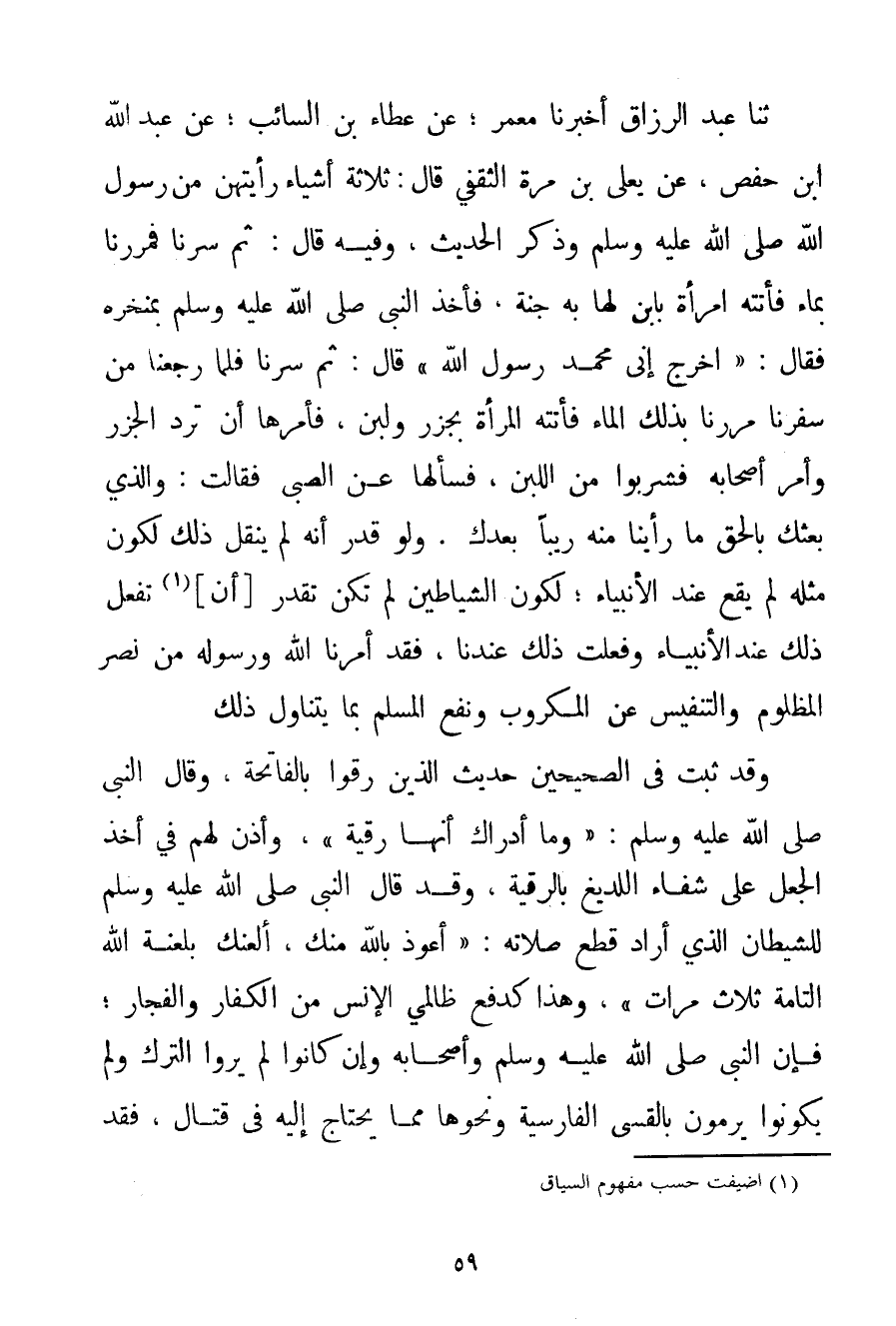 ثنَا عَبْدُ الرَّزَّاقِ أَخْبَرَنَا مَعْمَرٌ؛ عَنْ عَطَاءِ بْنِ السَّائِبِ؛ عَنْ عَبْدِ اللَّهِ بْنِ حَفْصٍ {عَنْ يَعْلَى بْنِ مُرَّةَ الثَّقَفِيِّ قَالَ: ثَلَاثَةُ أَشْيَاءَ رَأَيْتهنَّ مِنْ رَسُولِ اللَّهِ صَلَّى اللَّهُ عَلَيْهِ وَسَلَّمَ وَذَكَرَ الْحَدِيثَ وَفِيهِ قَالَ: ثُمَّ سِرْنَا فَمَرَرْنَا بِمَاءٍ فَأَتَتْهُ امْرَأَةٌ بِابْنٍ لَهَا بِهِ جِنَّةٌ فَأَخَذَ النَّبِيُّ صَلَّى اللَّهُ عَلَيْهِ وَسَلَّمَ بِمَنْخَرِهِ فَقَالَ: اُخْرُجْ إنِّي مُحَمَّدٌ رَسُولُ اللَّهِ قَالَ: ثُمَّ سِرْنَا فَلَمَّا رَجَعْنَا مِنْ سَفَرِنَا مَرَرْنَا بِذَلِكَ الْمَاءِ فَأَتَتْهُ الْمَرْأَةُ بِجَزَرٍ وَلَبَنٍ فَأَمَرَهَا أَنْ تَرُدَّ الْجَزَرَ وَأَمَرَ أَصْحَابَهُ فَشَرِبُوا مِنْ اللَّبَنِ فَسَأَلَهَا عَنْ الصَّبِيِّ فَقَالَتْ: وَاَلَّذِي بَعَثَك بِالْحَقِّ مَا رَأَيْنَا مِنْهُ رَيْبًا بَعْدَك} . وَلَوْ قُدِّرَ أَنَّهُ لَمْ يَنْقُلْ ذَلِكَ لِكَوْنِ مِثْلِهِ لَمْ يَقَعْ عِنْدَ الْأَنْبِيَاءِ؛ لِكَوْنِ الشَّيَاطِينِ لَمْ تَكُنْ تَقْدِرُ [أَنْ] (1) تَفْعَلَ ذَلِكَ عِنْدَ الْأَنْبِيَاءِ وَفَعَلَتْ ذَلِكَ عِنْدَنَا فَقَدْ أَمَرَنَا اللَّهُ وَرَسُولُهُ مِنْ نَصْرِ الْمَظْلُومِ وَالتَّنْفِيسِ عَنْ الْمَكْرُوبِ وَنَفْعِ الْمُسْلِمِ بِمَا يَتَنَاوَلُ ذَلِكَ. وَقَدْ ثَبَتَ فِي الصَّحِيحَيْنِ حَدِيثُ الَّذِينَ رَقُوا بِالْفَاتِحَةِ وَقَالَ النَّبِيُّ صَلَّى اللَّهُ عَلَيْهِ وَسَلَّمَ {وَمَا أَدْرَاك أَنَّهَا رُقْيَةٌ} {وَأَذِنَ لَهُمْ فِي أَخْذِ الْجُعْلِ عَلَى شِفَاءِ اللَّدِيغِ بِالرُّقْيَةِ} وَقَدْ {قَالَ النَّبِيُّ صَلَّى اللَّهُ عَلَيْهِ وَسَلَّمَ لِلشَّيْطَانِ الَّذِي أَرَادَ قَطْعَ صَلَاتِهِ: أَعُوذُ بِاَللَّهِ مِنْك أَلْعَنُك بِلَعْنَةِ اللَّهِ التَّامَّةِ ثَلَاثَ مَرَّاتٍ} وَهَذَا كَدَفْعِ ظَالِمِي الْإِنْسِ مِنْ الْكُفَّارِ وَالْفُجَّارِ؛ فَإِنَّ النَّبِيَّ صَلَّى اللَّهُ عَلَيْهِ وَسَلَّمَ وَأَصْحَابَهُ وَإِنْ كَانُوا لَمْ يَرَوْا التَّرْكَ وَلَمْ يَكُونُوا يَرْمُونَ بِالْقِسِيِّ الْفَارِسِيَّةِ وَنَحْوِهَا مِمَّا يُحْتَاجُ إلَيْهِ فِي قِتَالٍ فَقَدَ