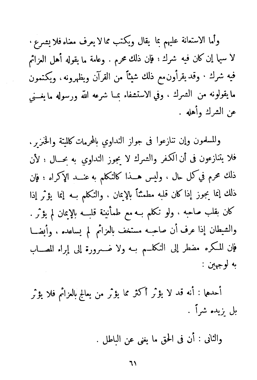 وَأَمَّا الِاسْتِعَانَةُ عَلَيْهِمْ بِمَا يُقَالُ وَيُكْتَبُ مِمَّا لَا يَعْرِفُ مَعْنَاهُ فَلَا يُشْرَعُ لَا سِيَّمَا إنْ كَانَ فِيهِ شِرْكٌ؛ فَإِنَّ ذَلِكَ مُحَرَّمٌ. وَعَامَّةُ مَا يَقُولُهُ أَهْلُ الْعَزَائِمِ فِيهِ شِرْكٌ وَقَدْ يَقْرَءُونَ مَعَ ذَلِكَ شَيْئًا مِنْ الْقُرْآنِ وَيُظْهِرُونَهُ وَيَكْتُمُونَ مَا يَقُولُونَهُ مِنْ الشِّرْكِ وَفِي الِاسْتِشْفَاءِ بِمَا شَرَعَهُ اللَّهُ وَرَسُولُهُ مَا يُغْنِي عَنْ الشِّرْكِ وَأَهْلِهِ. وَالْمُسْلِمُونَ وَإِنْ تَنَازَعُوا فِي جَوَازِ التَّدَاوِي بِالْمُحَرَّمَاتِ كَالْمَيْتَةِ وَالْخِنْزِيرِ فَلَا يَتَنَازَعُونَ فِي أَنَّ الْكُفْرَ وَالشِّرْكَ لَا يَجُوزُ التَّدَاوِي بِهِ بِحَالِ؛ لِأَنَّ ذَلِكَ مُحَرَّمٌ فِي كُلِّ حَالٍ وَلَيْسَ هَذَا كَالتَّكَلُّمِ بِهِ عِنْدَ الْإِكْرَاهِ. فَإِنَّ ذَلِكَ إنَّمَا يَجُوزُ إذَا كَانَ قَلْبُهُ مُطْمَئِنًّا بِالْإِيمَانِ وَالتَّكَلُّمُ بِهِ إنَّمَا يُؤَثِّرُ إذَا كَانَ بِقَلْبِ صَاحِبِهِ وَلَوْ تَكَلَّمَ بِهِ مَعَ طُمَأْنِينَةِ قَلْبِهِ بِالْإِيمَانِ لَمْ يُؤَثِّرْ. وَالشَّيْطَانُ إذَا عَرَفَ أَنَّ صَاحِبَهُ مُسْتَخِفٌّ بِالْعَزَائِمِ لَمْ يُسَاعِدْهُ وَأَيْضًا فَإِنَّ الْمُكْرَهَ مُضْطَرٌّ إلَى التَّكَلُّمِ بِهِ وَلَا ضَرُورَةَ إلَى إبْرَاءِ الْمُصَابِ بِهِ لِوَجْهَيْنِ: أَحَدُهُمَا: أَنَّهُ قَدْ لَا يُؤَثِّرُ أَكْثَرَ مِمَّا يُؤَثِّرُ مَنْ يُعَالِجُ بِالْعَزَائِمِ فَلَا يُؤَثِّرُ بَلْ يَزِيدُهُ شَرًّا. وَالثَّانِي: أَنَّ فِي الْحَقِّ مَا يُغْنِي عَنْ الْبَاطِلِ.