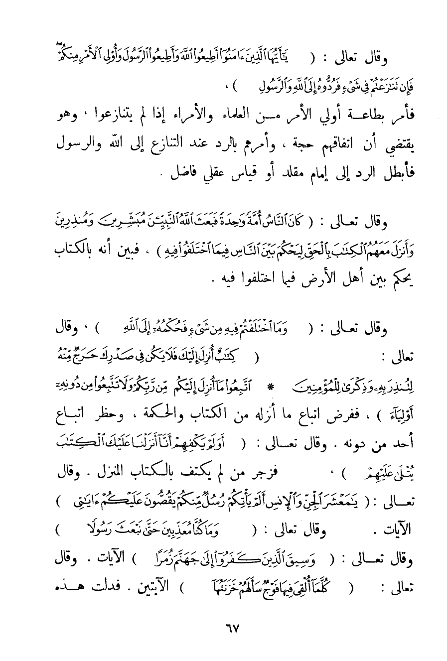 وَقَالَ تَعَالَى: {يَا أَيُّهَا الَّذِينَ آمَنُوا أَطِيعُوا اللَّهَ وَأَطِيعُوا الرَّسُولَ وَأُولِي الْأَمْرِ مِنْكُمْ فَإِنْ تَنَازَعْتُمْ فِي شَيْءٍ فَرُدُّوهُ إلَى اللَّهِ وَالرَّسُولِ} فَأَمَرَ بِطَاعَةِ أُولِي الْأَمْرِ مِنْ الْعُلَمَاءِ وَالْأُمَرَاءِ إذَا لَمْ يَتَنَازَعُوا وَهُوَ يَقْتَضِي أَنَّ اتِّفَاقَهُمْ حُجَّةٌ وَأَمْرَهُمْ بِالرَّدِّ عِنْدَ التَّنَازُعِ إلَى اللَّهِ وَالرَّسُولِ فَأَبْطَلَ الرَّدَّ إلَى إمَامٍ مُقَلِّدٍ أَوْ قِيَاسٍ عَقْلِيٍّ فَاضِلٍ. وَقَالَ تَعَالَى: {كَانَ النَّاسُ أُمَّةً وَاحِدَةً فَبَعَثَ اللَّهُ النَّبِيِّينَ مُبَشِّرِينَ وَمُنْذِرِينَ وَأَنْزَلَ مَعَهُمُ الْكِتَابَ بِالْحَقِّ لِيَحْكُمَ بَيْنَ النَّاسِ فِيمَا اخْتَلَفُوا فِيهِ} فَبَيَّنَ أَنَّهُ بِالْكِتَابِ يَحْكُمُ بَيْنَ أَهْلِ الْأَرْضِ فِيمَا اخْتَلَفُوا فِيهِ. وَقَالَ تَعَالَى: {وَمَا اخْتَلَفْتُمْ فِيهِ مِنْ شَيْءٍ فَحُكْمُهُ إلَى اللَّهِ} وَقَالَ تَعَالَى: {كِتَابٌ أُنْزِلَ إلَيْكَ فَلَا يَكُنْ فِي صَدْرِكَ حَرَجٌ مِنْهُ لِتُنْذِرَ بِهِ وَذِكْرَى لِلْمُؤْمِنِينَ} {اتَّبِعُوا مَا أُنْزِلَ إلَيْكُمْ مِنْ رَبِّكُمْ وَلَا تَتَّبِعُوا مِنْ دُونِهِ أَوْلِيَاءَ} فَفَرَضَ اتِّبَاعَ مَا أَنْزَلَهُ مِنْ الْكِتَابِ وَالْحِكْمَةِ وَحَظَّرَ اتِّبَاعَ أَحَدٍ مِنْ دُونِهِ. وَقَالَ تَعَالَى: {أَوَلَمْ يَكْفِهِمْ أَنَّا أَنْزَلْنَا عَلَيْكَ الْكِتَابَ يُتْلَى عَلَيْهِمْ} فَزَجَرَ مَنْ لَمْ يَكْتَفِ بِالْكِتَابِ الْمُنَزَّلِ. وَقَالَ تَعَالَى: {يَا مَعْشَرَ الْجِنِّ وَالْإِنْسِ أَلَمْ يَأْتِكُمْ رُسُلٌ مِنْكُمْ يَقُصُّونَ عَلَيْكُمْ آيَاتِي} الْآيَاتِ. وَقَالَ تَعَالَى: {وَمَا كُنَّا مُعَذِّبِينَ حَتَّى نَبْعَثَ رَسُولًا} وَقَالَ تَعَالَى: {وَسِيقَ الَّذِينَ كَفَرُوا إلَى جَهَنَّمَ زُمَرًا} الْآيَاتِ. وَقَالَ تَعَالَى: {كُلَّمَا أُلْقِيَ فِيهَا فَوْجٌ سَأَلَهُمْ خَزَنَتُهَا} الْآيَتَيْنِ. فَدَلَّتْ هَذِهِ