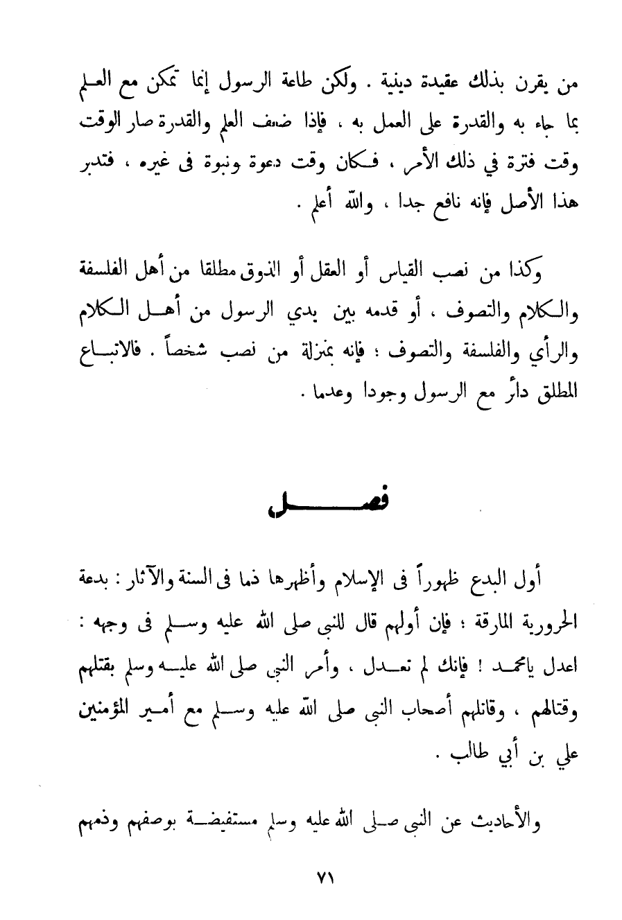 مَنْ يَقْرِنُ بِذَلِكَ عَقِيدَةً دِينِيَّةً. وَلَكِنَّ طَاعَةَ الرَّسُولِ إنَّمَا تُمْكِنُ مَعَ الْعِلْمِ بِمَا جَاءَ بِهِ وَالْقُدْرَةِ عَلَى الْعَمَلِ بِهِ فَإِذَا ضَعُفَ الْعِلْمُ وَالْقُدْرَةُ صَارَ الْوَقْتُ وَقْتَ فَتْرَةٍ فِي ذَلِكَ الْأَمْرِ فَكَانَ وَقْتَ دَعْوَةٍ وَنُبُوَّةٍ فِي غَيْرِهِ فَتَدَبَّرْ هَذَا الْأَصْلَ فَإِنَّهُ نَافِعٌ جِدًّا وَاَللَّهُ أَعْلَمُ. وَكَذَا مَنْ نَصَبَ الْقِيَاسَ أَوْ الْعَقْلَ أَوْ الذَّوْقَ مُطْلَقًا مِنْ أَهْلِ الْفَلْسَفَةِ وَالْكَلَامِ وَالتَّصَوُّفِ أَوْ قَدَّمَهُ بَيْنَ يَدَيْ الرَّسُولِ مِنْ أَهْلِ الْكَلَامِ وَالرَّأْيِ وَالْفَلْسَفَةِ وَالتَّصَوُّفِ؛ فَإِنَّهُ بِمَنْزِلَةِ مَنْ نَصَبَ شَخْصًا. فَالِاتِّبَاعُ الْمُطْلَقُ دَائِرٌ مَعَ الرَّسُولِ وُجُودًا وَعَدَمًا.