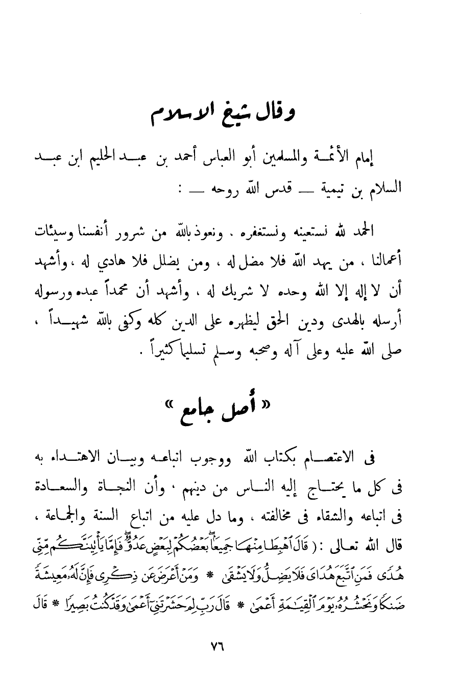 فِي الِاعْتِصَامِ بِكِتَابِ اللَّهِ وَوُجُوبِ اتِّبَاعِهِ وَبَيَانِ الِاهْتِدَاءِ بِهِ فِي كُلِّ مَا يَحْتَاجُ إلَيْهِ النَّاسُ مِنْ دِينِهِمْ وَأَنَّ النَّجَاةَ وَالسَّعَادَةَ فِي اتِّبَاعِهِ وَالشَّقَاءَ فِي مُخَالَفَتِهِ وَمَا دَلَّ عَلَيْهِ مِنْ اتِّبَاعِ السُّنَّةِ وَالْجَمَاعَةِ، قَالَ اللَّهُ تَعَالَى: {قَالَ اهْبِطَا مِنْهَا جَمِيعًا بَعْضُكُمْ لِبَعْضٍ عَدُوٌّ فَإِمَّا يَأْتِيَنَّكُمْ مِنِّي هُدًى فَمَنِ اتَّبَعَ هُدَايَ فَلَا يَضِلُّ وَلَا يَشْقَى} {وَمَنْ أَعْرَضَ عَنْ ذِكْرِي فَإِنَّ لَهُ مَعِيشَةً ضَنْكًا وَنَحْشُرُهُ يَوْمَ الْقِيَامَةِ أَعْمَى} {قَالَ