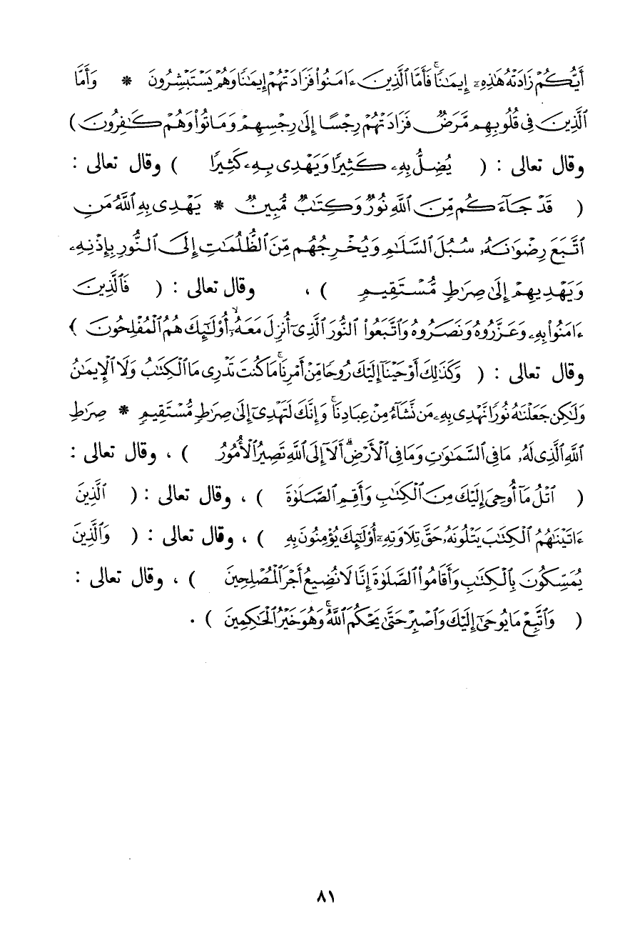 وَلَا يَزِيدُ الظَّالِمِينَ إلَّا خَسَارًا} وَقَالَ تَعَالَى: {وَإِذَا مَا أُنْزِلَتْ سُورَةٌ فَمِنْهُمْ مَنْ يَقُولُ أَيُّكُمْ زَادَتْهُ هَذِهِ إيمَانًا فَأَمَّا الَّذِينَ آمَنُوا فَزَادَتْهُمْ إيمَانًا وَهُمْ يَسْتَبْشِرُونَ} {وَأَمَّا الَّذِينَ فِي قُلُوبِهِمْ مَرَضٌ فَزَادَتْهُمْ رِجْسًا إلَى رِجْسِهِمْ وَمَاتُوا وَهُمْ كَافِرُونَ} وَقَالَ تَعَالَى: {يُضِلُّ بِهِ كَثِيرًا وَيَهْدِي بِهِ كَثِيرًا} وَقَالَ تَعَالَى: {قَدْ جَاءَكُمْ مِنَ اللَّهِ نُورٌ وَكِتَابٌ مُبِينٌ} {يَهْدِي بِهِ اللَّهُ مَنِ اتَّبَعَ رِضْوَانَهُ سُبُلَ السَّلَامِ وَيُخْرِجُهُمْ مِنَ الظُّلُمَاتِ إلَى النُّورِ بِإِذْنِهِ وَيَهْدِيهِمْ إلَى صِرَاطٍ مُسْتَقِيمٍ} وَقَالَ تَعَالَى: {فَالَّذِينَ آمَنُوا بِهِ وَعَزَّرُوهُ وَنَصَرُوهُ وَاتَّبَعُوا النُّورَ الَّذِي أُنْزِلَ مَعَهُ أُولَئِكَ هُمُ الْمُفْلِحُونَ} وَقَالَ تَعَالَى: {وَكَذَلِكَ أَوْحَيْنَا إلَيْكَ رُوحًا مِنْ أَمْرِنَا مَا كُنْتَ تَدْرِي مَا الْكِتَابُ وَلَا الْإِيمَانُ وَلَكِنْ جَعَلْنَاهُ نُورًا نَهْدِي بِهِ مَنْ نَشَاءُ مِنْ عِبَادِنَا وَإِنَّكَ لَتَهْدِي إلَى صِرَاطٍ مُسْتَقِيمٍ} {صِرَاطِ اللَّهِ الَّذِي لَهُ مَا فِي السَّمَاوَاتِ وَمَا فِي الْأَرْضِ أَلَا إلَى اللَّهِ تَصِيرُ الْأُمُورُ} وَقَالَ تَعَالَى: {اتْلُ مَا أُوحِيَ إلَيْكَ مِنَ الْكِتَابِ وَأَقِمِ الصَّلَاةَ} وَقَالَ تَعَالَى: {الَّذِينَ آتَيْنَاهُمُ الْكِتَابَ يَتْلُونَهُ حَقَّ تِلَاوَتِهِ أُولَئِكَ يُؤْمِنُونَ بِهِ} وَقَالَ تَعَالَى: {وَالَّذِينَ يُمَسِّكُونَ بِالْكِتَابِ وَأَقَامُوا الصَّلَاةَ إنَّا لَا نُضِيعُ أَجْرَ الْمُصْلِحِينَ} وَقَالَ تَعَالَى: {وَاتَّبِعْ مَا يُوحَى إلَيْكَ وَاصْبِرْ حَتَّى يَحْكُمَ اللَّهُ وَهُوَ خَيْرُ الْحَاكِمِينَ} .