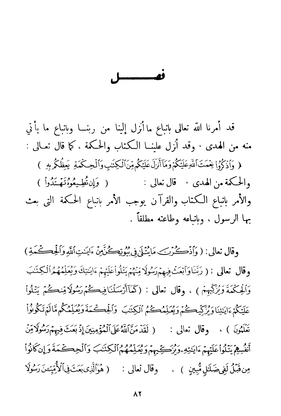 قَدْ أَمَرَنَا اللَّهُ تَعَالَى بِاتِّبَاعِ مَا أُنْزِلَ إلَيْنَا مِنْ رَبِّنَا وَبِاتِّبَاعِ مَا يَأْتِي مِنْهُ مِنْ الْهُدَى وَقَدْ أَنْزَلَ عَلَيْنَا الْكِتَابَ وَالْحِكْمَةَ كَمَا قَالَ تَعَالَى: {وَاذْكُرُوا نِعْمَةَ اللَّهِ عَلَيْكُمْ وَمَا أَنْزَلَ عَلَيْكُمْ مِنَ الْكِتَابِ وَالْحِكْمَةِ يَعِظُكُمْ بِهِ} وَالْحِكْمَةُ مِنْ الْهُدَى قَالَ تَعَالَى: {وَإِنْ تُطِيعُوهُ تَهْتَدُوا} وَالْأَمْرُ بِاتِّبَاعِ الْكِتَابِ وَالْقُرْآنِ يُوجِبُ الْأَمْرَ بِاتِّبَاعِ الْحِكْمَةِ الَّتِي بَعَثَ بِهَا الرَّسُولَ وَبِاتِّبَاعِهِ وَطَاعَتِهِ مُطْلَقًا. وَقَالَ تَعَالَى: {وَاذْكُرْنَ مَا يُتْلَى فِي بُيُوتِكُنَّ مِنْ آيَاتِ اللَّهِ وَالْحِكْمَةِ} وَقَالَ تَعَالَى: {رَبَّنَا وَابْعَثْ فِيهِمْ رَسُولًا مِنْهُمْ يَتْلُو عَلَيْهِمْ آيَاتِكَ وَيُعَلِّمُهُمُ الْكِتَابَ وَالْحِكْمَةَ وَيُزَكِّيهِمْ} وَقَالَ تَعَالَى: {كَمَا أَرْسَلْنَا فِيكُمْ رَسُولًا مِنْكُمْ يَتْلُو عَلَيْكُمْ آيَاتِنَا وَيُزَكِّيكُمْ وَيُعَلِّمُكُمُ الْكِتَابَ وَالْحِكْمَةَ وَيُعَلِّمُكُمْ مَا لَمْ تَكُونُوا تَعْلَمُونَ} وَقَالَ تَعَالَى: {لَقَدْ مَنَّ اللَّهُ عَلَى الْمُؤْمِنِينَ إذْ بَعَثَ فِيهِمْ رَسُولًا مِنْ أَنْفُسِهِمْ يَتْلُو عَلَيْهِمْ آيَاتِهِ وَيُزَكِّيهِمْ وَيُعَلِّمُهُمُ الْكِتَابَ وَالْحِكْمَةَ وَإِنْ كَانُوا مِنْ قَبْلُ لَفِي ضَلَالٍ مُبِينٍ} وَقَالَ تَعَالَى: {هُوَ الَّذِي بَعَثَ فِي الْأُمِّيِّينَ رَسُولًا مِنْهُمْ يَتْلُو عَلَيْهِمْ آيَاتِهِ وَيُزَكِّيهِمْ