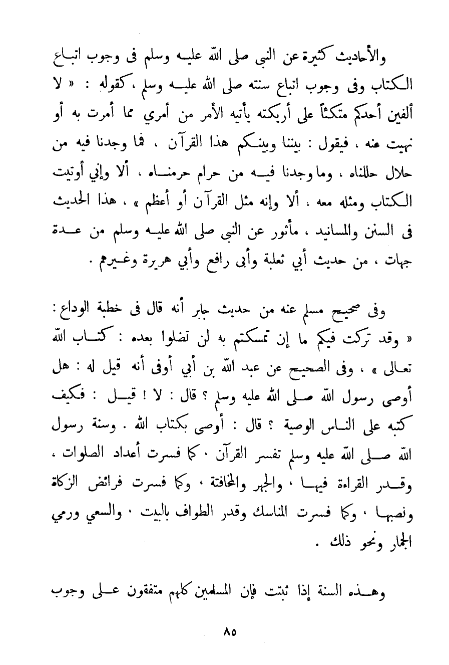 وَالْأَحَادِيثُ كَثِيرَةٌ عَنْ النَّبِيِّ صَلَّى اللَّهُ عَلَيْهِ وَسَلَّمَ فِي وُجُوبِ اتِّبَاعِ الْكِتَابِ وَفِي وُجُوبِ اتِّبَاعِ سُنَّتِهِ صَلَّى اللَّهُ عَلَيْهِ وَسَلَّمَ كَقَوْلِهِ: {لَا أُلْفِيَن أَحَدَكُمْ مُتَّكِئًا عَلَى أَرِيكَتِهِ يَأْتِيه الْأَمْرُ مِنْ أَمْرِي مِمَّا أَمَرْت بِهِ أَوْ نَهَيْت عَنْهُ فَيَقُولُ: بَيْنَنَا وَبَيْنَكُمْ هَذَا الْقُرْآنُ فَمَا وَجَدْنَا فِيهِ مِنْ حَلَالٍ حَلَلْنَاهُ وَمَا وَجَدْنَا فِيهِ مِنْ حَرَامٍ حَرَّمْنَاهُ أَلَا وَإِنِّي أُوتِيت الْكِتَابَ وَمِثْلَهُ مَعَهُ أَلَا وَإِنَّهُ مِثْلُ الْقُرْآنِ أَوْ أَعْظَمُ} هَذَا الْحَدِيثُ فِي السُّنَنِ وَالْمَسَانِيدِ مَأْثُورٌ عَنْ النَّبِيِّ صَلَّى اللَّهُ عَلَيْهِ وَسَلَّمَ مِنْ عِدَّةِ جِهَاتٍ مِنْ حَدِيثِ أَبِي ثَعْلَبَةَ وَأَبِي رَافِعٍ وَأَبِي هُرَيْرَةَ وَغَيْرِهِمْ. وَفِي صَحِيحِ مُسْلِمٍ عَنْهُ مِنْ حَدِيثِ جَابِرٍ أَنَّهُ قَالَ فِي خُطْبَةِ الْوَدَاعِ: {وَقَدْ تَرَكْت فِيكُمْ مَا إنْ تَمَسَّكْتُمْ بِهِ لَنْ تَضِلُّوا بَعْدَهُ: كِتَابَ اللَّهِ تَعَالَى} وَفِي الصَّحِيحِ عَنْ {عَبْدِ اللَّهِ بْنِ أَبِي أَوْفَى أَنَّهُ قِيلَ لَهُ: هَلْ أَوْصَى رَسُولُ اللَّهِ صَلَّى اللَّهُ عَلَيْهِ وَسَلَّمَ؟ قَالَ: لَا قِيلَ: فَكَيْفَ كَتَبَهُ عَلَى النَّاسِ الْوَصِيَّةَ؟ قَالَ: أَوْصَى بِكِتَابِ اللَّهِ} . وَسُنَّةُ رَسُولِ اللَّهِ صَلَّى اللَّهُ عَلَيْهِ وَسَلَّمَ تُفَسِّرُ الْقُرْآنَ كَمَا فَسَّرَتْ أَعْدَادَ الصَّلَوَاتِ وَقَدْرَ الْقِرَاءَةِ فِيهَا وَالْجَهْرَ وَالْمُخَافَتَةَ وَكَمَا فَسَّرَتْ فَرَائِضَ الزَّكَاةِ وَنُصُبِهَا وَكَمَا فَسَّرَتْ الْمَنَاسِكَ وَقَدْرَ الطَّوَافِ بِالْبَيْتِ وَالسَّعْيِ وَرَمْيِ الْجِمَارِ وَنَحْوِ ذَلِكَ. وَهَذِهِ السُّنَّةُ إذَا ثَبَتَتْ فَإِنَّ الْمُسْلِمِينَ كُلَّهُمْ مُتَّفِقُونَ عَلَى وُجُوبِ