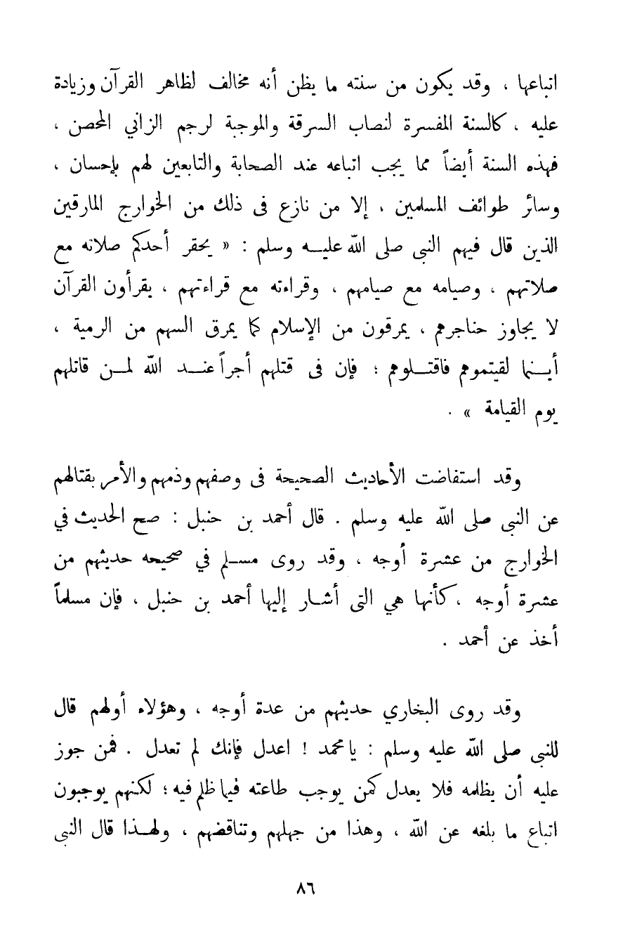 اتِّبَاعِهَا وَقَدْ يَكُونُ مِنْ سُنَّتِهِ مَا يَظُنُّ أَنَّهُ مُخَالِفٌ لِظَاهِرِ الْقُرْآنِ وَزِيَادَةٌ عَلَيْهِ كَالسُّنَّةِ الْمُفَسِّرَةِ لِنِصَابِ السَّرِقَةِ وَالْمُوجِبَةِ لِرَجْمِ الزَّانِي الْمُحْصَنِ فَهَذِهِ السُّنَّةُ أَيْضًا مِمَّا يَجِبُ اتِّبَاعُهُ عِنْدَ الصَّحَابَةِ وَالتَّابِعِينَ لَهُمْ بِإِحْسَانِ وَسَائِرِ طَوَائِفِ الْمُسْلِمِينَ إلَّا مَنْ نَازَعَ فِي ذَلِكَ مِنْ الْخَوَارِجِ الْمَارِقِينَ الَّذِينَ قَالَ فِيهِمْ النَّبِيُّ صَلَّى اللَّهُ عَلَيْهِ وَسَلَّمَ {يُحَقِّرُ أَحَدُكُمْ صَلَاتَهُ مَعَ صَلَاتِهِمْ وَصِيَامَهُ مَعَ صِيَامِهِمْ وَقِرَاءَتَهُ مَعَ قِرَاءَتِهِمْ يَقْرَءُونَ الْقُرْآنَ لَا يُجَاوِزُ حَنَاجِرَهُمْ يَمْرُقُونَ مِنْ الْإِسْلَامِ كَمَا يَمْرُقُ السَّهْمُ مِنْ الرَّمِيَّةِ أَيْنَمَا لَقِيتُمُوهُمْ فَاقْتُلُوهُمْ. فَإِنَّ فِي قَتْلِهِمْ أَجْرًا عِنْدَ اللَّهِ لِمَنْ قَاتَلَهُمْ يَوْمَ الْقِيَامَةِ} . وَقَدْ اسْتَفَاضَتْ الْأَحَادِيثُ الصَّحِيحَةُ فِي وَصْفِهِمْ وَذَمِّهِمْ وَالْأَمْرِ بِقِتَالِهِمْ عَنْ النَّبِيِّ صَلَّى اللَّهُ عَلَيْهِ وَسَلَّمَ. قَالَ أَحْمَد بْنُ حَنْبَلٍ: صَحَّ الْحَدِيثُ فِي الْخَوَارِجِ مِنْ عَشَرَةِ أَوْجُهٍ وَقَدْ رَوَى مُسْلِمٌ فِي صَحِيحِهِ حَدِيثَهُمْ مِنْ عَشَرَةِ أَوْجُهٍ كَأَنَّهَا هِيَ الَّتِي أَشَارَ إلَيْهَا أَحْمَد بْنُ حَنْبَلٍ فَإِنَّ مُسْلِمًا أَخَذَ عَنْ أَحْمَد. وَقَدْ رَوَى الْبُخَارِيُّ حَدِيثَهُمْ مِنْ عِدَّةِ أَوْجُهٍ وَهَؤُلَاءِ أَوَّلُهُمْ قَالَ لِلنَّبِيِّ صَلَّى اللَّهُ عَلَيْهِ وَسَلَّمَ يَا مُحَمَّدُ اعْدِلْ فَإِنَّك لَمْ تَعْدِلْ. فَمَنْ جَوَّزَ عَلَيْهِ أَنْ يَظْلِمَهُ فَلَا يَعْدِلْ كَمَنْ يُوجِبُ طَاعَتَهُ فِيمَا ظَلَمَ فِيهِ؛ لَكِنَّهُمْ يُوجِبُونَ اتِّبَاعَ مَا بَلَغَهُ عَنْ اللَّهِ وَهَذَا مِنْ جَهْلِهِمْ وَتَنَاقُضِهِمْ وَلِهَذَا قَالَ النَّبِيُّ