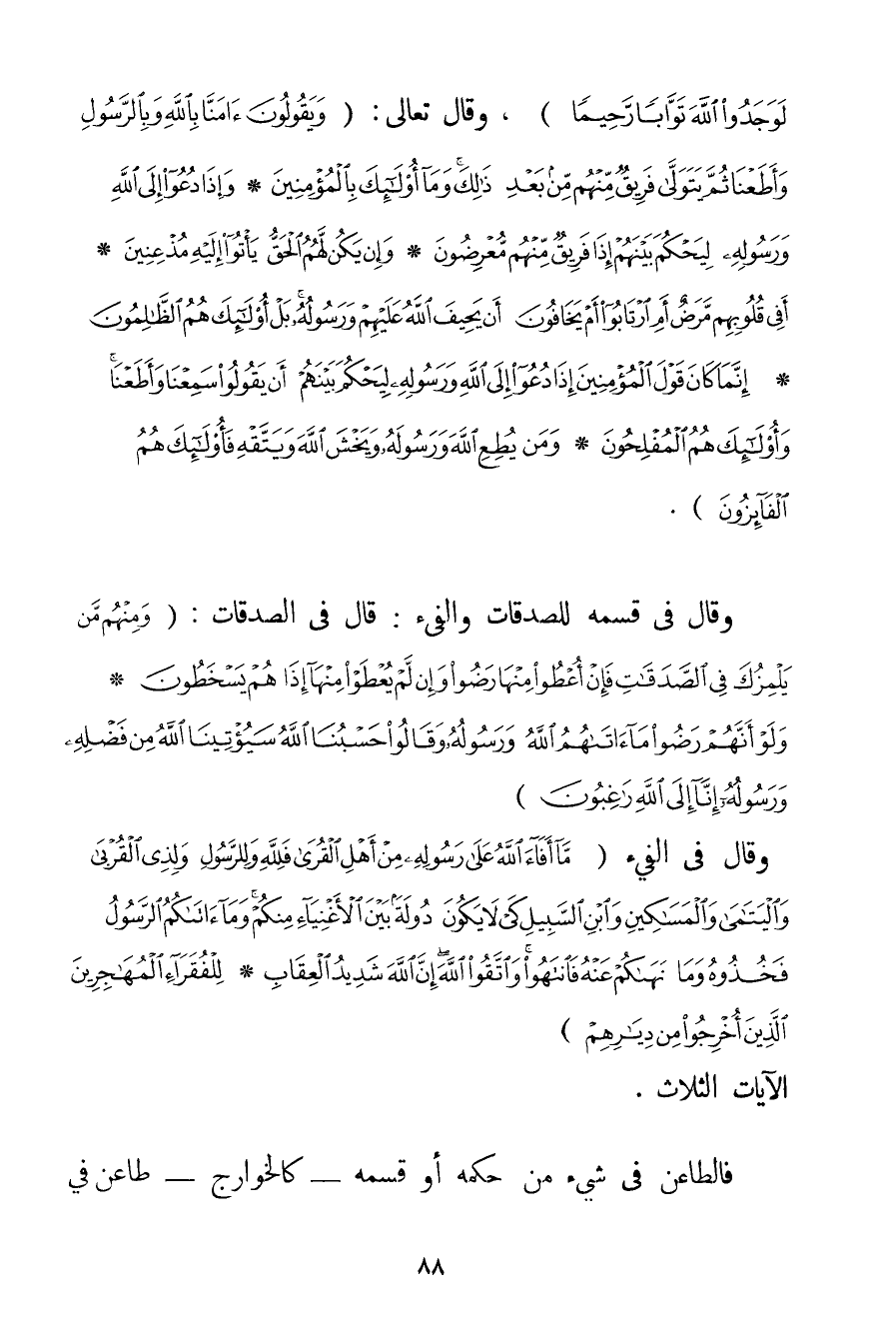 لَوَجَدُوا اللَّهَ تَوَّابًا رَحِيمًا} وَقَالَ تَعَالَى: {وَيَقُولُونَ آمَنَّا بِاللَّهِ وَبِالرَّسُولِ وَأَطَعْنَا ثُمَّ يَتَوَلَّى فَرِيقٌ مِنْهُمْ مِنْ بَعْدِ ذَلِكَ وَمَا أُولَئِكَ بِالْمُؤْمِنِينَ} {وَإِذَا دُعُوا إلَى اللَّهِ وَرَسُولِهِ لِيَحْكُمَ بَيْنَهُمْ إذَا فَرِيقٌ مِنْهُمْ مُعْرِضُونَ} {وَإِنْ يَكُنْ لَهُمُ الْحَقُّ يَأْتُوا إلَيْهِ مُذْعِنِينَ} {أَفِي قُلُوبِهِمْ مَرَضٌ أَمِ ارْتَابُوا أَمْ يَخَافُونَ أَنْ يَحِيفَ اللَّهُ عَلَيْهِمْ وَرَسُولُهُ بَلْ أُولَئِكَ هُمُ الظَّالِمُونَ} {إنَّمَا كَانَ قَوْلَ الْمُؤْمِنِينَ إذَا دُعُوا إلَى اللَّهِ وَرَسُولِهِ لِيَحْكُمَ بَيْنَهُمْ أَنْ يَقُولُوا سَمِعْنَا وَأَطَعْنَا وَأُولَئِكَ هُمُ الْمُفْلِحُونَ} {وَمَنْ يُطِعِ اللَّهَ وَرَسُولَهُ وَيَخْشَ اللَّهَ وَيَتَّقْهِ فَأُولَئِكَ هُمُ الْفَائِزُونَ} . وَقَالَ فِي قَسْمِهِ لِلصَّدَقَاتِ وَالْفَيْءِ قَالَ فِي الصَّدَقَاتِ: {وَمِنْهُمْ مَنْ يَلْمِزُكَ فِي الصَّدَقَاتِ فَإِنْ أُعْطُوا مِنْهَا رَضُوا وَإِنْ لَمْ يُعْطَوْا مِنْهَا إذَا هُمْ يَسْخَطُونَ} {وَلَوْ أَنَّهُمْ رَضُوا مَا آتَاهُمُ اللَّهُ وَرَسُولُهُ وَقَالُوا حَسْبُنَا اللَّهُ سَيُؤْتِينَا اللَّهُ مِنْ فَضْلِهِ وَرَسُولُهُ إنَّا إلَى اللَّهِ رَاغِبُونَ} وَقَالَ فِي الْفَيْءِ {مَا أَفَاءَ اللَّهُ عَلَى رَسُولِهِ مِنْ أَهْلِ الْقُرَى فَلِلَّهِ وَلِلرَّسُولِ وَلِذِي الْقُرْبَى وَالْيَتَامَى وَالْمَسَاكِينِ وَابْنِ السَّبِيلِ كَيْ لَا يَكُونَ دُولَةً بَيْنَ الْأَغْنِيَاءِ مِنْكُمْ وَمَا آتَاكُمُ الرَّسُولُ فَخُذُوهُ وَمَا نَهَاكُمْ عَنْهُ فَانْتَهُوا وَاتَّقُوا اللَّهَ إنَّ اللَّهَ شَدِيدُ الْعِقَابِ} {لِلْفُقَرَاءِ الْمُهَاجِرِينَ الَّذِينَ أُخْرِجُوا مِنْ دِيارِهِمْ} الْآيَاتِ الثَّلَاثَ. فَالطَّاعِنُ فِي شَيْءٍ مِنْ حُكْمِهِ أَوْ قَسْمِهِ - كَالْخَوَارِجِ - طَاعِنٌ فِي