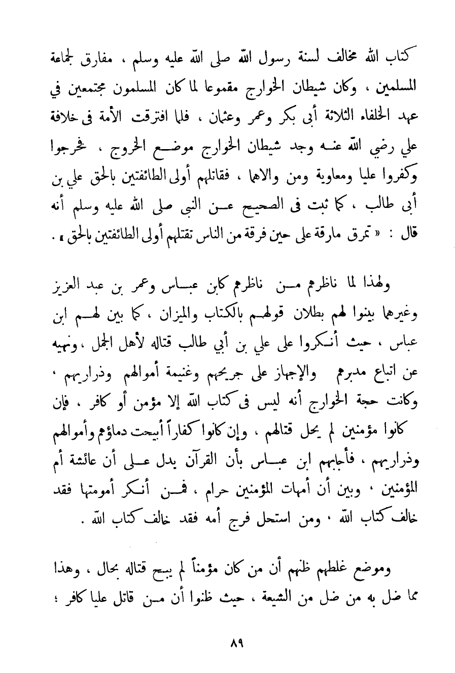 كِتَابِ اللَّهِ مُخَالِفٌ لِسُنَّةِ رَسُولِ اللَّهِ صَلَّى اللَّهُ عَلَيْهِ وَسَلَّمَ مُفَارِقٌ لِجَمَاعَةِ الْمُسْلِمِينَ وَكَانَ شَيْطَانُ الْخَوَارِجِ مَقْمُوعًا لَمَّا كَانَ الْمُسْلِمُونَ مُجْتَمِعِينَ فِي عَهْدِ الْخُلَفَاءِ الثَّلَاثَةِ أَبِي بَكْرٍ وَعُمَرَ وَعُثْمَانَ فَلَمَّا افْتَرَقَتْ الْأُمَّةُ فِي خِلَافَةِ عَلِيٍّ رَضِيَ اللَّهُ عَنْهُ وَجَدَ شَيْطَانُ الْخَوَارِجِ مَوْضِعَ الْخُرُوجِ فَخَرَجُوا وَكَفَّرُوا عَلِيًّا وَمُعَاوِيَةَ وَمَنْ وَالَاهُمَا فَقَاتَلَهُمْ أَوْلَى الطَّائِفَتَيْنِ بِالْحَقِّ عَلِيُّ بْنُ أَبِي طَالِبٍ كَمَا ثَبَتَ فِي الصَّحِيحِ عَنْ النَّبِيِّ صَلَّى اللَّهُ عَلَيْهِ وَسَلَّمَ أَنَّهُ قَالَ: {تَمْرُقُ مَارِقَةٌ عَلَى حِينِ فُرْقَةٍ مِنْ النَّاسِ تَقْتُلُهُمْ أَوْلَى الطَّائِفَتَيْنِ بِالْحَقِّ} .