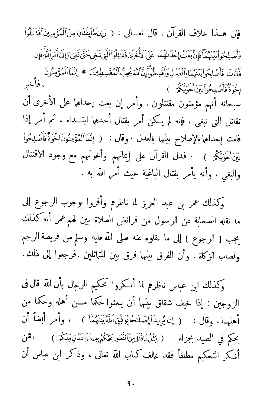 فَإِنَّ هَذَا خِلَافُ الْقُرْآنِ قَالَ تَعَالَى: {وَإِنْ طَائِفَتَانِ مِنَ الْمُؤْمِنِينَ اقْتَتَلُوا فَأَصْلِحُوا بَيْنَهُمَا فَإِنْ بَغَتْ إحْدَاهُمَا عَلَى الْأُخْرَى فَقَاتِلُوا الَّتِي تَبْغِي حَتَّى تَفِيءَ إلَى أَمْرِ اللَّهِ فَإِنْ فَاءَتْ فَأَصْلِحُوا بَيْنَهُمَا بِالْعَدْلِ وَأَقْسِطُوا إنَّ اللَّهَ يُحِبُّ الْمُقْسِطِينَ} {إنَّمَا الْمُؤْمِنُونَ إخْوَةٌ فَأَصْلِحُوا بَيْنَ أَخَوَيْكُمْ} فَأَخْبَرَ سُبْحَانَهُ أَنَّهُمْ مُؤْمِنُونَ مُقْتَتِلُونَ وَأَمَرَ إنْ بَغَتْ إحْدَاهُمَا عَلَى الْأُخْرَى أَنْ تُقَاتِلَ الَّتِي تَبْغِي فَإِنَّهُ لَمْ يَكُنْ أَمَرَ بِقِتَالِ أَحَدِهِمَا ابْتِدَاءً ثُمَّ أَمَرَ إذَا فَاءَتْ إحْدَاهُمَا بِالْإِصْلَاحِ بَيْنَهُمَا بِالْعَدْلِ وَقَالَ: {إنَّمَا الْمُؤْمِنُونَ إخْوَةٌ فَأَصْلِحُوا بَيْنَ أَخَوَيْكُمْ} فَدَلَّ الْقُرْآنُ عَلَى إيمَانِهِمْ وَأُخُوَّتِهِمْ مَعَ وُجُودِ الِاقْتِتَالِ وَالْبَغْيِ وَأَنَّهُ يَأْمُرُ بِقِتَالِ الْبَاغِيَةِ حَيْثُ أَمَرَ اللَّهُ بِهِ. وَكَذَلِكَ عُمَرُ بْنُ عَبْدِ الْعَزِيزِ لَمَّا نَاظَرَهُمْ وَأَقَرُّوا بِوُجُوبِ الرُّجُوعِ إلَى مَا نَقَلَهُ الصَّحَابَةُ عَنْ الرَّسُولِ مِنْ فَرَائِضِ الصَّلَاةِ بَيَّنَ لَهُمْ عُمَرُ أَنَّهُ كَذَلِكَ يَجِبُ الرُّجُوعُ إلَى مَا نَقَلُوهُ عَنْهُ صَلَّى اللَّهُ عَلَيْهِ وَسَلَّمَ مِنْ فَرِيضَةِ الرَّجْمِ وَنِصَابِ الزَّكَاةِ وَأَنَّ الْفَرْقَ بَيْنَهُمَا فَرْقٌ بَيْنٌ الْمُتَمَاثِلَيْنِ فَرَجَعُوا إلَى ذَلِكَ. وَكَذَلِكَ ابْنُ عَبَّاسٍ نَاظَرَهُمْ لَمَّا أَنْكَرُوا تَحْكِيمَ الرِّجَالِ بِأَنَّ اللَّهَ قَالَ فِي الزَّوْجَيْنِ: إذَا خِيفَ شِقَاقُ بَيْنِهِمَا أَنْ يَبْعَثَ حَكَمًا مِنْ أَهْلِهِ وَحَكَمًا مِنْ أَهْلِهَا وَقَالَ: {إنْ يُرِيدَا إصْلَاحًا يُوَفِّقِ اللَّهُ بَيْنَهُمَا} وَأَمَرَ أَيْضًا أَنْ يَحْكُمَ فِي الصَّيْدِ بِجَزَاءِ مِثْلِ مَا قَتَلَ مِنْ النَّعَمِ يَحْكُمُ بِهِ ذَوَا عَدْلٍ مِنْكُمْ فَمَنْ أَنْكَرَ التَّحْكِيمَ مُطْلَقًا فَقَدْ خَالَفَ كِتَابَ اللَّهِ تَعَالَى وَذَكَرَ ابْنُ عَبَّاسٍ أَنَّ