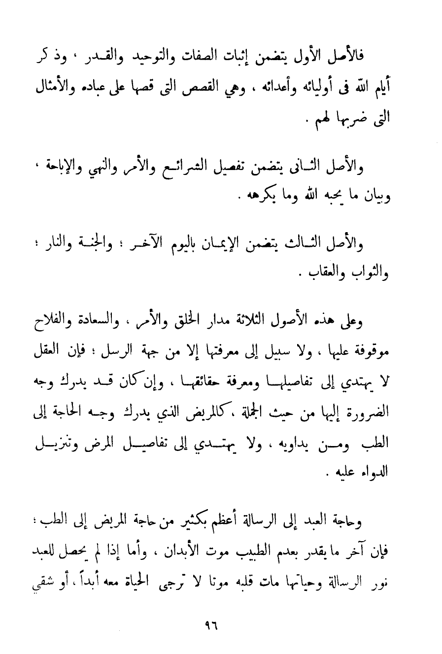 فَالْأَصْلُ الْأَوَّلُ يَتَضَمَّنُ إثْبَاتَ الصِّفَاتِ وَالتَّوْحِيدِ وَالْقَدْرِ وَذِكْرِ أَيَّامِ اللَّهِ فِي أَوْلِيَائِهِ وَأَعْدَائِهِ وَهِيَ الْقِصَصُ الَّتِي قَصَّهَا عَلَى عِبَادِهِ وَالْأَمْثَالُ الَّتِي ضَرَبَهَا لَهُمْ. وَالْأَصْلُ الثَّانِي يَتَضَمَّنُ تَفْصِيلَ الشَّرَائِعِ وَالْأَمْرِ وَالنَّهْيِ وَالْإِبَاحَةِ وَبَيَانِ مَا يُحِبُّهُ اللَّهُ وَمَا يَكْرَهُهُ. وَالْأَصْلُ الثَّالِثُ يَتَضَمَّنُ الْإِيمَانَ بِالْيَوْمِ الْآخِرِ؛ وَالْجَنَّةِ وَالنَّارِ؛ وَالثَّوَابِ وَالْعِقَابِ. وَعَلَى هَذِهِ الْأُصُولِ الثَّلَاثَةِ مَدَارُ الْخَلْقِ وَالْأَمْرِ وَالسَّعَادَةِ وَالْفَلَاحِ مَوْقُوفَةٌ عَلَيْهَا وَلَا سَبِيلَ إلَى مَعْرِفَتِهَا إلَّا مِنْ جِهَةِ الرُّسُلِ؛ فَإِنَّ الْعَقْلَ لَا يَهْتَدِي إلَى تَفَاصِيلِهَا وَمَعْرِفَةِ حَقَائِقِهَا وَإِنْ كَانَ قَدْ يُدْرِكُ وَجْهَ الضَّرُورَةِ إلَيْهَا مِنْ حَيْثُ الْجُمْلَةُ كَالْمَرِيضِ الَّذِي يُدْرِكُ وَجْهَ الْحَاجَةِ إلَى الطِّبِّ وَمَنْ يُدَاوِيه وَلَا يَهْتَدِي إلَى تَفَاصِيلِ الْمَرَضِ وَتَنْزِيلِ الدَّوَاءِ عَلَيْهِ. وَحَاجَةُ الْعَبْدِ إلَى الرِّسَالَةِ أَعْظَمُ بِكَثِيرِ مِنْ حَاجَةِ الْمَرِيضِ إلَى الطِّبِّ؛ فَإِنَّ آخِرَ مَا يُقَدَّرُ بِعَدَمِ الطَّبِيبِ مَوْتُ الْأَبْدَانِ وَأَمَّا إذَا لَمْ يَحْصُلْ لِلْعَبْدِ نُورُ الرِّسَالَةِ وَحَيَاتِهَا مَاتَ قَلْبُهُ مَوْتًا لَا تُرْجَى الْحَيَاةُ مَعَهُ أَبَدًا أَوْ شَقِيَ