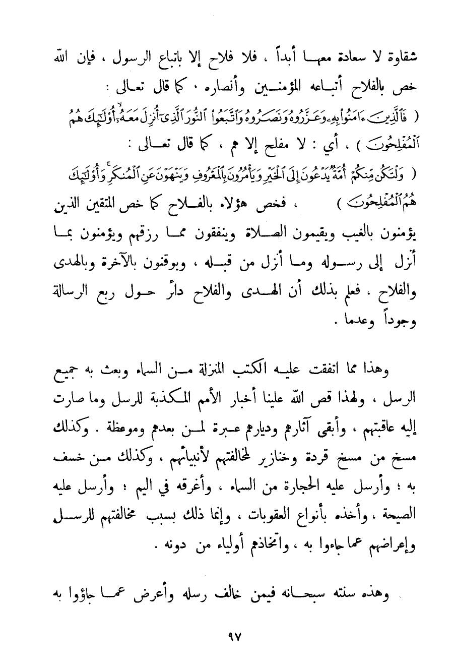 شَقَاوَةً لَا سَعَادَةَ مَعَهَا أَبَدًا فَلَا فَلَاحَ إلَّا بِاتِّبَاعِ الرَّسُولِ فَإِنَّ اللَّهَ خَصَّ بِالْفَلَاحِ أَتْبَاعَهُ الْمُؤْمِنِينَ وَأَنْصَارَهُ كَمَا قَالَ تَعَالَى: {فَالَّذِينَ آمَنُوا بِهِ وَعَزَّرُوهُ وَنَصَرُوهُ وَاتَّبَعُوا النُّورَ الَّذِي أُنْزِلَ مَعَهُ أُولَئِكَ هُمُ الْمُفْلِحُونَ} أَيْ: لَا مُفْلِحَ إلَّا هُمْ كَمَا قَالَ تَعَالَى: {وَلْتَكُنْ مِنْكُمْ أُمَّةٌ يَدْعُونَ إلَى الْخَيْرِ وَيَأْمُرُونَ بِالْمَعْرُوفِ وَيَنْهَوْنَ عَنِ الْمُنْكَرِ وَأُولَئِكَ هُمُ الْمُفْلِحُونَ} فَخَصَّ هَؤُلَاءِ بِالْفَلَاحِ كَمَا خَصَّ الْمُتَّقِينَ الَّذِينَ يُؤْمِنُونَ بِالْغَيْبِ وَيُقِيمُونَ الصَّلَاةَ وَيُنْفِقُونَ مِمَّا رَزَقَهُمْ وَيُؤْمِنُونَ بِمَا أُنْزِلَ إلَى رَسُولِهِ وَمَا أُنْزِلَ مِنْ قَبْلِهِ وَيُوقِنُونَ بِالْآخِرَةِ وَبِالْهُدَى وَالْفَلَاحِ فَعَلِمَ بِذَلِكَ أَنَّ الْهُدَى وَالْفَلَاحَ دَائِرٌ حَوْلَ رُبُعِ الرِّسَالَةِ وُجُودًا وَعَدَمًا. وَهَذَا مِمَّا اتَّفَقَتْ عَلَيْهِ الْكُتُبُ الْمُنَزَّلَةُ مِنْ السَّمَاءِ وَبُعِثَ بِهِ جَمِيعُ الرُّسُلِ وَلِهَذَا قَصَّ اللَّهُ عَلَيْنَا أَخْبَارَ الْأُمَمِ الْمُكَذِّبَةِ لِلرُّسُلِ وَمَا صَارَتْ إلَيْهِ عَاقِبَتُهُمْ وَأَبْقَى آثَارَهُمْ وَدِيَارَهُمْ عِبْرَةً لِمَنْ بَعْدَهُمْ وَمَوْعِظَةً. وَكَذَلِكَ مَسَخَ مَنْ مَسَخَ قِرَدَةً وَخَنَازِيرَ لِمُخَالَفَتِهِمْ لِأَنْبِيَائِهِمْ وَكَذَلِكَ مَنْ خَسَفَ بِهِ؛ وَأَرْسَلَ عَلَيْهِ الْحِجَارَةَ مِنْ السَّمَاءِ وَأَغْرَقَهُ فِي الْيَمِّ؛ وَأَرْسَلَ عَلَيْهِ الصَّيْحَةَ وَأَخَذَهُ بِأَنْوَاعِ الْعُقُوبَاتِ وَإِنَّمَا ذَلِكَ بِسَبَبِ مُخَالَفَتِهِمْ لِلرُّسُلِ وَإِعْرَاضِهِمْ عَمَّا جَاءُوا بِهِ وَاِتِّخَاذِهِمْ أَوْلِيَاءَ مِنْ دُونِهِ. وَهَذِهِ سُنَّتُهُ سُبْحَانَهُ فِيمَنْ خَالَفَ رُسُلَهُ وَأَعْرَضَ عَمَّا جَاؤُوا بِهِ