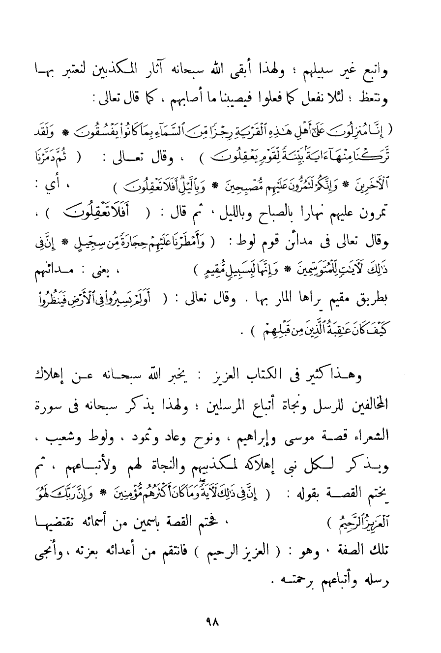 وَاتَّبَعَ غَيْرَ سَبِيلِهِمْ؛ وَلِهَذَا أَبْقَى اللَّهُ سُبْحَانَهُ آثَارَ الْمُكَذِّبِينَ لِنَعْتَبِرَ بِهَا وَنَتَّعِظَ؛ لِئَلَّا نَفْعَلَ كَمَا فَعَلُوا فَيُصِيبُنَا مَا أَصَابَهُمْ كَمَا قَالَ تَعَالَى: {إنَّا مُنْزِلُونَ عَلَى أَهْلِ هَذِهِ الْقَرْيَةِ رِجْزًا مِنَ السَّمَاءِ بِمَا كَانُوا يَفْسُقُونَ} {وَلَقَدْ تَرَكْنَا مِنْهَا آيَةً بَيِّنَةً لِقَوْمٍ يَعْقِلُونَ} وَقَالَ تَعَالَى: {ثُمَّ دَمَّرْنَا الْآخَرِينَ} {وَإِنَّكُمْ لَتَمُرُّونَ عَلَيْهِمْ مُصْبِحِينَ} {وَبِاللَّيْلِ أَفَلَا تَعْقِلُونَ} أَيْ: تَمُرُّونَ عَلَيْهِمْ نَهَارًا بِالصَّبَاحِ وَبِاللَّيْلِ ثُمَّ قَالَ: {أَفَلَا تَعْقِلُونَ} وَقَالَ تَعَالَى فِي مَدَائِنِ قَوْمِ لُوطٍ: {وَأَمْطَرْنَا عَلَيْهِمْ حِجَارَةً مِنْ سِجِّيلٍ} {إنَّ فِي ذَلِكَ لَآيَاتٍ لِلْمُتَوَسِّمِينَ} {وَإِنَّهَا لَبِسَبِيلٍ مُقِيمٍ} يَعْنِي: مَدَائِنَهُمْ بِطْرِيقٍ مُقِيمٍ يَرَاهَا الْمَارُّ بِهَا. وَقَالَ تَعَالَى: {أَوَلَمْ يَسِيرُوا فِي الْأَرْضِ فَيَنْظُرُوا كَيْفَ كَانَ عَاقِبَةُ الَّذِينَ مِنْ قَبْلِهِمْ} . وَهَذَا كَثِيرٌ فِي الْكِتَاب الْعَزِيزِ: يُخْبِرُ اللَّهُ سُبْحَانَهُ عَنْ إهْلَاكِ الْمُخَالِفِينَ لِلرُّسُلِ وَنَجَاةِ أَتْبَاعِ الْمُرْسَلِينَ؛ وَلِهَذَا يَذْكُرُ سُبْحَانَهُ فِي سُورَةِ الشُّعَرَاءِ قِصَّةَ مُوسَى وَإِبْرَاهِيمَ وَنُوحٍ وَعَادٍ وَثَمُودَ وَلُوطٍ وَشُعَيْبٍ وَيَذْكُرُ لِكُلِّ نَبِيٍّ إهْلَاكَهُ لِمُكَذِّبِيهِمْ وَالنَّجَاةَ لَهُمْ وَلِأَتْبَاعِهِمْ ثُمَّ يَخْتِمُ الْقِصَّةَ بِقَوْلِهِ: {إنَّ فِي ذَلِكَ لَآيَةً وَمَا كَانَ أَكْثَرُهُمْ مُؤْمِنِينَ} {وَإِنَّ رَبَّكَ لَهُوَ الْعَزِيزُ الرَّحِيمُ} فَخَتَمَ الْقِصَّةَ بِاسْمَيْنِ مِنْ أَسْمَائِهِ تَقْتَضِيهَا تِلْكَ الصِّفَةُ {وَهُوَ الْعَزِيزُ الرَّحِيمُ} فَانْتَقَمَ مِنْ أَعْدَائِهِ بِعِزَّتِهِ وَأَنْجَى رُسُلَهُ وَأَتْبَاعَهُمْ بِرَحْمَتِهِ.