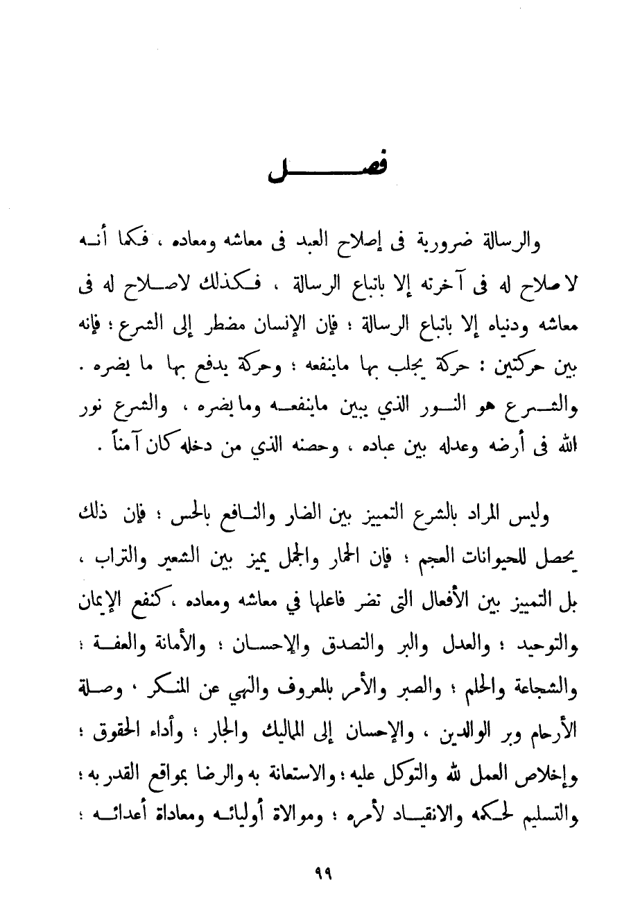 وَالرِّسَالَةُ ضَرُورِيَّةٌ فِي إصْلَاحِ الْعَبْدِ فِي مَعَاشِهِ وَمُعَادِهِ فَكَمَا أَنَّهُ لَا صَلَاحَ لَهُ فِي آخِرَتِهِ إلَّا بِاتِّبَاعِ الرِّسَالَةِ فَكَذَلِكَ لَا صَلَاحَ لَهُ فِي مَعَاشِهِ وَدُنْيَاهُ إلَّا بِاتِّبَاعِ الرِّسَالَةِ؛ فَإِنَّ الْإِنْسَانَ مُضْطَرٌّ إلَى الشَّرْعِ؛ فَإِنَّهُ بَيْنَ حَرَكَتَيْنِ: حَرَكَةٌ يَجْلِبُ بِهَا مَا يَنْفَعُهُ؛ وَحَرَكَةٌ يَدْفَعُ بِهَا مَا يَضُرُّهُ. وَالشَّرْعُ هُوَ النُّورُ الَّذِي يُبَيِّنُ مَا يَنْفَعُهُ وَمَا يَضُرُّهُ وَالشَّرْعُ نُورُ اللَّهِ فِي أَرْضِهِ وَعَدْلِهِ بَيْنَ عِبَادِهِ وَحِصْنِهِ الَّذِي مَنْ دَخَلَهُ كَانَ آمِنًا. وَلَيْسَ الْمُرَادُ بِالشَّرْعِ التَّمْيِيزُ بَيْنَ الضَّارِّ وَالنَّافِعِ بِالْحِسِّ؛ فَإِنَّ ذَلِكَ يَحْصُلُ لِلْحَيَوَانَاتِ الْعُجْمِ؛ فَإِنَّ الْحِمَارَ وَالْجَمَلَ يُمَيِّزُ بِهِ بَيْنَ الشَّعِيرِ وَالتُّرَابِ بَلْ التَّمْيِيزُ بَيْنَ الْأَفْعَالِ الَّتِي تَضُرُّ فَاعِلَهَا فِي مَعَاشِهِ وَمُعَادِهِ كَنَفْعِ الْإِيمَانِ وَالتَّوْحِيدِ؛ وَالْعَدْلِ وَالْبِرِّ وَالتَّصَدُّقِ وَالْإِحْسَانِ؛ وَالْأَمَانَةِ وَالْعِفَّةِ؛ وَالشَّجَاعَةِ وَالْحُلْمِ؛ وَالصَّبْرِ وَالْأَمْرِ بِالْمَعْرُوفِ وَالنَّهْيِ عَنْ الْمُنْكَرِ وَصِلَةِ الْأَرْحَامِ وَبِرِّ الْوَالِدَيْنِ وَالْإِحْسَانِ إلَى الْمَمَالِيكِ وَالْجَارِ؛ وَأَدَاءِ الْحُقُوقِ؛ وَإِخْلَاصِ الْعَمَلِ لِلَّهِ وَالتَّوَكُّلِ عَلَيْهِ؛ وَالِاسْتِعَانَةِ بِهِ وَالرِّضَا بِمَوَاقِعِ الْقَدَرِ بِهِ؛ وَالتَّسْلِيمِ لِحُكْمِهِ وَالِانْقِيَادِ لِأَمْرِهِ؛ وَمُوَالَاةِ أَوْلِيَائِهِ وَمُعَادَاةِ أَعْدَائِهِ؛