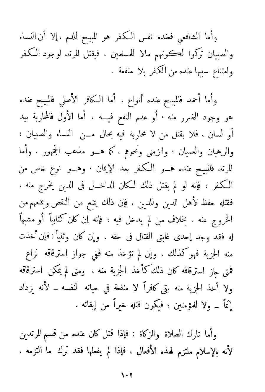 وَأَمَّا الشَّافِعِيُّ فَعِنْدَهُ نَفْسُ الْكُفْرِ هُوَ الْمُبِيحُ لِلدَّمِ إلَّا أَنَّ النِّسَاءَ وَالصِّبْيَانَ تُرِكُوا لِكَوْنِهِمْ مَالًا لِلْمُسْلِمِينَ فَيُقْتَلُ الْمُرْتَدُّ لِوُجُودِ الْكُفْرِ وَامْتِنَاعِ سَبَبِهَا عِنْدَهُ مِنْ الْكُفْرِ بِلَا مَنْفَعَةٍ. وَأَمَّا أَحْمَد فَالْمُبِيحُ عِنْدَهُ أَنْوَاعٌ أَمَّا الْكَافِرُ الْأَصْلِيُّ فَالْمُبِيحُ عِنْدَهُ هُوَ وُجُودُ الضَّرَرِ مِنْهُ أَوْ عَدَمُ النَّفْعِ فِيهِ أَمَّا الْأَوَّلُ فَالْمُحَارَبَةُ بِيَدِ أَوْ لِسَانٍ فَلَا يُقْتَلُ مَنْ لَا مُحَارَبَةَ فِيهِ بِحَالِ مِنْ النِّسَاءِ وَالصِّبْيَانِ؛ وَالرُّهْبَانِ وَالْعُمْيَانِ؛ وَالزَّمْنَى وَنَحْوِهِمْ كَمَا هُوَ مَذْهَبُ الْجُمْهُورِ. وَأَمَّا الْمُرْتَدُّ فَالْمُبِيحُ عِنْدَهُ هُوَ الْكُفْرُ بَعْدَ الْإِيمَانِ وَهُوَ نَوْعٌ خَاصٌّ مِنْ الْكُفْرِ؛ فَإِنَّهُ لَوْ لَمْ يُقْتَلْ ذَلِكَ لَكَانَ الدَّاخِلُ فِي الدِّينِ يَخْرُجُ مِنْهُ فَقَتْلُهُ حِفْظٌ لِأَهْلِ الدِّينِ وَلِلدِّينِ فَإِنَّ ذَلِكَ يَمْنَعُ مِنْ النَّقْصِ وَيَمْنَعُهُمْ مِنْ الْخُرُوجِ عَنْهُ بِخِلَافِ مَنْ لَمْ يَدْخُلْ فِيهِ؛ فَإِنَّهُ إنْ كَانَ كِتَابِيًّا أَوْ مُشْبِهًا لَهُ فَقَدْ وُجِدَ إحْدَى غَايَتَيْ الْقِتَالِ فِي حَقِّهِ وَإِنْ كَانَ وَثَنِيًّا: فَإِنْ أُخِذَتْ مِنْهُ الْجِزْيَةُ فَهُوَ كَذَلِكَ وَإِنْ لَمْ تُؤْخَذْ مِنْهُ فَفِي جَوَازِ اسْتِرْقَاقِهِ نِزَاعٌ فَمَتَى جَازَ اسْتِرْقَاقُهُ كَانَ ذَلِكَ كَأَخْذِ الْجِزْيَةِ مِنْهُ وَمَتَى لَمْ يُمْكِنْ اسْتِرْقَاقُهُ وَلَا أَخْذُ الْجِزْيَةِ مِنْهُ بَقِيَ كَافِرًا لَا مَنْفَعَةَ فِي حَيَاتِهِ لِنَفْسِهِ - لِأَنَّهُ يَزْدَادُ إثْمًا - وَلَا لِلْمُؤْمِنِينَ؛ فَيَكُونُ قَتْلُهُ خَيْرًا مِنْ إبْقَائِهِ. وَأَمَّا تَارِكُ الصَّلَاةِ وَالزَّكَاةِ: فَإِذَا قُتِلَ كَانَ عِنْدَهُ مِنْ قِسْمِ الْمُرْتَدِّينَ لِأَنَّهُ بِالْإِسْلَامِ مُلْتَزِمٌ لِهَذِهِ الْأَفْعَالِ فَإِذَا لَمْ يَفْعَلْهَا فَقَدْ تَرَكَ مَا الْتَزَمَهُ