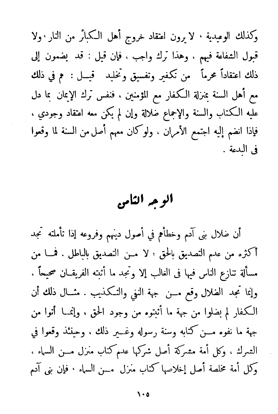 الْوَجْهُ الثَّامِنُ: أَنَّ ضَلَالَ بَنِي آدَمَ وَخَطَأَهُمْ فِي أُصُولِ دِينِهِمْ وَفُرُوعِهِ إذَا تَأَمَّلْته تَجِدُ أَكْثَرَهُ مِنْ عَدَمِ التَّصْدِيقِ بِالْحَقِّ؛ لَا مِنْ التَّصْدِيقِ بِالْبَاطِلِ. فَمَا مِنْ مَسْأَلَةٍ تَنَازَعَ النَّاسُ فِيهَا فِي الْغَالِبِ إلَّا وَتَجِدُ مَا أَثْبَتَهُ الْفَرِيقَانِ صَحِيحًا وَإِنَّمَا تَجِدُ الضَّلَالَ وَقَعَ مِنْ جِهَةِ النَّفْيِ وَالتَّكْذِيبِ. مِثَالُ ذَلِكَ أَنَّ الْكُفَّارَ لَمْ يَضِلُّوا مِنْ جِهَةِ مَا أَثْبَتُوهُ مِنْ وُجُودِ الْحَقِّ وَإِنَّمَا أَتَوْا مِنْ جِهَةِ مَا نَفَوْهُ مِنْ كِتَابِهِ وَسُنَّةِ رَسُولِهِ وَغَيْرِ ذَلِكَ وَحِينَئِذٍ وَقَعُوا فِي الشِّرْكِ وَكُلُّ أُمَّةٍ مُشْرِكَةٍ أَصْلُ شِرْكِهَا عَدَمُ كِتَابٍ مُنَزَّلٍ مِنْ السَّمَاءِ وَكُلُّ أُمَّةٍ مُخْلِصَةٍ أَصْلُ إخْلَاصِهَا كِتَابٌ مُنَزَّلٌ مِنْ السَّمَاءِ فَإِنَّ بَنِي آدَمَ