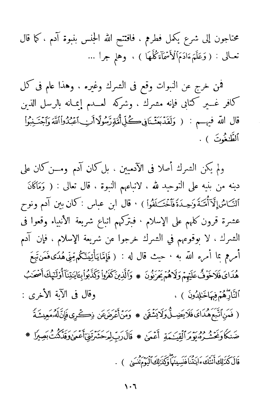 مُحْتَاجُونَ إلَى شَرْعٍ يُكْمِلُ فِطَرَهُمْ فَافْتَتَحَ اللَّهُ الْجِنْسَ بِنُبُوَّةِ آدَمَ كَمَا قَالَ تَعَالَى: {وَعَلَّمَ آدَمَ الْأَسْمَاءَ كُلَّهَا} وَهَلُمَّ جَرَّا. فَمَنْ خَرَجَ عَنْ النُّبُوَّاتِ وَقَعَ فِي الشَّرَكِ وَغَيْرِهِ وَهَذَا عَامٌّ فِي كُلِّ كَافِرٍ غَيْرِ كِتَابِيٍّ فَإِنَّهُ مُشْرِكٌ وَشِرْكُهُ لِعَدَمِ إيمَانِهِ بِالرُّسُلِ الَّذِينَ قَالَ اللَّهُ فِيهِمْ: {وَلَقَدْ بَعَثْنَا فِي كُلِّ أُمَّةٍ رَسُولًا أَنِ اُعْبُدُوا اللَّهَ وَاجْتَنِبُوا الطَّاغُوتَ} . وَلَمْ يَكُنْ الشِّرْكُ أَصْلًا فِي الْآدَمِيِّينَ بَلْ كَانَ آدَمَ وَمَنْ كَانَ عَلَى دِينِهِ مِنْ بَنِيهِ عَلَى التَّوْحِيدِ لِلَّهِ لِاتِّبَاعِهِمْ النُّبُوَّةَ قَالَ تَعَالَى: {وَمَا كَانَ النَّاسُ إلَّا أُمَّةً وَاحِدَةً فَاخْتَلَفُوا} قَالَ ابْنُ عَبَّاسٍ: كَانَ بَيْنَ آدَمَ وَنُوحٍ عَشَرَةُ قُرُونٍ كُلُّهُمْ عَلَى الْإِسْلَامِ فَبِتَرْكِهِمْ اتِّبَاعَ شَرِيعَةِ الْأَنْبِيَاءِ وَقَعُوا فِي الشِّرْكِ لَا بِوُقُوعِهِمْ فِي الشِّرْكِ خَرَجُوا عَنْ شَرِيعَةِ الْإِسْلَامِ فَإِنَّ آدَمَ أَمَرَهُمْ بِمَا أَمَرَهُ اللَّهُ بِهِ حَيْثُ قَالَ لَهُ: {فَإِمَّا يَأْتِيَنَّكُمْ مِنِّي هُدًى فَمَنْ تَبِعَ هُدَايَ فَلَا خَوْفٌ عَلَيْهِمْ وَلَا هُمْ يَحْزَنُونَ} {وَالَّذِينَ كَفَرُوا وَكَذَّبُوا بِآيَاتِنَا أُولَئِكَ أَصْحَابُ النَّارِ هُمْ فِيهَا خَالِدُونَ} وَقَالَ فِي الْآيَةِ الْأُخْرَى: {فَمَنِ اتَّبَعَ هُدَايَ فَلَا يَضِلُّ وَلَا يَشْقَى} {وَمَنْ أَعْرَضَ عَنْ ذِكْرِي فَإِنَّ لَهُ مَعِيشَةً ضَنْكًا وَنَحْشُرُهُ يَوْمَ الْقِيَامَةِ أَعْمَى} {قَالَ رَبِّ لِمَ حَشَرْتَنِي أَعْمَى وَقَدْ كُنْتُ بَصِيرًا} {قَالَ كَذَلِكَ أَتَتْكَ آيَاتُنَا فَنَسِيتَهَا وَكَذَلِكَ الْيَوْمَ تُنْسَى} .