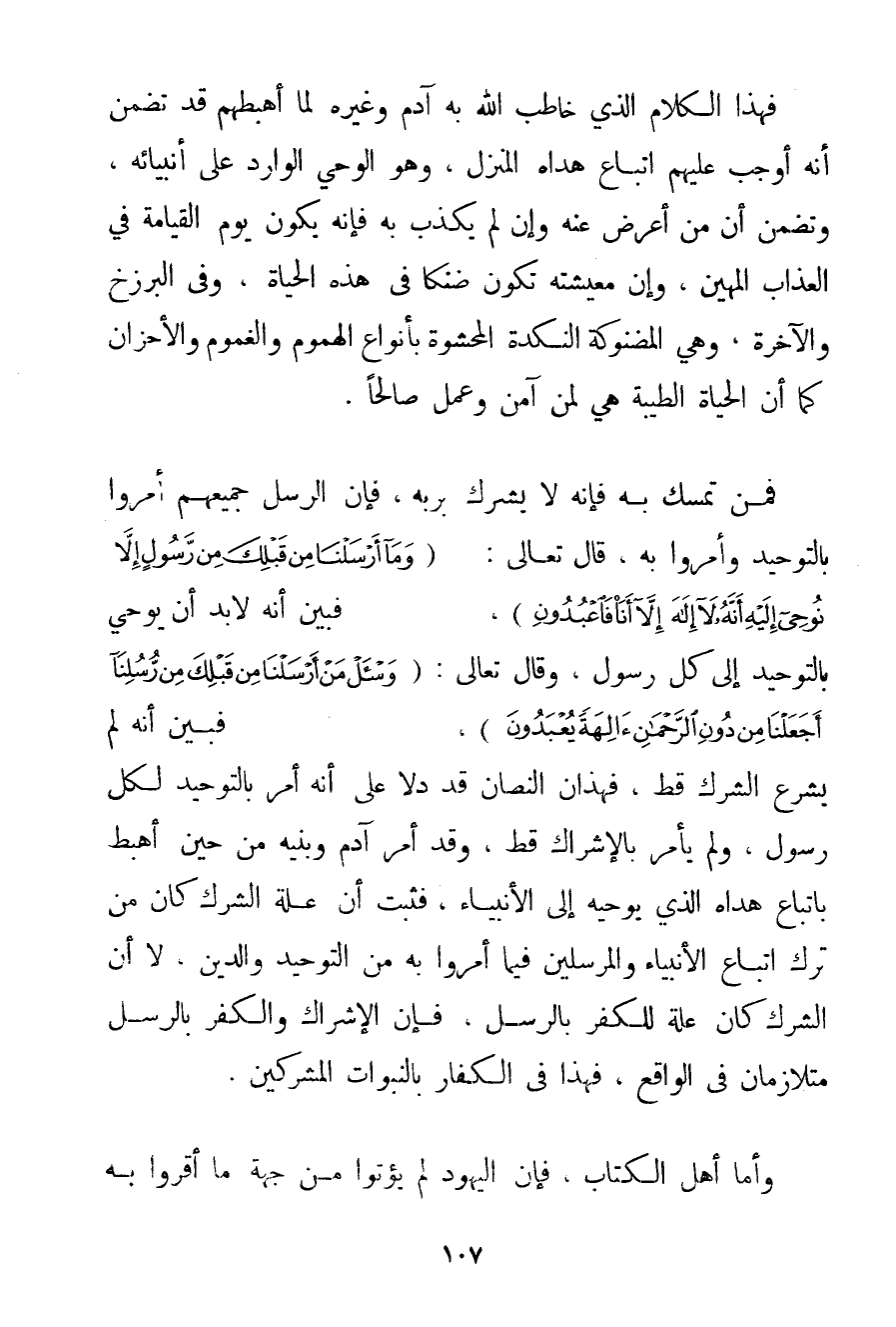 فَهَذَا الْكَلَامُ الَّذِي خَاطَبَ اللَّهُ بِهِ آدَمَ وَغَيْرَهُ لَمَّا أهبطهم قَدْ تَضَمَّنَ أَنَّهُ أَوْجَبَ عَلَيْهِمْ اتِّبَاعَ هُدَاهُ الْمُنَزَّلِ وَهُوَ الْوَحْيُ الْوَارِدُ عَلَى أَنْبِيَائِهِ وَتَضَمَّنَ أَنَّ مَنْ أَعْرَضَ عَنْهُ وَإِنْ لَمْ يُكَذِّبْ بِهِ فَإِنَّهُ يَكُونُ يَوْمَ الْقِيَامَةِ فِي الْعَذَابِ الْمُهِينِ وَإِنَّ مَعِيشَتَهُ تَكُونُ ضَنْكًا فِي هَذِهِ الْحَيَاةِ وَفِي الْبَرْزَخِ وَالْآخِرَةِ وَهِيَ الْمَضْنُوكَةُ النَّكِدَةُ الْمَحْشُوَّةُ بِأَنْوَاعِ الْهُمُومِ وَالْغُمُومِ وَالْأَحْزَانِ كَمَا أَنَّ الْحَيَاةَ الطَّيِّبَةَ هِيَ لِمَنْ آمَنَ وَعَمِلَ صَالِحًا. فَمَنْ تَمَسَّكَ بِهِ فَإِنَّهُ لَا يُشْرِكُ بِرَبِّهِ فَإِنَّ الرُّسُلَ جَمِيعَهُمْ أَمَرُوا بِالتَّوْحِيدِ وَأُمِرُوا بِهِ قَالَ تَعَالَى: {وَمَا أَرْسَلْنَا مِنْ قَبْلِكَ مِنْ رَسُولٍ إلَّا نُوحِي إلَيْهِ أَنَّهُ لَا إلَهَ إلَّا أَنَا فَاعْبُدُونِ} فَبَيَّنَ أَنَّهُ لَا بُدَّ أَنْ يُوحِيَ بِالتَّوْحِيدِ إلَى كُلِّ رَسُولٍ وَقَالَ تَعَالَى: {وَاسْأَلْ مَنْ أَرْسَلْنَا مِنْ قَبْلِكَ مِنْ رُسُلِنَا أَجَعَلْنَا مِنْ دُونِ الرَّحْمَنِ آلِهَةً يُعْبَدُونَ} فَبَيَّنَ أَنَّهُ لَمْ يَشْرَعْ الشِّرْكَ قَطُّ فَهَذَانِ النَّصَّانِ قَدْ دَلَّا عَلَى أَنَّهُ أَمَرَ بِالتَّوْحِيدِ لِكُلِّ رَسُولٍ وَلَمْ يَأْمُرْ بِالْإِشْرَاكِ قَطُّ وَقَدْ أَمَرَ آدَمَ وَبَنِيهِ مِنْ حِينِ أُهْبِطَ بِاتِّبَاعِ هُدَاهُ الَّذِي يُوحِيهِ إلَى الْأَنْبِيَاءِ فَثَبَتَ أَنَّ عِلَّةَ الشِّرْكِ كَانَ مِنْ تَرْكِ اتِّبَاعِ الْأَنْبِيَاءِ وَالْمُرْسَلِينَ فِيمَا أَمَرُوا بِهِ مِنْ التَّوْحِيدِ وَالدِّينِ لَا أَنَّ الشِّرْكَ كَانَ عِلَّةً لِلْكُفْرِ بِالرُّسُلِ فَإِنَّ الْإِشْرَاكَ وَالْكُفْرَ بِالرُّسُلِ مُتَلَازِمَانِ فِي الْوَاقِعِ فَهَذَا فِي الْكُفَّارِ بِالنُّبُوَّاتِ الْمُشْرِكِينَ. وَأَمَّا أَهْلُ الْكِتَابِ فَإِنَّ الْيَهُودَ لَمْ يُؤْتُوا مِنْ جِهَةِ مَا أَقَرُّوا بِهِ