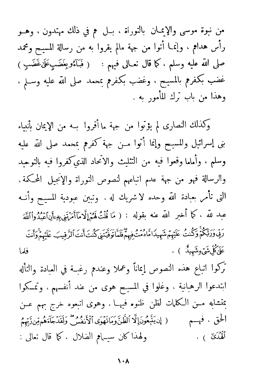 مِنْ نُبُوَّةِ مُوسَى وَالْإِيمَانِ بِالتَّوْرَاةِ بَلْ هُمْ فِي ذَلِكَ مُهْتَدُونَ وَهُوَ رَأْسُ هُدَاهُمْ وَإِنَّمَا أُتُوا مِنْ جِهَةِ مَا لَمْ يُقِرُّوا بِهِ مِنْ رِسَالَةِ الْمَسِيحِ وَمُحَمَّدٍ صَلَّى اللَّهُ عَلَيْهِ وَسَلَّمَ كَمَا قَالَ تَعَالَى فِيهِمْ: {فَبَاءُوا بِغَضَبٍ عَلَى غَضَبٍ} غَضَبٌ بِكُفْرِهِمْ بِالْمَسِيحِ وَغَضَبٌ بِكُفْرِهِمْ بِمُحَمَّدِ صَلَّى اللَّهُ عَلَيْهِ وَسَلَّمَ وَهَذَا مِنْ بَابِ تَرْكِ الْمَأْمُورِ بِهِ. وَكَذَلِكَ النَّصَارَى لَمْ يُؤْتُوا مِنْ جِهَةِ مَا أَقَرُّوا بِهِ مِنْ الْإِيمَانِ بِأَنْبِيَاءِ بَنِي إسْرَائِيلَ وَالْمَسِيحِ وَإِنَّمَا أُتُوا مِنْ جِهَةِ كُفْرِهِمْ بِمُحَمَّدِ صَلَّى اللَّهُ عَلَيْهِ وَسَلَّمَ وَأَمَّا مَا وَقَعُوا فِيهِ مِنْ التَّثْلِيثِ وَالِاتِّحَادِ الَّذِي كَفَرُوا فِيهِ بِالتَّوْحِيدِ وَالرِّسَالَةِ فَهُوَ مِنْ جِهَةِ عَدَمِ اتِّبَاعِهِمْ لِنُصُوصِ التَّوْرَاةِ وَالْإِنْجِيلِ الْمُحْكَمَةِ الَّتِي تَأْمُرُ بِعِبَادَةِ اللَّهِ وَحْدَهُ لَا شَرِيكَ لَهُ وَتُبَيِّنُ عُبُودِيَّةَ الْمَسِيحِ وَأَنَّهُ عَبْدٌ لِلَّهِ كَمَا أَخْبَرَ اللَّهُ عَنْهُ بِقَوْلِهِ: {مَا قُلْتُ لَهُمْ إلَّا مَا أَمَرْتَنِي بِهِ أَنِ اعْبُدُوا اللَّهَ رَبِّي وَرَبَّكُمْ وَكُنْتُ عَلَيْهِمْ شَهِيدًا مَا دُمْتُ فِيهِمْ فَلَمَّا تَوَفَّيْتَنِي كُنْتَ أَنْتَ الرَّقِيبَ عَلَيْهِمْ وَأَنْتَ عَلَى كُلِّ شَيْءٍ شَهِيدٌ} فَلَمَّا تَرَكُوا اتِّبَاعَ هَذِهِ النُّصُوصِ إيمَانًا وَعَمَلًا وَعِنْدَهُمْ رَغْبَةٌ فِي الْعِبَادَةِ وَالتَّأَلُّهِ ابْتَدَعُوا الرَّهْبَانِيَّةَ وَغَلَوْا فِي الْمَسِيحِ هَوًى مِنْ عِنْدِ أَنْفُسِهِمْ وَتَمَسَّكُوا بِمُتَشَابِهِ مِنْ الْكَلِمَاتِ لِظَنِّ ظَنُّوهُ فِيهَا وَهَوًى اتَّبَعُوهُ خَرَجَ بِهِمْ عَنْ الْحَقِّ فَهُمْ {إنْ يَتَّبِعُونَ إلَّا الظَّنَّ وَمَا تَهْوَى الْأَنْفُسُ وَلَقَدْ جَاءَهُمْ مِنْ رَبِّهِمُ الْهُدَى} وَلِهَذَا كَانَ سِيمَاهُمْ الضَّلَالَ كَمَا قَالَ تَعَالَى: