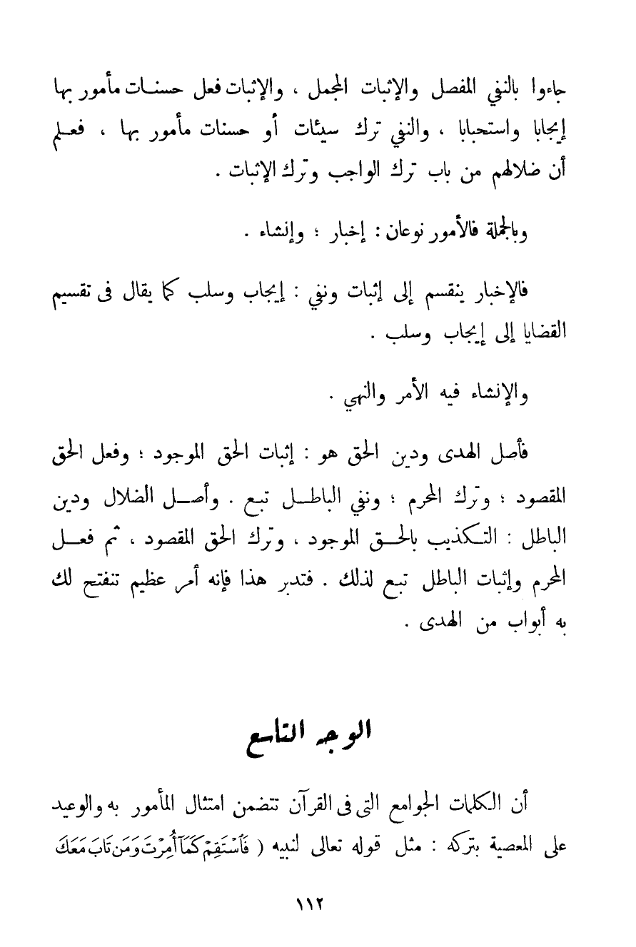الْوَجْهُ التَّاسِعُ: أَنَّ الْكَلِمَاتِ الْجَوَامِعَ الَّتِي فِي الْقُرْآنِ تَتَضَمَّنُ امْتِثَالَ الْمَأْمُورِ بِهِ وَالْوَعِيدَ عَلَى الْمَعْصِيَةِ بِتَرْكِهِ: مِثْلَ قَوْله تَعَالَى لِنَبِيِّهِ {فَاسْتَقِمْ كَمَا أُمِرْتَ وَمَنْ تَابَ