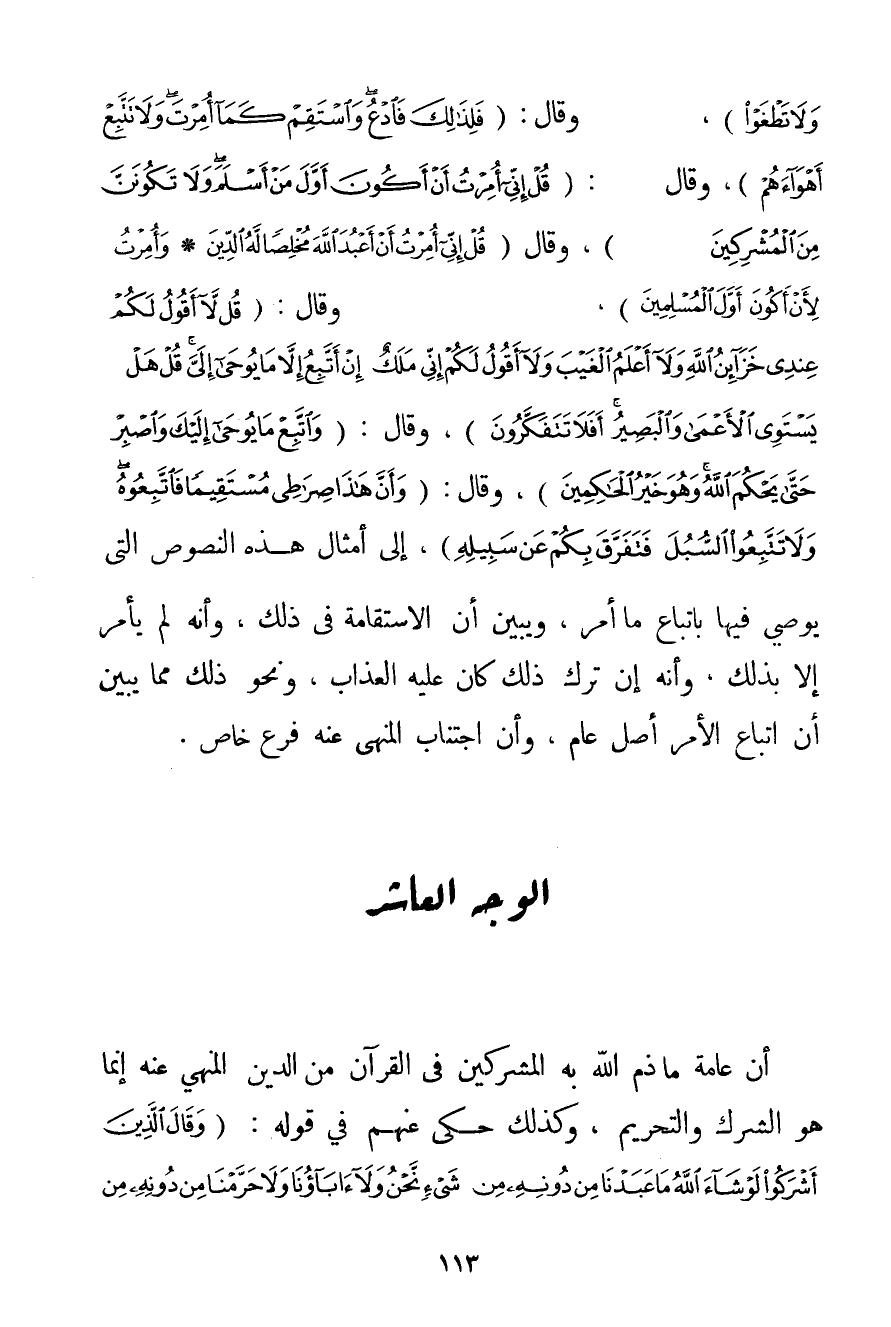 مَعَكَ وَلَا تَطْغَوْا} وَقَالَ: {فَلِذَلِكَ فَادْعُ وَاسْتَقِمْ كَمَا أُمِرْتَ وَلَا تَتَّبِعْ أَهْوَاءَهُمْ} وَقَالَ: {قُلْ إنِّي أُمِرْتُ أَنْ أَكُونَ أَوَّلَ مَنْ أَسْلَمَ وَلَا تَكُونَنَّ مِنَ الْمُشْرِكِينَ} وَقَالَ {قُلْ إنِّي أُمِرْتُ أَنْ أَعْبُدَ اللَّهَ مُخْلِصًا لَهُ الدِّينَ} {وَأُمِرْتُ لِأَنْ أَكُونَ أَوَّلَ الْمُسْلِمِينَ} وَقَالَ: {وَلَا أَقُولُ لَكُمْ عِنْدِي خَزَائِنُ اللَّهِ وَلَا أَعْلَمُ الْغَيْبَ وَلَا أَقُولُ لَكُمْ إنِّي مَلَكٌ إنْ أَتَّبِعُ إلَّا مَا يُوحَى إلَيَّ قُلْ هَلْ يَسْتَوِي الْأَعْمَى وَالْبَصِيرُ أَفَلَا تَتَفَكَّرُونَ} وَقَالَ: {وَاتَّبِعْ مَا يُوحَى إلَيْكَ وَاصْبِرْ حَتَّى يَحْكُمَ اللَّهُ وَهُوَ خَيْرُ الْحَاكِمِينَ} وَقَالَ: {وَأَنَّ هَذَا صِرَاطِي مُسْتَقِيمًا فَاتَّبِعُوهُ وَلَا تَتَّبِعُوا السُّبُلَ فَتَفَرَّقَ بِكُمْ عَنْ سَبِيلِهِ} إلَى أَمْثَالِ هَذِهِ النُّصُوصِ الَّتِي يُوصِي فِيهَا بِاتِّبَاعِ مَا أَمَرَ وَيُبَيِّنُ أَنَّ الِاسْتِقَامَةَ فِي ذَلِكَ وَأَنَّهُ لَمْ يَأْمُرْ إلَّا بِذَلِكَ وَأَنَّهُ إنْ تَرَكَ ذَلِكَ كَانَ عَلَيْهِ الْعَذَابُ وَنَحْوُ ذَلِكَ مِمَّا يُبَيِّنُ أَنَّ اتِّبَاعَ الْأَمْرِ أَصْلٌ عَامٌّ وَأَنَّ اجْتِنَابَ الْمَنْهِيِّ عَنْهُ فَرْعٌ خَاصٌّ.