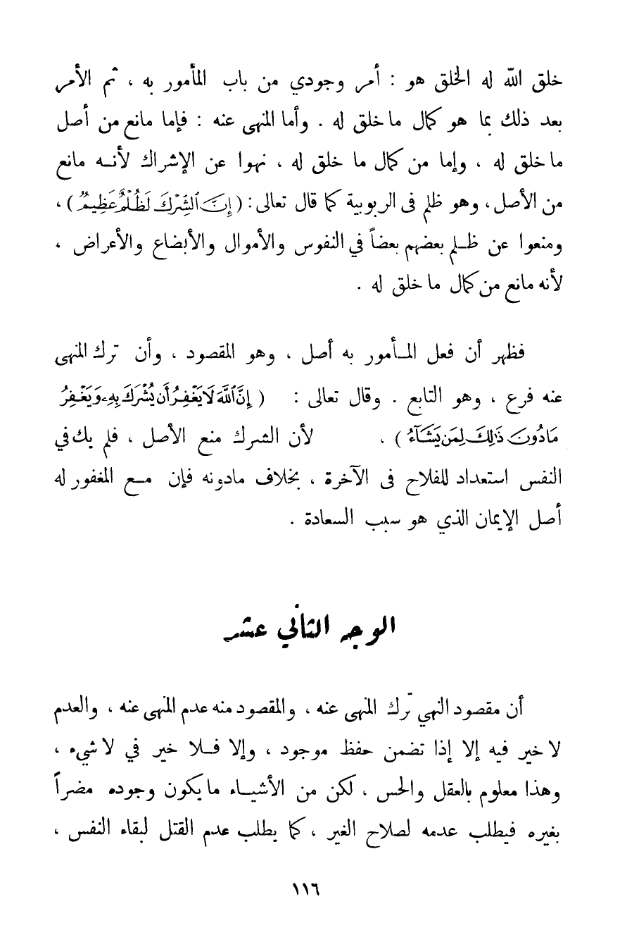 خَلَقَ اللَّهُ لَهُ الْخَلْقَ هُوَ: أَمْرٌ وُجُودِيٌّ مِنْ بَابِ الْمَأْمُورِ بِهِ ثُمَّ الْأَمْرُ بَعْدَ ذَلِكَ بِمَا هُوَ كَمَالُ مَا خُلِقَ لَهُ. وَأَمَّا الْمَنْهِيُّ عَنْهُ: فَإِمَّا مَانِعٌ مِنْ أَصْلِ مَا خُلِقَ لَهُ وَإِمَّا مِنْ كَمَالِ مَا خُلِقَ لَهُ نُهُوا عَنْ الْإِشْرَاكِ لِأَنَّهُ مَانِعٌ مِنْ الْأَصْلِ وَهُوَ ظُلْمٌ فِي الرُّبُوبِيَّةِ كَمَا قَالَ تَعَالَى: {إنَّ الشِّرْكَ لَظُلْمٌ عَظِيمٌ} وَمُنِعُوا عَنْ ظُلْمِ بَعْضِهِمْ بَعْضًا فِي النُّفُوسِ وَالْأَمْوَالِ وَالْأَبْضَاعِ وَالْأَعْرَاضِ لِأَنَّهُ مَانِعٌ مِنْ كَمَالِ مَا خُلِقَ لَهُ. فَظَهَرَ أَنَّ فِعْلَ الْمَأْمُورِ بِهِ أَصْلٌ وَهُوَ الْمَقْصُودُ وَأَنَّ تَرْكَ الْمَنْهِيِّ عَنْهُ فَرْعٌ وَهُوَ التَّابِعُ. وَقَالَ تَعَالَى: {إنَّ اللَّهَ لَا يَغْفِرُ أَنْ يُشْرَكَ بِهِ وَيَغْفِرُ مَا دُونَ ذَلِكَ لِمَنْ يَشَاءُ} لِأَنَّ الشِّرْكَ مَنْعُ الْأَصْلِ فَلَمْ يَكُ فِي النَّفْسِ اسْتِعْدَادٌ لِلْفَلَاحِ فِي الْآخِرَةِ بِخِلَافِ مَا دُونِهِ فَإِنَّ مَعَ الْمَغْفُورِ لَهُ أَصْلَ الْإِيمَانِ الَّذِي هُوَ سَبَبُ السَّعَادَةِ.