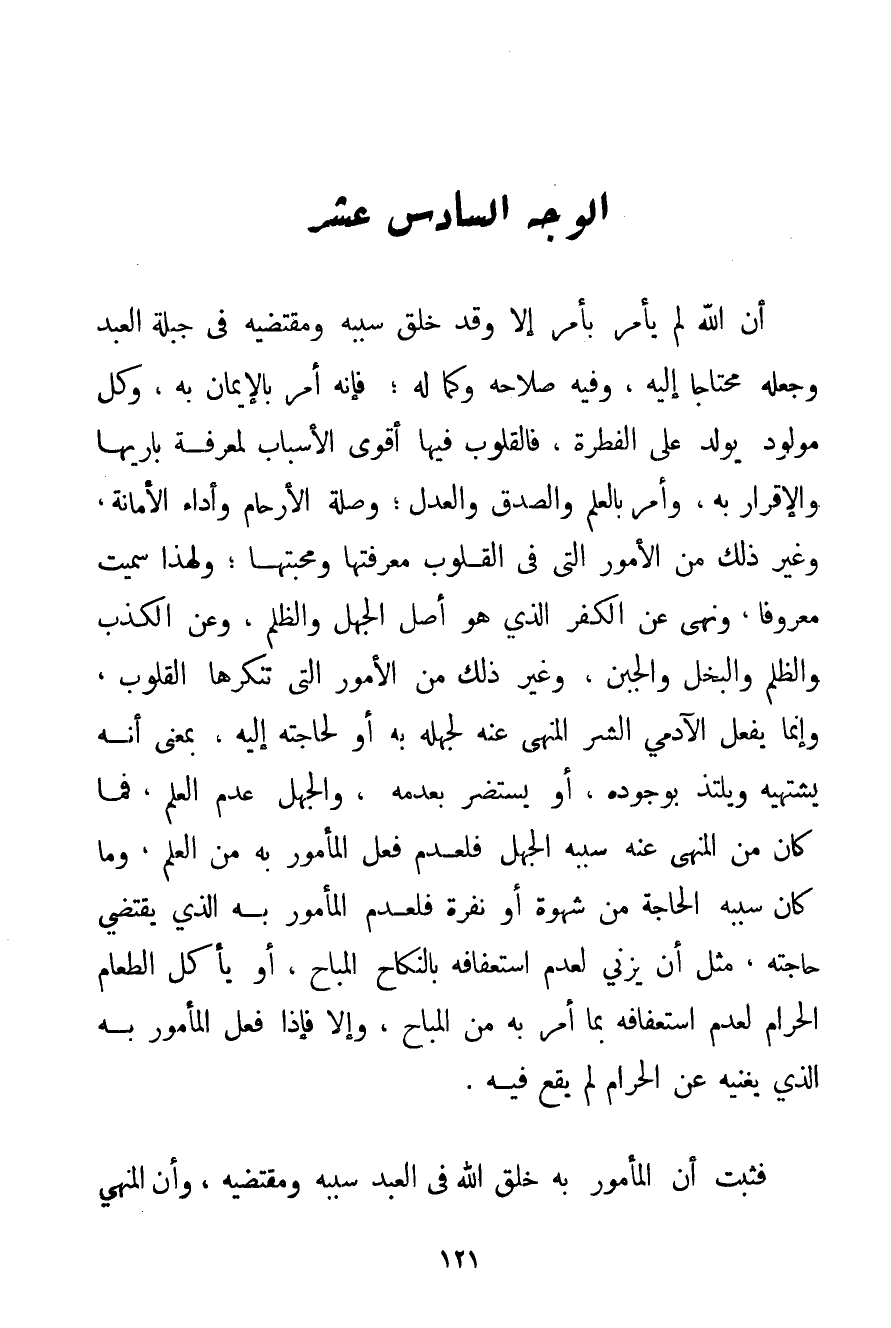 الْوَجْهُ السَّادِسَ عَشَرَ: أَنَّ اللَّهَ لَمْ يَأْمُرْ بِأَمْرِ إلَّا وَقَدْ خَلَقَ سَبَبَهُ وَمُقْتَضِيَهُ فِي جِبِلَّةِ الْعَبْدِ وَجَعَلَهُ مُحْتَاجًا إلَيْهِ وَفِيهِ صَلَاحُهُ وَكَمَالُهُ؛ فَإِنَّهُ أَمَرَ بِالْإِيمَانِ بِهِ وَكُلُّ مَوْلُودٍ يُولَدُ عَلَى الْفِطْرَةِ فَالْقُلُوبُ فِيهَا أَقْوَى الْأَسْبَابِ لِمَعْرِفَةِ بَارِيهَا وَالْإِقْرَارِ بِهِ وَأَمَرَ بِالْعِلْمِ وَالصِّدْقِ وَالْعَدْلِ؛ وَصِلَةِ الْأَرْحَامِ وَأَدَاءِ الْأَمَانَةِ وَغَيْرِ ذَلِكَ مِنْ الْأُمُورِ الَّتِي فِي الْقُلُوبِ مَعْرِفَتُهَا وَمَحَبَّتُهَا؛ وَلِهَذَا سُمِّيَتْ مَعْرُوفًا وَنَهَى عَنْ الْكُفْرِ الَّذِي هُوَ أَصْلُ الْجَهْلِ وَالظُّلْمِ وَعَنْ الْكَذِبِ وَالظُّلْمِ وَالْبُخْلِ وَالْجُبْنِ وَغَيْرِ ذَلِكَ مِنْ الْأُمُورِ الَّتِي تُنْكِرُهَا الْقُلُوبُ وَإِنَّ مَا يَفْعَلُ الْآدَمِيُّ الشَّرَّ الْمَنْهِيَّ عَنْهُ لِجَهْلِهِ بِهِ أَوْ لِحَاجَتِهِ إلَيْهِ بِمَعْنَى أَنَّهُ يَشْتَهِيهِ وَيَلْتَذُّ بِوُجُودِهِ أَوْ يَسْتَضِرُّ بِعَدَمِهِ وَالْجَهْلُ عَدَمُ الْعِلْمِ فَمَا كَانَ مِنْ الْمَنْهِيِّ عَنْهُ سَبَبُهُ الْجَهْلُ فَلِعَدَمِ فِعْلِ الْمَأْمُورِ بِهِ مِنْ الْعِلْمِ وَمَا كَانَ سَبَبُهُ الْحَاجَةَ مِنْ شَهْوَةٍ أَوْ نَفْرَةٍ فَلِعَدَمِ الْمَأْمُورِ بِهِ الَّذِي يَقْتَضِي حَاجَتَهُ مِثْلَ أَنْ يَزْنِيَ لِعَدَمِ اسْتِعْفَافِهِ بِالنِّكَاحِ الْمُبَاحِ أَوْ يَأْكُلَ الطَّعَامَ الْحَرَامَ لِعَدَمِ اسْتِعْفَافِهِ بِمَا أُمِرَ بِهِ مِنْ الْمُبَاحِ وَإِلَّا فَإِذَا فَعَلَ الْمَأْمُورَ بِهِ الَّذِي يُغْنِيهِ عَنْ الْحَرَامِ لَمْ يَقَعْ فِيهِ. فَثَبَتَ أَنَّ الْمَأْمُورَ بِهِ خَلَقَ اللَّهُ فِي الْعَبْدِ سَبَبَهُ وَمُقْتَضِيَهُ وَأَنَّ الْمَنْهِيَّ