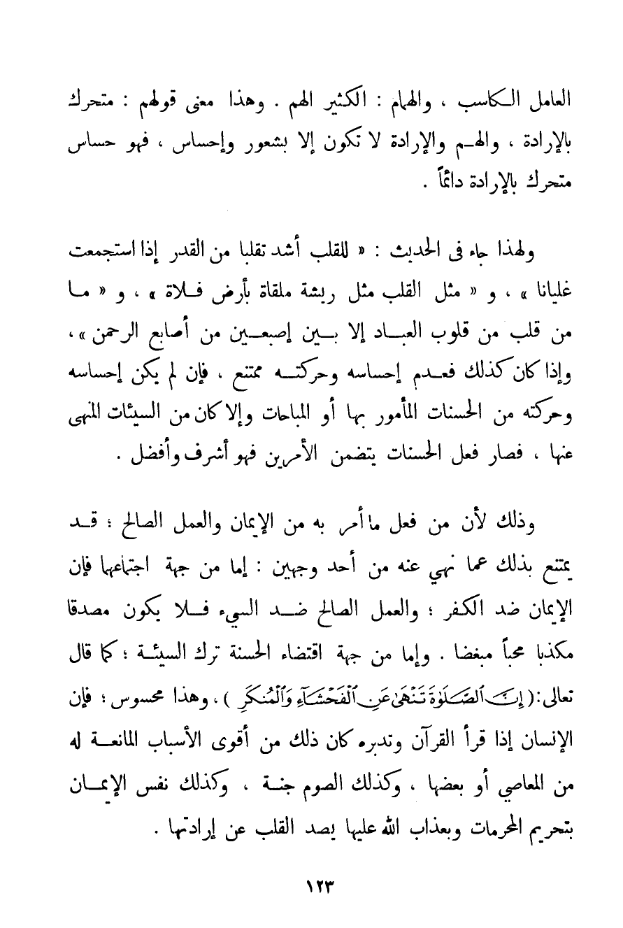 الْعَامِلُ الْكَاسِبُ وَالْهَمَّامُ: الْكَثِيرُ الْهَمِّ. وَهَذَا مَعْنَى قَوْلِهِمْ: مُتَحَرِّكٌ بِالْإِرَادَةِ وَالْهَمِّ وَالْإِرَادَةُ لَا تَكُونُ إلَّا بِشُعُورِ وَإِحْسَاسٍ فَهُوَ حَسَّاسٌ مُتَحَرِّكٌ بِالْإِرَادَةِ دَائِمًا. وَلِهَذَا جَاءَ فِي الْحَدِيثِ: " {لَلْقَلْبُ أَشَدُّ تَقَلُّبًا مِنْ الْقِدْرِ إذَا اسْتَجْمَعَتْ غَلَيَانًا} " وَ " {مَثَلُ الْقَلْبِ مَثَلُ رِيشَةٍ مُلْقَاةٍ بِأَرْضِ فَلَاةٍ} " وَ " {مَا مِنْ قَلْبٍ مِنْ قُلُوبِ الْعِبَادِ إلَّا بَيْنَ إصْبَعَيْنِ مِنْ أَصَابِعِ الرَّحْمَنِ} " وَإِذَا كَانَ كَذَلِكَ فَعَدَمُ إحْسَاسِهِ وَحَرَكَتِهِ مُمْتَنِعٌ فَإِنْ لَمْ يَكُنْ إحْسَاسُهُ وَحَرَكَتُهُ مِنْ الْحَسَنَاتِ الْمَأْمُورِ بِهَا أَوْ الْمُبَاحَاتِ وَإِلَّا كَانَ مِنْ السَّيِّئَاتِ الْمَنْهِيِّ عَنْهَا فَصَارَ فِعْلُ الْحَسَنَاتِ يَتَضَمَّنُ الْأَمْرَيْنِ فَهُوَ أَشْرَفُ وَأَفْضَلُ. وَذَلِكَ لِأَنَّ مَنْ فَعَلَ مَا أُمِرَ بِهِ مِنْ الْإِيمَانِ وَالْعَمَلِ الصَّالِحِ: قَدْ يَمْتَنِعُ بِذَلِكَ عَمَّا نُهِيَ عَنْهُ مِنْ أَحَدِ وَجْهَيْنِ: إمَّا مِنْ جِهَةِ اجْتِمَاعِهِمَا فَإِنَّ الْإِيمَانَ ضِدُّ الْكُفْرِ؛ وَالْعَمَلُ الصَّالِحُ ضِدُّ السَّيِّئِ فَلَا يَكُونُ مُصَدِّقًا مُكَذِّبًا مُحِبًّا مُبْغِضًا. وَإِمَّا مِنْ جِهَةِ اقْتِضَاءِ الْحَسَنَةِ تَرْكَ السَّيِّئَةِ؛ كَمَا قَالَ تَعَالَى: {إنَّ الصَّلَاةَ تَنْهَى عَنِ الْفَحْشَاءِ وَالْمُنْكَرِ} وَهَذَا مَحْسُوسٌ؛ فَإِنَّ الْإِنْسَانَ إذَا قَرَأَ الْقُرْآنَ وَتَدَبَّرَهُ كَانَ ذَلِكَ مِنْ أَقْوَى الْأَسْبَابِ الْمَانِعَةِ لَهُ مِنْ الْمَعَاصِي أَوْ بَعْضِهَا وَكَذَلِكَ الصَّوْمُ جُنَّةٌ وَكَذَلِكَ نَفْسُ الْإِيمَانِ بِتَحْرِيمِ الْمُحَرَّمَاتِ وَبِعَذَابِ اللَّهِ عَلَيْهَا بِصَدِّ الْقَلْبِ عَنْ إرَادَتِهَا.