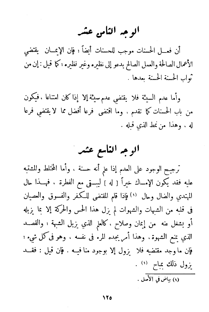 الْوَجْهُ التَّاسِعَ عَشَرَ: تَرْجِيحُ الْوُجُودِ عَلَى الْعَدَمِ إذَا عُلِمَ أَنَّهُ حَسَنَةٌ وَأَمَّا الْمُخْتَلِطُ وَالْمُشْتَبِهُ عَلَيْهِ فَقَدْ يَكُونُ الْإِمْسَاكُ خَيْرًا لَهُ لِيَبْقَى مَعَ الْفِطْرَةِ فَهَذَا حَالُ الْمُهْتَدِي وَالضَّالِّ وَحَالُ. . . (1) فَإِذَا قَامَ الْمُقْتَضِي لِلْكُفْرِ وَالْفُسُوقِ وَالْعِصْيَانِ فِي قَلْبِهِ مِنْ الشُّبُهَاتِ وَالشَّهَوَاتِ لَمْ يَزَلْ هَذَا الْحِسُّ وَالْحَرَكَةُ إلَّا بِمَا يُزِيلُهُ أَوْ يَشْتَغِلُ عَنْهُ مِنْ إيمَانٍ وَصَلَاحٍ كَالْعِلْمِ الَّذِي يُزِيلُ الشُّبْهَةَ؛ وَالْقَصْدُ الَّذِي يَمْنَعُ الشَّهْوَةَ وَهَذَا أَمْرٌ يَجِدُهُ الْمَرْءُ فِي نَفْسِهِ وَهُوَ فِي كُلِّ شَيْءٍ؛ فَإِنَّ مَا وُجِدَ مُقْتَضِيهِ فَلَا يَزُولُ إلَّا بِوُجُودِ مُنَافِيهِ. فَإِنْ قِيلَ: فَقَدْ يَزُولُ ذَلِكَ بِمُبَاحِ. . . (2) .