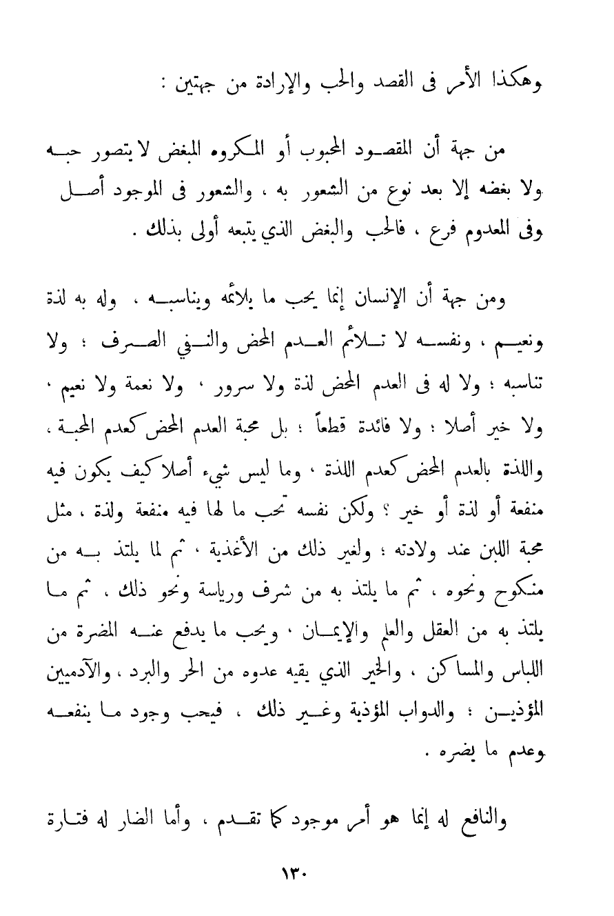 وَهَكَذَا الْأَمْرُ فِي الْقَصْدِ وَالْحُبِّ وَالْإِرَادَةِ مِنْ جِهَتَيْنِ: مِنْ جِهَةِ أَنَّ الْمَقْصُودَ الْمَحْبُوبَ أَوْ الْمَكْرُوهَ الْمُبْغِضَ لَا يُتَصَوَّرُ حُبُّهُ وَلَا بُغْضُهُ إلَّا بَعْدَ نَوْعٍ مِنْ الشُّعُورِ بِهِ وَالشُّعُورُ فِي الْمَوْجُودِ أَصْلٌ؛ وَفِي الْمَعْدُومِ فَرْعٌ فَالْحُبُّ وَالْبُغْضُ الَّذِي يَتْبَعُهُ أَوْلَى بِذَلِكَ. وَمِنْ جِهَةِ أَنَّ الْإِنْسَانَ إنَّمَا يُحِبُّ مَا يُلَائِمُهُ وَيُنَاسِبُهُ وَلَهُ بِهِ لَذَّةٌ وَنَعِيمٌ وَنَفْسُهُ لَا تُلَائِمُ الْعَدَمَ الْمَحْضَ وَالنَّفْيَ الصِّرْفَ؛ وَلَا تُنَاسِبُهُ؛ وَلَا لَهُ فِي الْعَدَمِ الْمَحْضِ لَذَّةٌ وَلَا سُرُورٌ وَلَا نِعْمَةٌ وَلَا نَعِيمٌ وَلَا خَيْرَ أَصْلًا؛ وَلَا فَائِدَةٌ قَطْعًا؛ بَلْ مَحَبَّةُ الْعَدَمِ الْمَحْضِ كَعَدَمِ الْمَحَبَّةِ وَاللَّذَّةُ بِالْعَدَمِ الْمَحْضِ كَعَدَمِ اللَّذَّةِ وَمَا لَيْسَ شَيْءٌ أَصْلًا كَيْفَ يَكُونُ فِيهِ مَنْفَعَةٌ أَوْ لَذَّةٌ أَوْ خَيْرٌ؟ وَلَكِنَّ نَفْسَهُ تُحِبُّ مَا لَهَا فِيهِ مَنْفَعَةٌ وَلَذَّةٌ مِثْلَ مَحَبَّةِ اللَّبَنِ عِنْدَ وِلَادَتِهِ؛ وَلِغَيْرِ ذَلِكَ مِنْ الْأَغْذِيَةِ ثُمَّ لِمَا يَلْتَذُّ بِهِ مِنْ مَنْكُوحٍ وَنَحْوِهِ ثُمَّ مَا يَلْتَذُّ بِهِ مِنْ شَرَفٍ وَرِيَاسَةٍ وَنَحْوِ ذَلِكَ ثُمَّ مَا يَلْتَذُّ بِهِ مِنْ الْعَقْلِ وَالْعِلْمِ وَالْإِيمَانِ وَيُحِبُّ مَا يَدْفَعُ عَنْهُ الْمَضَرَّةَ مِنْ اللِّبَاسِ وَالْمَسَاكِنِ وَالْخَيْرِ الَّذِي يَقِيهِ عَدُوَّهُ مِنْ الْحَرِّ وَالْبَرْدِ وَالْآدَمِيِّينَ الْمُؤْذِينَ؛ وَالدَّوَابِّ الْمُؤْذِيَةِ وَغَيْرِ ذَلِكَ فَيُحِبُّ وُجُودَ مَا يَنْفَعُهُ وَعَدَمَ مَا يَضُرُّهُ. وَالنَّافِعُ لَهُ إنَّمَا هُوَ أَمْرٌ مَوْجُودٌ كَمَا تَقَدَّمَ وَأَمَّا الضَّارُّ لَهُ فَتَارَةً