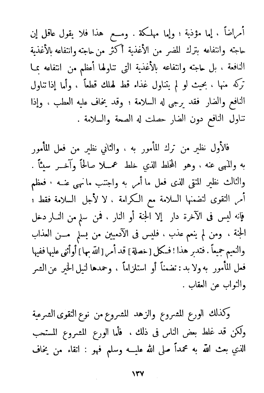أَمْرَاضًا إمَّا مُؤْذِيَةً؛ وَإِمَّا مُهْلِكَةً. وَمَعَ هَذَا فَلَا يَقُولُ عَاقِلٌ إنَّ حَاجَتَهُ وَانْتِفَاعَهُ بِتَرْكِ الْمُضِرِّ مِنْ الْأَغْذِيَةِ أَكْثَرُ مِنْ حَاجَتِهِ وَانْتِفَاعِهِ بِالْأَغْذِيَةِ النَّافِعَةِ بَلْ حَاجَتُهُ وَانْتِفَاعُهُ بِالْأَغْذِيَةِ الَّتِي تَنَاوَلَهَا أَعْظَمُ مِنْ انْتِفَاعِهِ بِمَا تَرَكَهُ مِنْهَا بِحَيْثُ لَوْ لَمْ يَتَنَاوَلْ غِذَاءً قَطُّ لَهَلَكَ قَطْعًا وَأَمَّا إذَا تَنَاوَلَ النَّافِعَ وَالضَّارَّ فَقَدْ يُرْجَى لَهُ السَّلَامَةُ؛ وَقَدْ يُخَافُ عَلَيْهِ الْعَطَبُ وَإِذَا تَنَاوَلَ النَّافِعَ دُونَ الضَّارِّ حَصَلَتْ لَهُ الصِّحَّةُ وَالسَّلَامَةُ. فَالْأَوَّلُ نَظِيرُ مَنْ تَرَكَ الْمَأْمُورَ بِهِ وَالثَّانِي نَظِيرُ مَنْ فَعَلَ الْمَأْمُورَ بِهِ وَالْمَنْهِيَّ عَنْهُ وَهُوَ المخلط الَّذِي خَلَطَ عَمَلًا صَالِحًا وَآخَرَ سَيِّئًا. وَالثَّالِثُ نَظِيرُ الْمُتَّقِي الَّذِي فَعَلَ مَا أُمِرَ بِهِ وَاجْتَنَبَ مَا نُهِيَ عَنْهُ فَعَظُمَ أَمْرُ التَّقْوَى لِتَضَمُّنِهَا السَّلَامَةَ مَعَ الْكَرَامَةِ لَا لِأَجْلِ السَّلَامَةِ فَقَطْ؛ فَإِنَّهُ لَيْسَ فِي الْآخِرَةِ دَارٌ إلَّا الْجَنَّةُ أَوْ النَّارُ فَمَنْ سَلِمَ مِنْ النَّارِ دَخَلَ الْجَنَّةَ وَمَنْ لَمْ يُنَعَّمْ عُذِّبَ فَلَيْسَ فِي الْآدَمِيِّينَ مَنْ يَسْلَمُ مِنْ الْعَذَابِ وَالنَّعِيمِ جَمِيعًا. فَتَدَبَّرْ هَذَا فَكُلُّ خَصْلَةٍ قَدْ أَمَرَ اللَّهُ بِهَا أَوْ أَثْنَى عَلَيْهَا فَفِيهَا فِعْلُ الْمَأْمُورِ بِهِ وَلَا بُدَّ: تَضَمُّنًا أَوْ اسْتِلْزَامًا وَحَمْدُهَا لِنَيْلِ الْخَيْرِ عَنْ الشَّرِّ وَالثَّوَابِ عَنْ الْعِقَابِ.