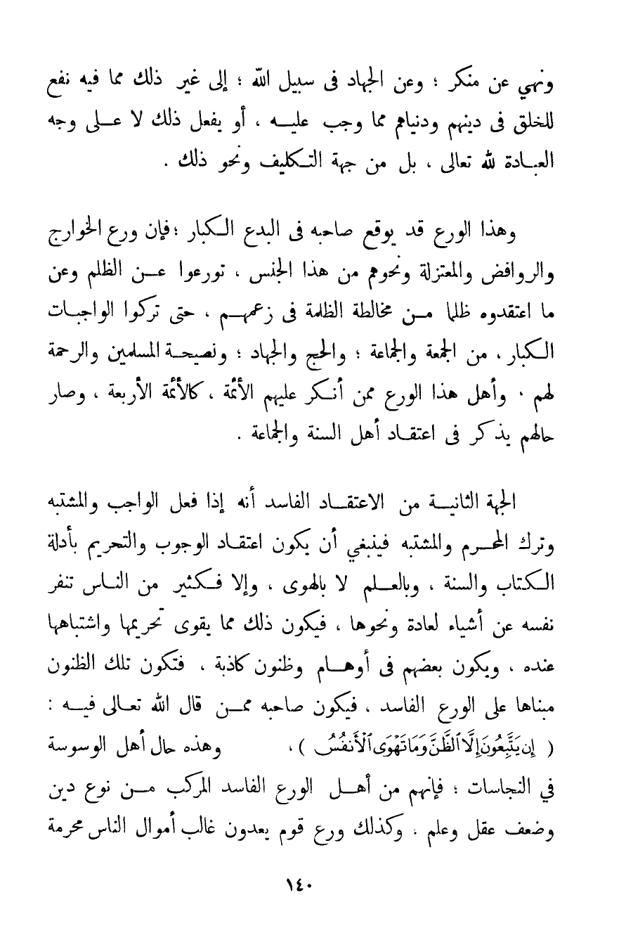 وَنَهْيٍ عَنْ مُنْكَرٍ؛ وَعَنْ الْجِهَادِ فِي سَبِيلِ اللَّهِ؛ إلَى غَيْرِ ذَلِكَ مِمَّا فِيهِ نَفْعٌ لِلْخَلْقِ فِي دِينِهِمْ وَدُنْيَاهُمْ مِمَّا وَجَبَ عَلَيْهِ أَوْ يَفْعَلُ ذَلِكَ لَا عَلَى وَجْهِ الْعِبَادَةِ لِلَّهِ تَعَالَى بَلْ مِنْ جِهَةِ التَّكْلِيفِ وَنَحْوِ ذَلِكَ. وَهَذَا الْوَرَعُ قَدْ يُوقِعُ صَاحِبَهُ فِي الْبِدَعِ الْكِبَارِ؛ فَإِنَّ وَرَعَ الْخَوَارِجِ وَالرَّوَافِضِ وَالْمُعْتَزِلَةِ وَنَحْوِهِمْ مِنْ هَذَا الْجِنْسِ تَوَرَّعُوا عَنْ الظُّلْمِ وَعَنْ مَا اعْتَقَدُوهُ ظُلْمًا مِنْ مُخَالَطَةِ الظَّلَمَةِ فِي زَعْمِهِمْ حَتَّى تَرَكُوا الْوَاجِبَاتِ الْكِبَارَ مِنْ الْجُمُعَة وَالْجَمَاعَةِ؛ وَالْحَجِّ وَالْجِهَادِ؛ وَنَصِيحَةِ الْمُسْلِمِينَ وَالرَّحْمَةِ لَهُمْ وَأَهْلُ هَذَا الْوَرَعِ مِمَّنْ أَنْكَرَ عَلَيْهِمْ الْأَئِمَّةُ كَالْأَئِمَّةِ الْأَرْبَعَةِ وَصَارَ حَالُهُمْ يُذْكَرُ فِي اعْتِقَادِ أَهْلِ السُّنَّةِ وَالْجَمَاعَةِ. الْجِهَةُ الثَّانِيَةُ مِنْ الِاعْتِقَادِ الْفَاسِدِ أَنَّهُ إذَا فَعَلَ الْوَاجِبَ وَالْمُشْتَبِهَ وَتَرَكَ الْمُحَرَّمَ وَالْمُشْتَبِهَ فَيَنْبَغِي أَنْ يَكُونَ اعْتِقَادُ الْوُجُوبِ وَالتَّحْرِيمِ بِأَدِلَّةِ الْكِتَابِ وَالسُّنَّةِ وَبِالْعِلْمِ لَا بِالْهَوَى وَإِلَّا فَكَثِيرٌ مِنْ النَّاسِ تَنْفِرُ نَفْسُهُ عَنْ أَشْيَاءَ لِعَادَةِ وَنَحْوِهَا فَيَكُونُ ذَلِكَ مِمَّا يُقَوِّي تَحْرِيمَهَا وَاشْتِبَاهَهَا عِنْدَهُ وَيَكُونُ بَعْضُهُمْ فِي أَوْهَامٍ وَظُنُونٍ كَاذِبَةٍ فَتَكُونُ تِلْكَ الظُّنُونُ مَبْنَاهَا عَلَى الْوَرَعِ الْفَاسِدِ فَيَكُونُ صَاحِبُهُ مِمَّنْ قَالَ اللَّهُ تَعَالَى فِيهِ: {إنْ يَتَّبِعُونَ إلَّا الظَّنَّ وَمَا تَهْوَى الْأَنْفُسُ} وَهَذِهِ حَالُ أَهْلِ الْوَسْوَسَةِ فِي النَّجَاسَاتِ؛ فَإِنَّهُمْ مِنْ أَهْلِ الْوَرَعِ الْفَاسِدِ الْمُرَكَّبِ مِنْ نَوْعِ دِينٍ وَضَعْفِ عَقْلٍ وَعِلْمٍ وَكَذَلِكَ وَرَعُ قَوْمٍ يُعِدُّونَ غَالِبَ أَمْوَالِ النَّاسِ مُحَرَّمَةً