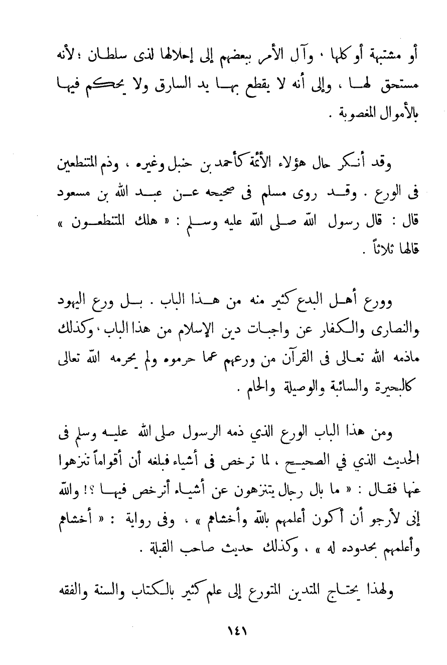 أَوْ مُشْتَبِهَةً أَوْ كُلَّهَا وَآلَ الْأَمْرُ بِبَعْضِهِمْ إلَى إحْلَالِهَا لِذِي سُلْطَانٍ؛ لِأَنَّهُ مُسْتَحِقٌّ لَهَا وَإِلَى أَنَّهُ لَا يَقْطَعُ بِهَا يَدَ السَّارِقِ وَلَا يَحْكُمُ فِيهَا بِالْأَمْوَالِ الْمَغْصُوبَةِ. وَقَدْ أَنْكَرَ حَالَ هَؤُلَاءِ الْأَئِمَّةِ كَأَحْمَدَ بْنِ حَنْبَلٍ وَغَيْرِهِ وَذَمَّ الْمُتَنَطِّعِينَ فِي الْوَرَعِ. وَقَدْ رَوَى مُسْلِمٌ فِي صَحِيحِهِ عَنْ عَبْدِ اللَّهِ بْنِ مَسْعُودٍ قَالَ: {قَالَ رَسُولُ اللَّهِ صَلَّى اللَّهُ عَلَيْهِ وَسَلَّمَ هَلَكَ الْمُتَنَطِّعُونَ قَالَهَا ثَلَاثًا} . وَوَرَعُ أَهْلِ الْبِدَعِ كَثِيرٌ مِنْهُ مِنْ هَذَا الْبَابِ. بَلْ وَرَعُ الْيَهُودِ وَالنَّصَارَى وَالْكُفَّارِ عَنْ وَاجِبَاتِ دِينِ الْإِسْلَامِ مِنْ هَذَا الْبَابِ وَكَذَلِكَ مَا ذَمَّهُ اللَّهُ تَعَالَى فِي الْقُرْآنِ مِنْ وَرَعِهِمْ عَمَّا حَرَّمُوهُ وَلَمْ يُحَرِّمْهُ اللَّهُ تَعَالَى كَالْبَحِيرَةِ وَالسَّائِبَةِ وَالْوَصِيلَةِ والحام. وَمِنْ هَذَا الْبَابِ الْوَرَعُ الَّذِي ذَمَّهُ الرَّسُولُ صَلَّى اللَّهُ عَلَيْهِ وَسَلَّمَ فِي الْحَدِيثِ الَّذِي فِي الصَّحِيحِ لَمَّا تَرَخَّصَ فِي أَشْيَاءَ فَبَلَغَهُ أَنَّ أَقْوَامًا تَنَزَّهُوا عَنْهَا فَقَالَ: " {مَا بَالُ رِجَالٍ يَتَنَزَّهُونَ عَنْ أَشْيَاءَ أَتَرَخَّصُ فِيهَا وَاَللَّهِ إنِّي لَأَرْجُو أَنْ أَكُونَ أَعْلَمَهُمْ بِاَللَّهِ وَأَخْشَاهُمْ وَفِي رِوَايَةٍ: أَخْشَاهُمْ وَأَعْلَمَهُمْ بِحُدُودِهِ لَهُ} " وَكَذَلِكَ حَدِيثُ صَاحِبِ الْقِبْلَةِ. وَلِهَذَا يَحْتَاجُ الْمُتَدَيِّنُ الْمُتَوَرِّعُ إلَى عِلْمٍ كَثِيرٍ بِالْكِتَابِ وَالسُّنَّةِ وَالْفِقْهِ