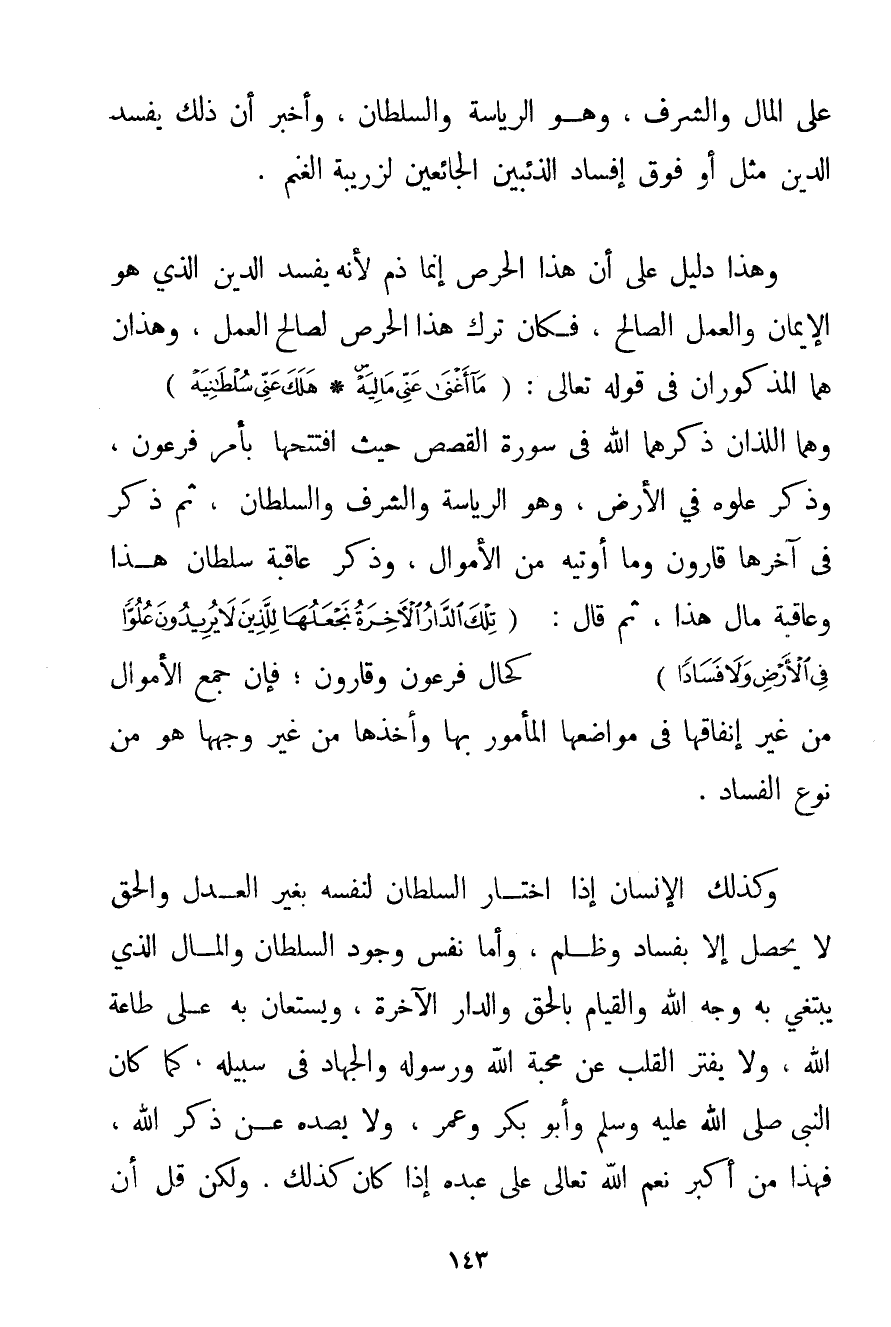 عَلَى الْمَالِ وَالشَّرَفِ وَهُوَ الرِّيَاسَةُ وَالسُّلْطَانُ وَأَخْبَرَ أَنَّ ذَلِكَ يُفْسِدُ الدِّينَ مِثْلَ أَوْ فَوْقَ إفْسَادِ الذِّئْبَيْنِ الْجَائِعَيْنِ لِزَرِيبَةِ الْغَنَمِ. وَهَذَا دَلِيلٌ عَلَى أَنَّ هَذَا الْحِرْصَ إنَّمَا ذُمَّ لِأَنَّهُ يُفْسِدُ الدِّينَ الَّذِي هُوَ الْإِيمَانُ وَالْعَمَلُ الصَّالِحُ فَكَانَ تَرْكُ هَذَا الْحِرْصِ لِصَالِحِ الْعَمَلِ وَهَذَانِ هُمَا الْمَذْكُورَانِ فِي قَوْله تَعَالَى {مَا أَغْنَى عَنِّي مَالِيَهْ} {هَلَكَ عَنِّي سُلْطَانِيَهْ} وَهُمَا اللَّذَانِ: ذَكَرَهُمَا اللَّهُ فِي سُورَةِ الْقَصَصِ حَيْثُ افْتَتَحَهَا بِأَمْرِ فِرْعَوْنَ وَذَكَرَ عُلُوَّهُ فِي الْأَرْضِ وَهُوَ الرِّيَاسَةُ وَالشَّرَفُ وَالسُّلْطَانُ ثُمَّ ذَكَرَ فِي آخِرِهَا قَارُونَ وَمَا أُوتِيَهُ مِنْ الْأَمْوَالِ وَذَكَرَ عَاقِبَةَ سُلْطَانِ هَذَا وَعَاقِبَةَ مَالِ هَذَا ثُمَّ قَالَ: {تِلْكَ الدَّارُ الْآخِرَةُ نَجْعَلُهَا لِلَّذِينَ لَا يُرِيدُونَ عُلُوًّا فِي الْأَرْضِ وَلَا فَسَادًا} كَحَالِ فِرْعَوْنَ وَقَارُونَ؛ فَإِنَّ جَمْعَ الْأَمْوَالِ مِنْ غَيْرِ إنْفَاقِهَا فِي مَوَاضِعِهَا الْمَأْمُورِ بِهَا وَأَخْذَهَا مِنْ غَيْرِ وَجْهِهَا هُوَ مِنْ نَوْعِ الْفَسَادِ. وَكَذَلِكَ الْإِنْسَانُ إذَا اخْتَارَ السُّلْطَانَ لِنَفْسِهِ بِغَيْرِ الْعَدْلِ وَالْحَقِّ لَا يَحْصُلُ إلَّا بِفَسَادِ وَظُلْمٍ وَأَمَّا نَفْسُ وُجُودِ السُّلْطَانِ وَالْمَالِ الَّذِي يُبْتَغَى بِهِ وَجْهُ اللَّهِ وَالْقِيَامُ بِالْحَقِّ وَالدَّارِ الْآخِرَةِ وَيُسْتَعَانُ بِهِ عَلَى طَاعَةِ اللَّهِ وَلَا يَفْتُرُ الْقَلْبُ عَنْ مَحَبَّةِ اللَّهِ وَرَسُولِهِ وَالْجِهَادِ فِي سَبِيلِهِ كَمَا كَانَ النَّبِيُّ صَلَّى اللَّهُ عَلَيْهِ وَسَلَّمَ وَأَبُو بَكْرٍ وَعُمَرُ وَلَا يَصُدُّهُ عَنْ ذِكْرِ اللَّهِ فَهَذَا مِنْ أَكْبَرِ نِعَمِ اللَّهِ تَعَالَى عَلَى عَبْدِهِ إذَا كَانَ كَذَلِكَ. وَلَكِنْ قَلَّ أَنْ