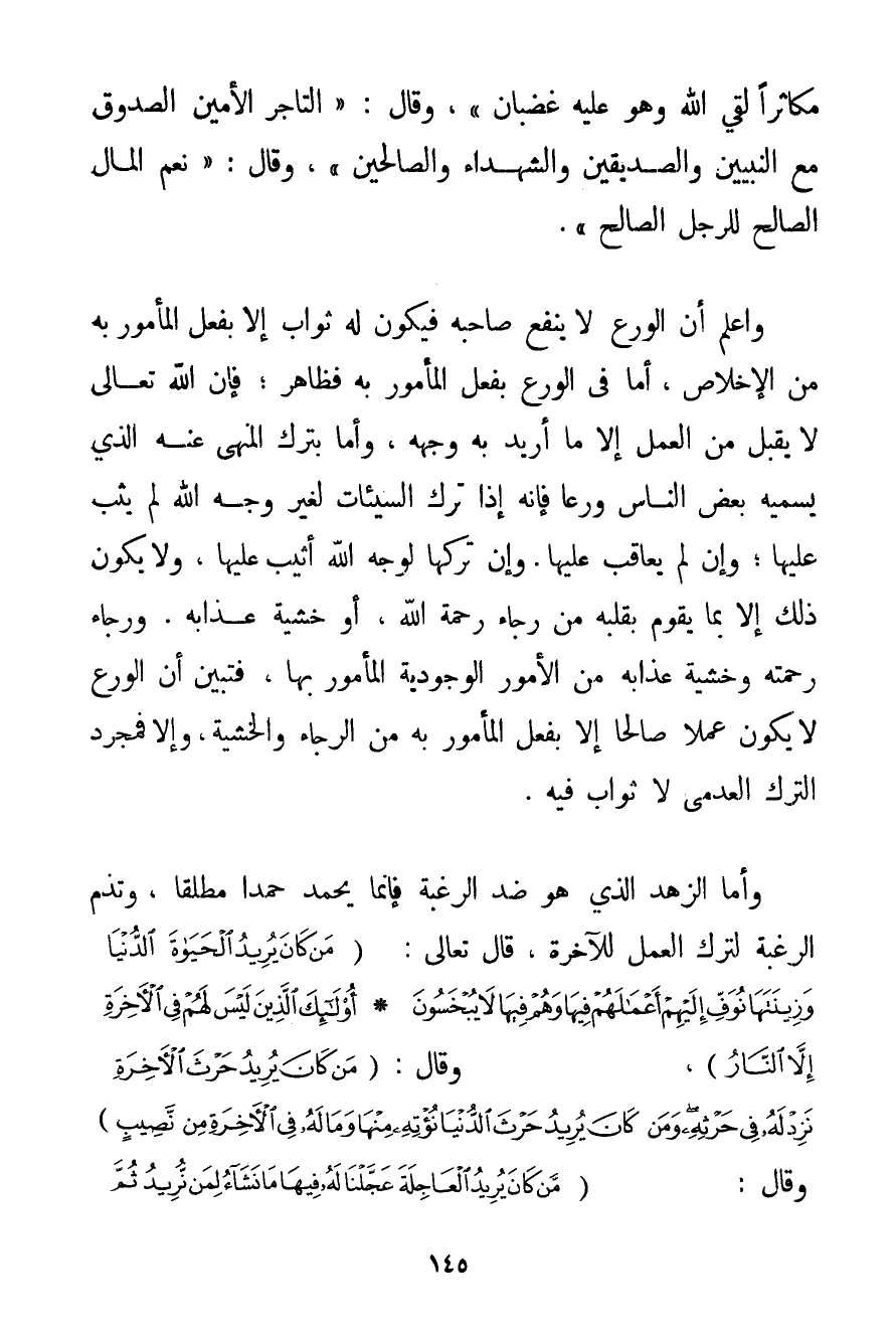 مُكَاثِرًا لَقِيَ اللَّهَ وَهُوَ عَلَيْهِ غَضْبَانُ} " وَقَالَ: " {التَّاجِرُ الْأَمِينُ الصَّدُوقُ مَعَ النَّبِيِّينَ وَالصِّدِّيقِينَ وَالشُّهَدَاءِ وَالصَّالِحِينَ} " وَقَالَ: " {نِعْمَ الْمَالُ الصَّالِحُ لِلرَّجُلِ الصَّالِحِ} ". وَاعْلَمْ أَنَّ الْوَرَعَ لَا يَنْفَعُ صَاحِبَهُ فَيَكُونُ لَهُ ثَوَابٌ إلَّا بِفِعْلِ الْمَأْمُورِ بِهِ مِنْ الْإِخْلَاصِ أَمَّا فِي الْوَرَعِ بِفِعْلِ الْمَأْمُورِ بِهِ فَظَاهِرٌ؛ فَإِنَّ اللَّهَ تَعَالَى لَا يَقْبَلُ مِنْ الْعَمَلِ إلَّا مَا أُرِيدَ بِهِ وَجْهُهُ وَأَمَّا بِتَرْكِ الْمَنْهِيِّ عَنْهُ الَّذِي يُسَمِّيهِ بَعْضُ النَّاسِ وَرَعًا فَإِنَّهُ إذَا تَرَكَ السَّيِّئَاتِ لِغَيْرِ وَجْهِ اللَّهِ لَمْ يُثَبْ عَلَيْهَا؛ وَإِنْ لَمْ يُعَاقَبْ عَلَيْهَا. وَإِنْ تَرَكَهَا لِوَجْهِ اللَّهِ أُثِيبَ عَلَيْهَا وَلَا يَكُونُ ذَلِكَ إلَّا بِمَا يَقُومُ بِقَلْبِهِ مِنْ رَجَاءِ رَحْمَةِ اللَّهِ أَوْ خَشْيَةِ عَذَابِهِ. وَرَجَاءُ رَحْمَتِهِ وَخَشْيَةُ عَذَابِهِ مِنْ الْأُمُورِ الْوُجُودِيَّةِ الْمَأْمُورِ بِهَا فَتَبَيَّنَ أَنَّ الْوَرَعَ لَا يَكُونُ عَمَلًا صَالِحًا إلَّا بِفِعْلِ الْمَأْمُورِ بِهِ مِنْ الرَّجَاءِ وَالْخَشْيَةِ وَإِلَّا فَمُجَرَّدُ التَّرْكِ الْعَدَمِيِّ لَا ثَوَابَ فِيهِ. وَأَمَّا الزُّهْدُ الَّذِي هُوَ ضِدُّ الرَّغْبَةِ فَإِنَّمَا يُحْمَدُ حَمْدًا مُطْلَقًا وَتُذَمُّ الرَّغْبَةُ لِتَرْكِ الْعَمَلِ لِلْآخِرَةِ قَالَ تَعَالَى: {مَنْ كَانَ يُرِيدُ الْحَيَاةَ الدُّنْيَا وَزِينَتَهَا نُوَفِّ إلَيْهِمْ أَعْمَالَهُمْ فِيهَا وَهُمْ فِيهَا لَا يُبْخَسُونَ} {أُولَئِكَ الَّذِينَ لَيْسَ لَهُمْ فِي الْآخِرَةِ إلَّا النَّارُ} وَقَالَ: {مَنْ كَانَ يُرِيدُ حَرْثَ الْآخِرَةِ نَزِدْ لَهُ فِي حَرْثِهِ وَمَنْ كَانَ يُرِيدُ حَرْثَ الدُّنْيَا نُؤْتِهِ مِنْهَا وَمَا لَهُ فِي الْآخِرَةِ مِنْ نَصِيبٍ} وَقَالَ: {مَنْ كَانَ يُرِيدُ الْعَاجِلَةَ عَجَّلْنَا لَهُ فِيهَا مَا نَشَاءُ