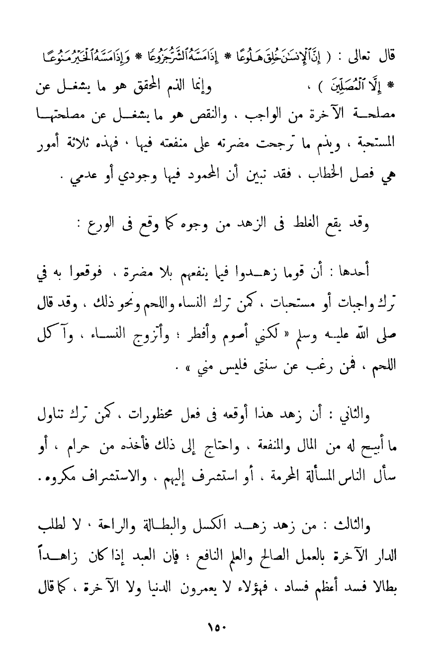 قَالَ تَعَالَى: {إنَّ الْإِنْسَانَ خُلِقَ هَلُوعًا} {إذَا مَسَّهُ الشَّرُّ جَزُوعًا} {وَإِذَا مَسَّهُ الْخَيْرُ مَنُوعًا} {إلَّا الْمُصَلِّينَ} وَإِنَّمَا الذَّمُّ الْمُحَقَّقُ هُوَ مَا يَشْغَلُ عَنْ مَصْلَحَةِ الْآخِرَةِ مِنْ الْوَاجِبِ وَالنَّقْصُ هُوَ مَا يَشْغَلُ عَنْ مَصْلَحَتِهَا الْمُسْتَحَبَّةِ وَيُذَمُّ مَا تَرَجَّحَتْ مَضَرَّتُهُ عَلَى مَنْفَعَتِهِ فِيهَا فَهَذِهِ ثَلَاثَةُ أُمُورٍ هِيَ فَصْلُ الْخِطَابِ فَقَدْ تَبَيَّنَ أَنَّ الْمَحْمُودَ فِيهَا وُجُودِيٌّ أَوْ عَدَمِيٌّ. وَقَدْ يَقَعُ الْغَلَطُ فِي الزُّهْدِ مِنْ وُجُوهٍ كَمَا وَقَعَ فِي الْوَرَعِ: أَحَدُهَا: أَنَّ قَوْمًا زَهِدُوا فِيمَا يَنْفَعُهُمْ بِلَا مَضَرَّةٍ فَوَقَعُوا بِهِ فِي تَرْكِ وَاجِبَاتٍ أَوْ مُسْتَحَبَّاتٍ كَمَنْ تَرَكَ النِّسَاءَ وَاللَّحْمَ وَنَحْوَ ذَلِكَ وَقَدْ {قَالَ صَلَّى اللَّهُ عَلَيْهِ وَسَلَّمَ لَكِنِّي أَصُومُ وَأُفْطِرُ؛ وَأَتَزَوَّجُ النِّسَاءَ وَآكُلُ اللَّحْمَ فَمَنْ رَغِبَ عَنْ سُنَّتِي فَلَيْسَ مِنِّي} ". وَالثَّانِي: أَنَّ زُهْدَ هَذَا أَوْقَعَهُ فِي فِعْلِ مَحْظُورَاتٍ كَمَنْ تَرَكَ تَنَاوُلَ مَا أُبِيحَ لَهُ مِنْ الْمَالِ وَالْمَنْفَعَةِ وَاحْتَاجَ إلَى ذَلِكَ فَأَخَذَهُ مِنْ حَرَامٍ أَوْ سَأَلَ النَّاسَ الْمَسْأَلَةَ الْمُحَرَّمَةَ أَوْ اسْتَشْرَفَ إلَيْهِمْ وَالِاسْتِشْرَافُ مَكْرُوهٌ. وَالثَّالِثُ: مَنْ زَهِدَ زُهْدَ الْكَسَلِ وَالْبَطَالَةِ وَالرَّاحَةِ لَا لِطَلَبِ الدَّارِ الْآخِرَةِ بِالْعَمَلِ الصَّالِحِ وَالْعِلْمِ النَّافِعِ؛ فَإِنَّ الْعَبْدَ إذَا كَانَ زَاهِدًا بَطَّالًا فَسَدَ أَعْظَمَ فَسَادٍ فَهَؤُلَاءِ لَا يُعَمِّرُونَ الدُّنْيَا وَلَا الْآخِرَةَ كَمَا قَالَ